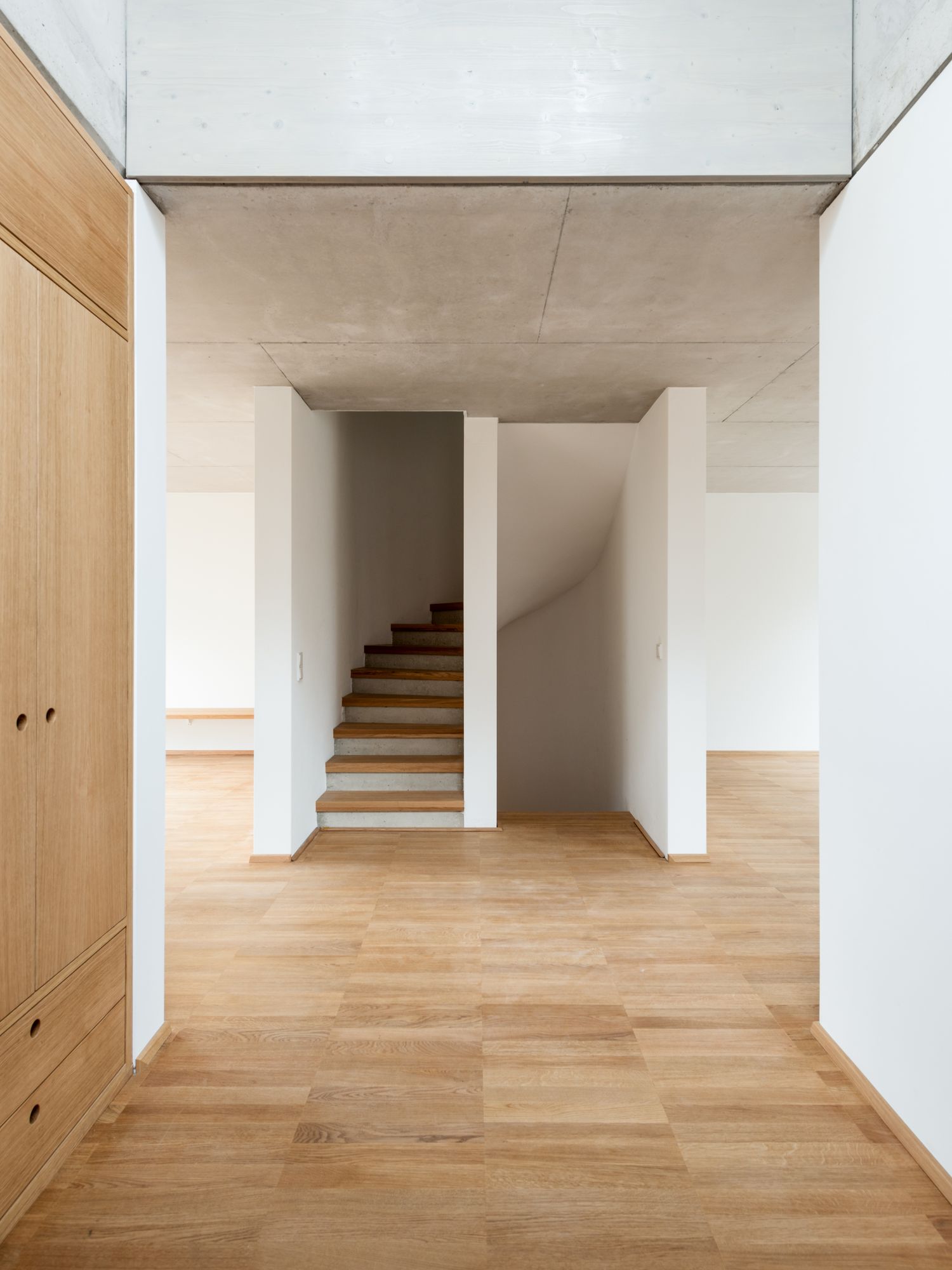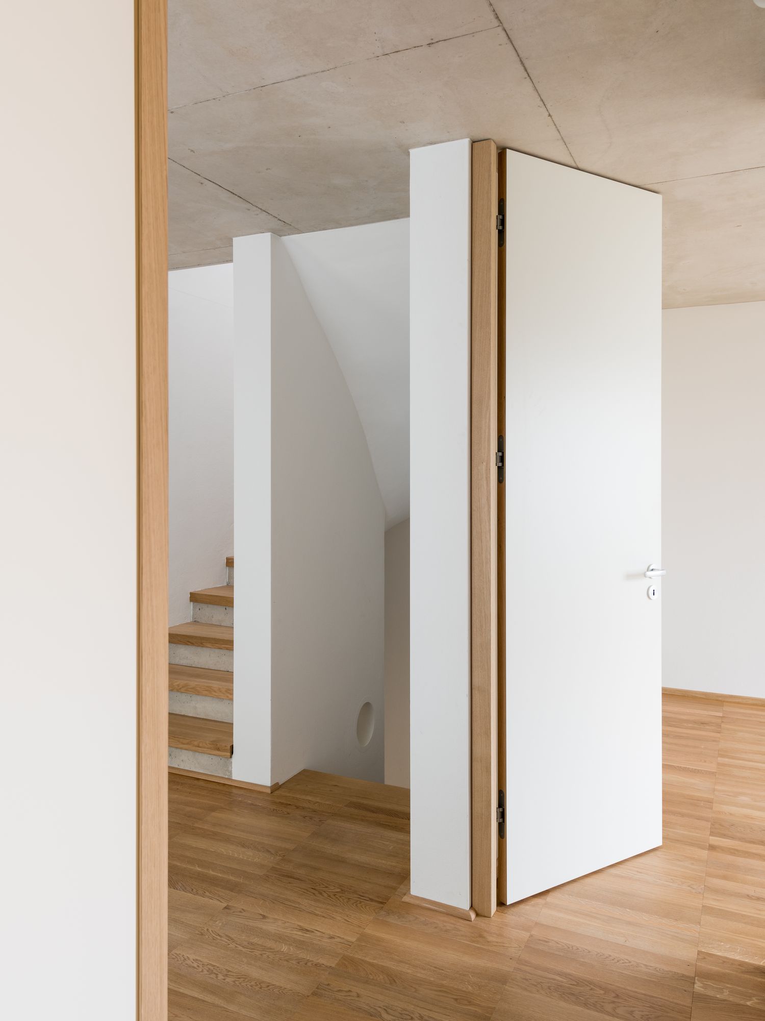 Semi-detached House is a minimal residence located in Munich, Germany, designed by FAM Architekten in collaboration with Studio Weitz. This semi-detached house with a round window and a gable roof lies in a new housing estate in the suburbs of Munich. Its rigorous symmetric structure allows an optimized utilization of the few space within the three-storey house. The entrance is located in the middle axis, followed by an air space which connects the upper floor with the ground floor. The staircase is situated in the same alignment. The massive body of exposed concrete, in which the stairs seem to be subtracted, acts as stiffening core.
