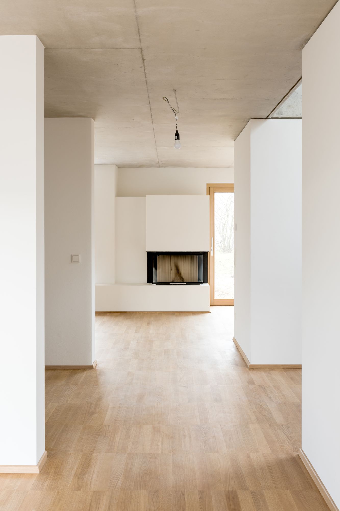 A window above the main door enlightens the center of the house. The interior is thought out till the hidden lamp on the stairway and the sculptural body of the chimney that devolves into a seating area. The puristic but warm materialization creates a spacious feeling within the modest construction. Individual carpenter works impart uniqueness to the prototype-like structure. Its design differs from its prefabricated anthracite neighbor buildings by its large-sized wooden windows, the reduced roof overhang and the fine stucco which create a calm expression.