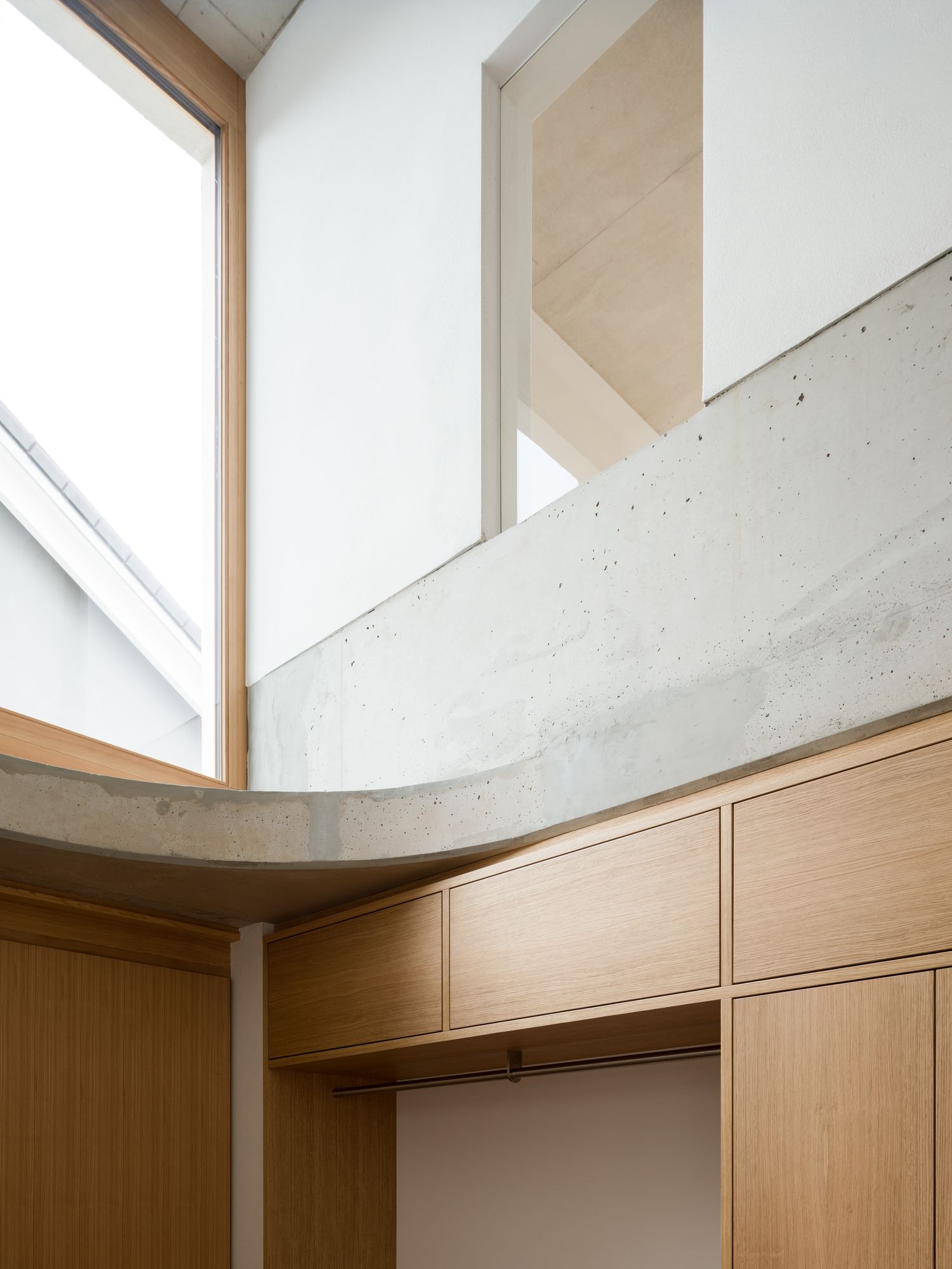 On the ground floor the internal corridor opens up to the living room to the west and the kitchen and dining to the east, creating an inner enfilade. On the first floor the symmetrical shape turns into a cross-shaped division that accommodates two children rooms, a big bathroom and workspace. On the roof floor the distribution space turns into an open circulation of the parents realm: a bathroom, a small retreat and a bedroom located under the ridge and lightened by a big round window. The absence of thresholds in the floor of wooden boards provides an open circulation between the rooms. Also the ceiling of exposed concrete is continuous, whereby the individual rooms appear like white cubes set into a vast envelope.