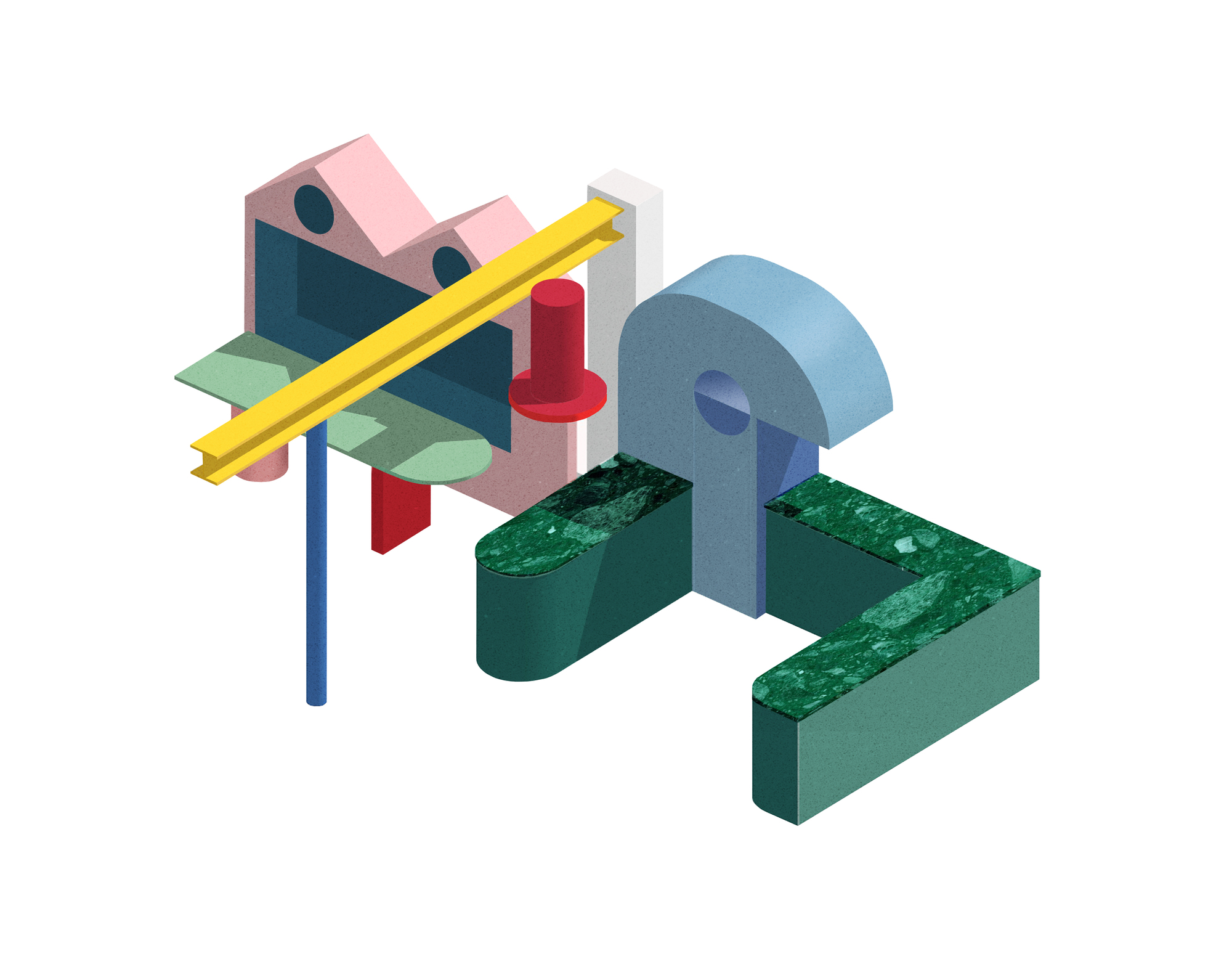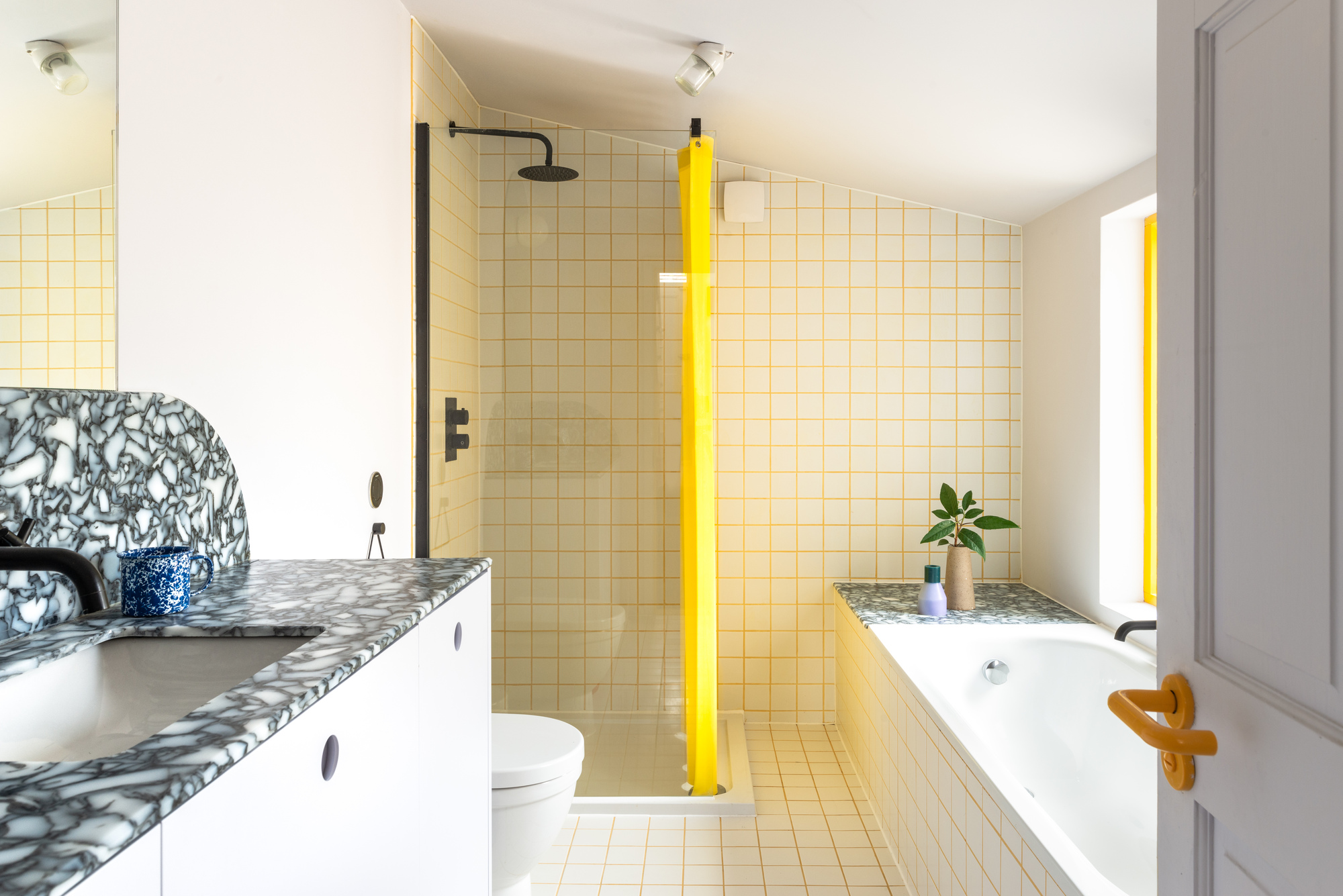 The client, Tamsin Chislett, is co-founder of Onloan, an online service based on lending fashion rather than consuming it. These ideas of borrowing and reuse were carried through in the project, with every material being borrowed, reused and reframed for a new purpose. Office S&M chose materials with a previous existence and a story to tell: surfaces made from melted, discarded milk bottles and chopping boards, to form shiny, luxurious marbled worktops in the WC, bathroom and utility room; green terrazzo for the kitchen is made from marble chips and offcuts; and light pendants from recycled brick grog.