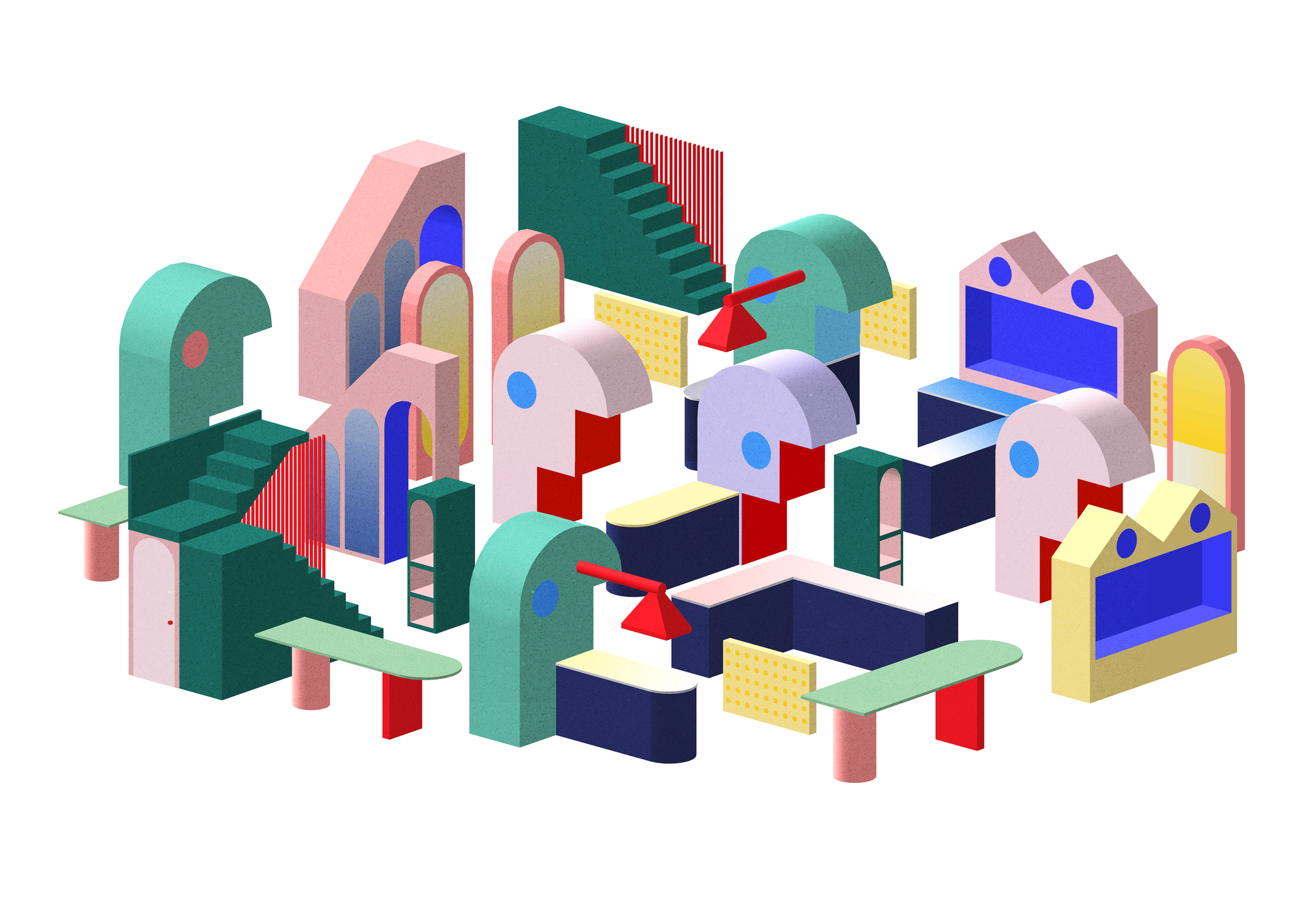 The cooking and dining area incorporates plinths to climb, soft surfaces to nestle in, tiny spaces to crawl into. Tropical colours and tinted mirrors are used throughout to reflect and frame views, distorting scale and suggesting worlds beyond.