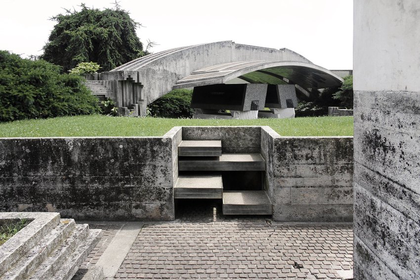 Scarpa himself is buried adjacent to the Brion sanctuary. Several discrete elements comprise the Brion family burial site: a sloped concrete enclosing wall, two distinct entrances, a small chapel, two covered burial areas (the arcosolium for Giuseppe and Onorina Brion, and one for other family members), a dense grove of cypresses, a Prato (lawn), and a private meditation/viewing pavilion, separated from the main Prato by a separate and locked entrance, and a heavily vegetated reflecting pool.