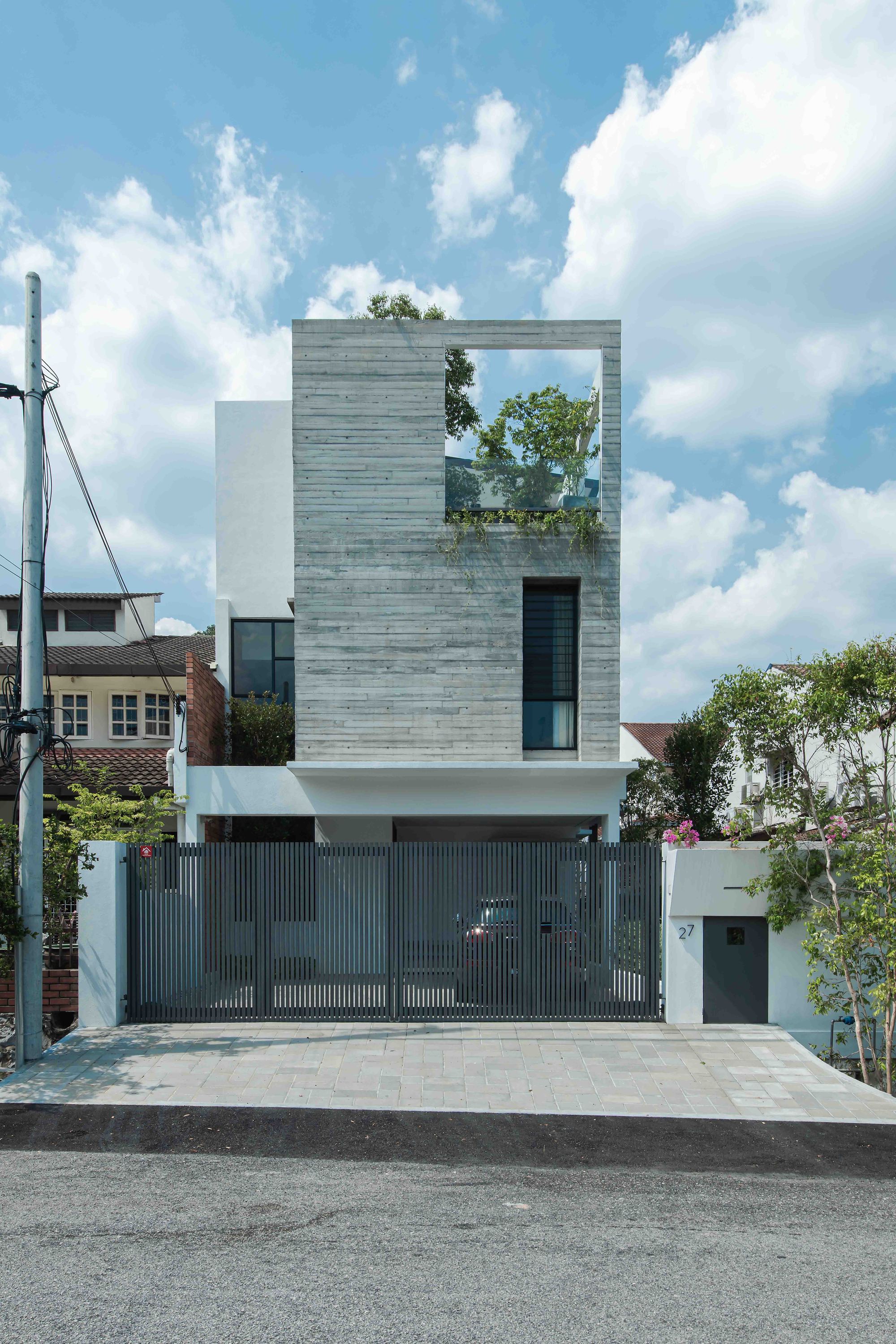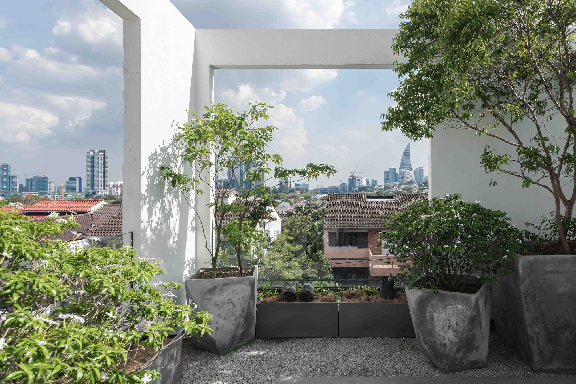 The building is extended along its southerly front facade with a board-marked concrete wall that sits over the car porch. This new façade wraps around the master bedroom and extends upwards to enclose a roof terrace on the top floor. Here, the concrete wall is punched with large rectangular openings that frame views out to the neighbourhood and the city’s skyline. Some privacy and shading from the afternoon sun in the terrace are provided by multiple trees planted in oversized planters brought up and put in place by a crane during construction.