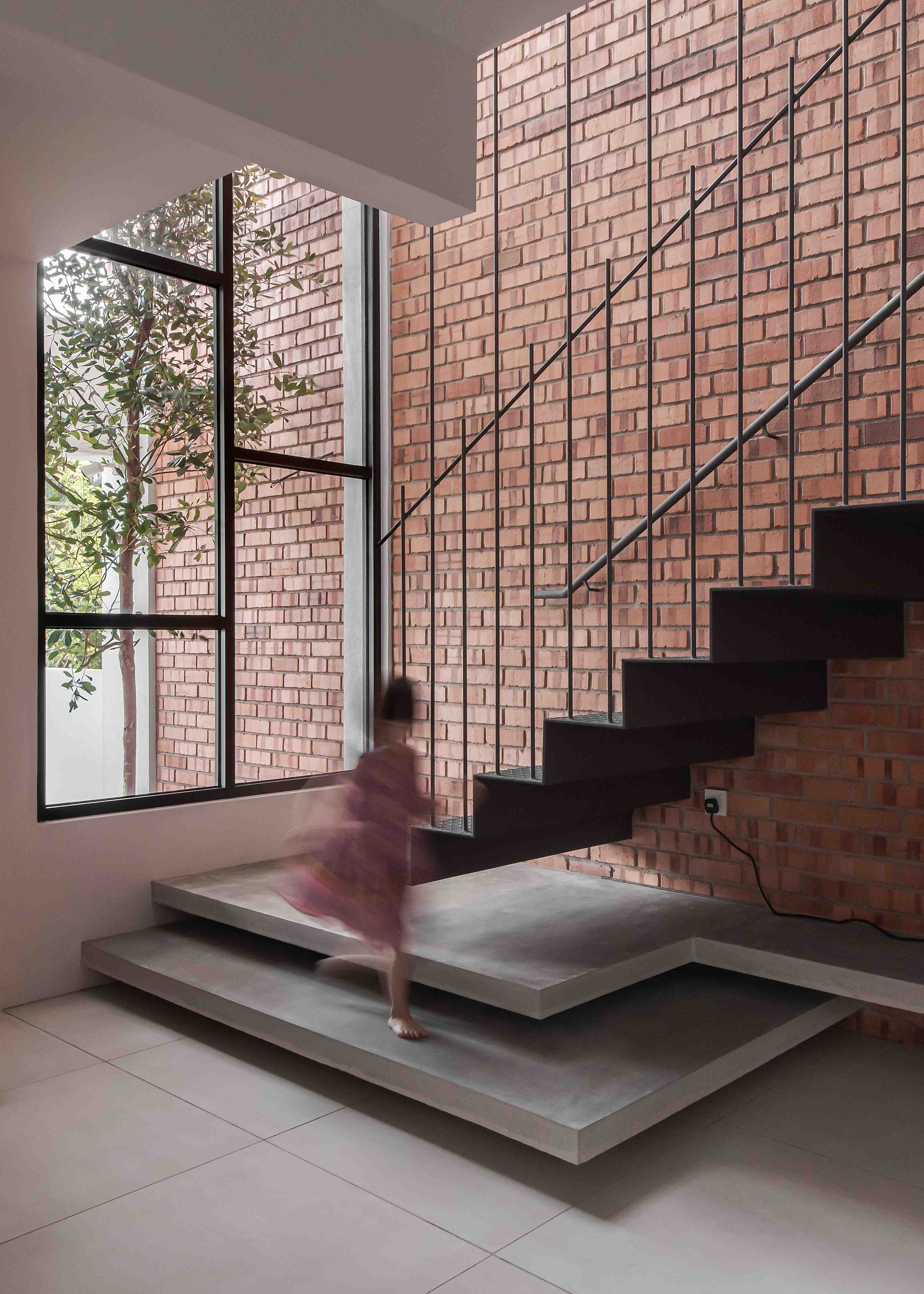 The tactility and rawness of the exterior façade is felt inside the house. The material palette is softly raw and grey with the use of bricks, steel, and smooth exposed concrete against the backdrop of white walls. Upon entering, one is greeted by a staircase along a brick wall that extends upwards to the top of the house. The original staircase was removed and replaced with one that is fashioned out of folded steel plates hanging from above on steel rods. It sits in a new location within the house, connects the different levels in a series of flights that turns around the core of the house. This new staircase allows for a better flow of spaces and improved daylighting levels. Hovering close to the ground are a series of floating concrete steps snaking around the living area in the quest for spatial continuity. It starts off as part of the main staircase, then connects the different levels of the living and dining areas and transform to become benches.