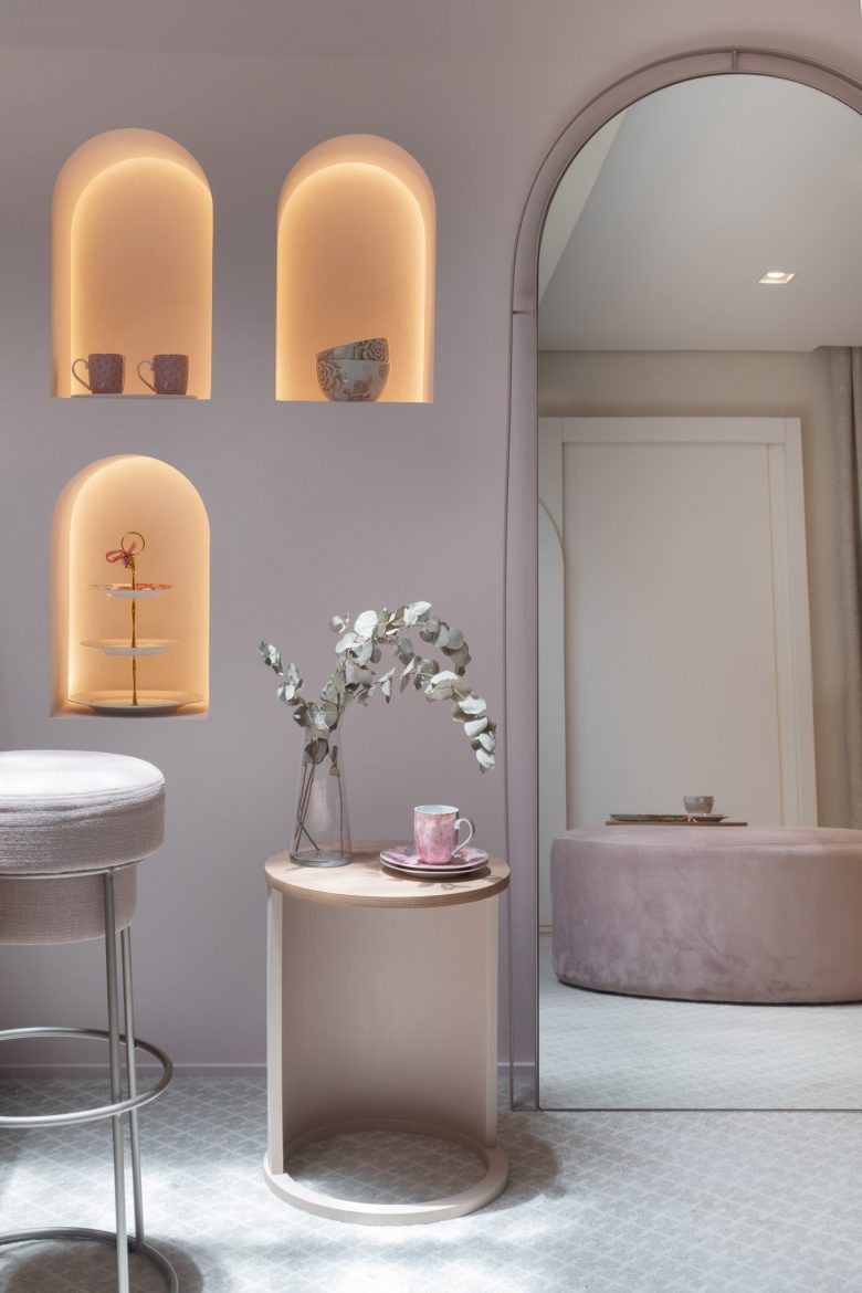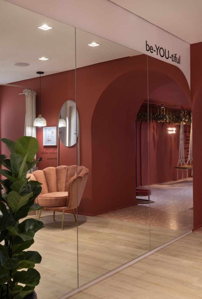 Após o coração da romã, chegamos aos provadores – pensados para a melhor experiência possível nesse local, onde nos conectamos com nossa essência. A Romã segue uma sequência de cores e de arcos que trazem sensações diversas para quem percorre a loja e se conecta com a marca.