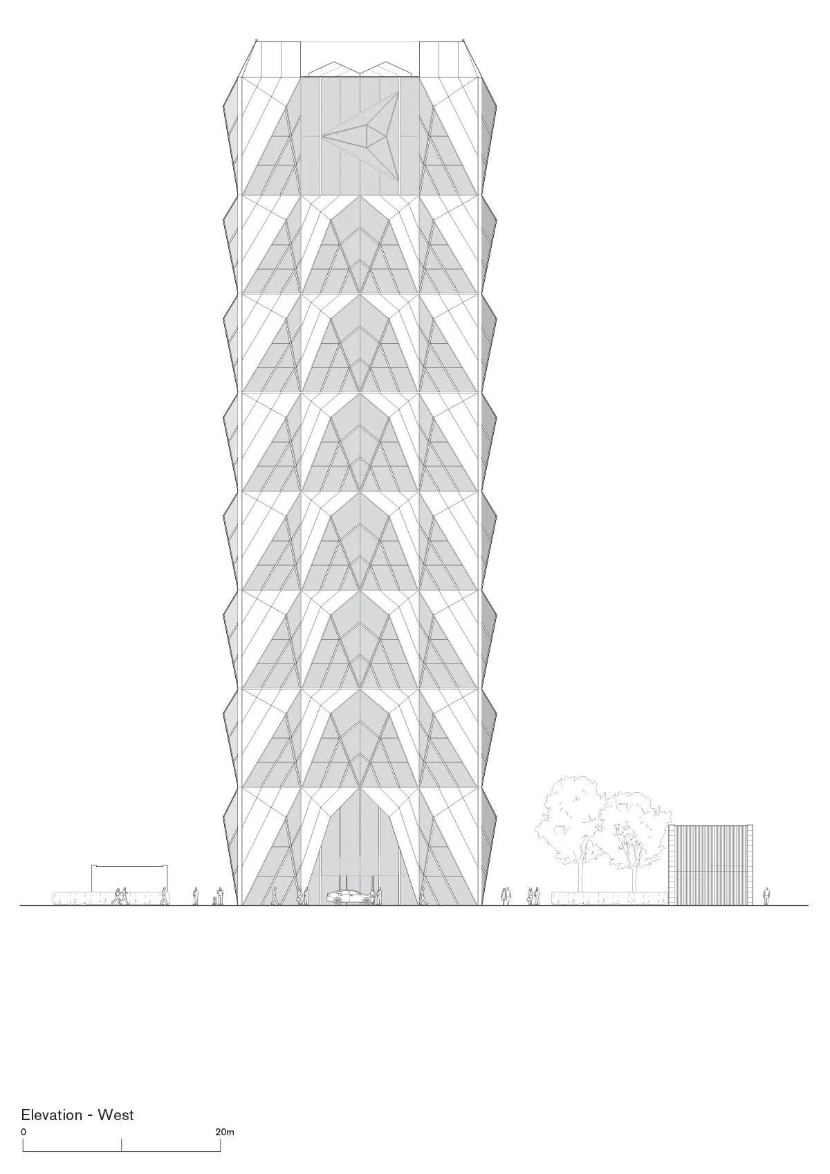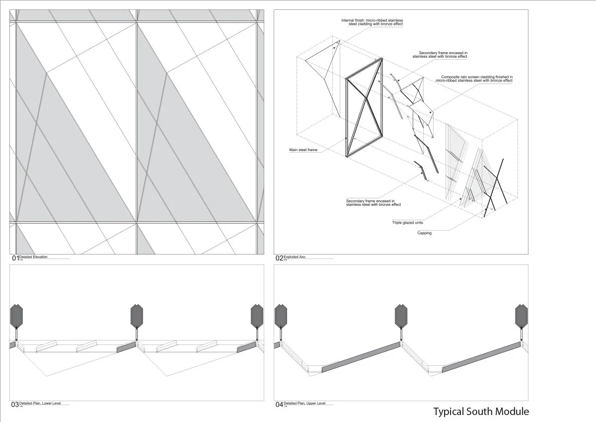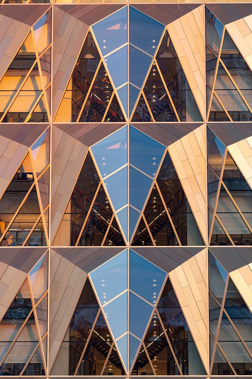 foster + partners가 설계한 RCC본사 빌딩은 구리로 된 파사드 입면을 갖고 있습니다. 이 독특한 입면은 두가지 요소를 결합, 디자인한 결과물입니다. 하나는 회사의 새로운 브랜딩을 위한 로고와 구리의 결정구조 형태인 삼각형태를 모티브로 만들게 되었습니다. 구리로 만들어진 외피 또한 회사의 방향성을 적나라하게 보여주는 디자인 요소입니다.