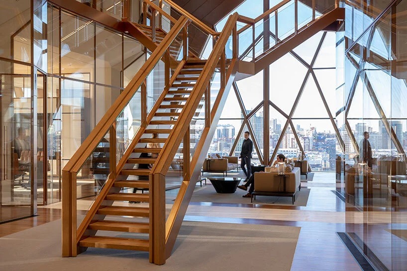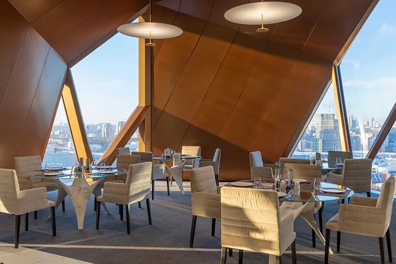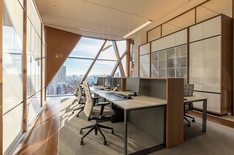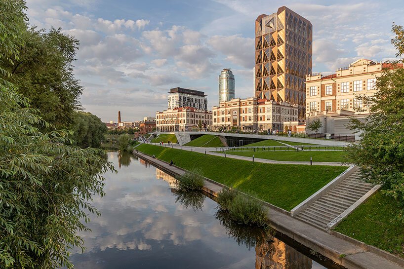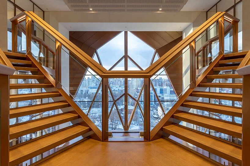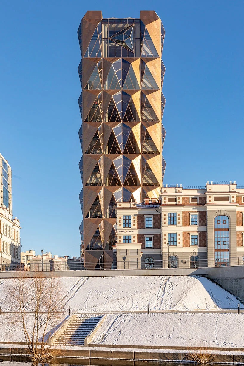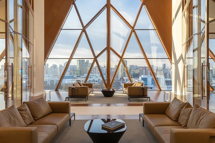 foster + partners wraps its RCC headquarters in russia with a faceted copper facade. this distinctive element celebrates the russian copper company‘s expertise as one of the world’s leading producers of copper. the building’s triangulated language draws inspiration from the crystal lattice structure of copper while the crown of the building integrates RCC’s new logo, a rebranding which has, in turn, been inspired by the architecture. in developing the tower, the design team turned away from the conventional large, communal workspace organization, seeking instead to reinvent the headquarters as a ‘house for staff.’