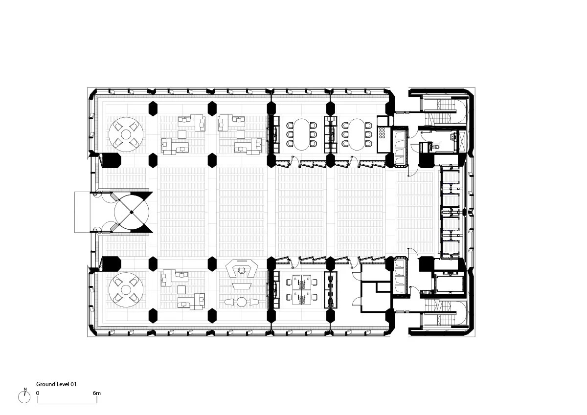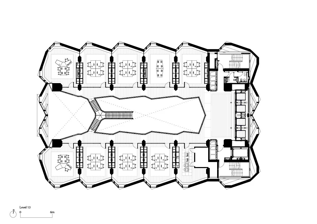 as a house for staff, foster + partners’ RCC headquarters in russia hosts rooms organized at a more intimate, domestic scale. the practice’s workplace consultancy group analyzed the client’s operations and helped to devise the innovative modular system for these rooms. this was then developed with the in-house engineering teams to enable rapid construction and ensure ideal levels of natural daylight for concentrated work. each two-story module comprises a pair of offices, stacked one on top of the other — this is expressed externally through the double-store cladding module.