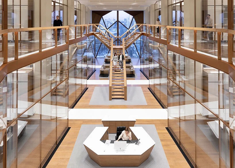 foster + partners wraps its RCC headquarters in russia with a faceted copper facade. this distinctive element celebrates the russian copper company‘s expertise as one of the world’s leading producers of copper. the building’s triangulated language draws inspiration from the crystal lattice structure of copper while the crown of the building integrates RCC’s new logo, a rebranding which has, in turn, been inspired by the architecture. in developing the tower, the design team turned away from the conventional large, communal workspace organization, seeking instead to reinvent the headquarters as a ‘house for staff.’