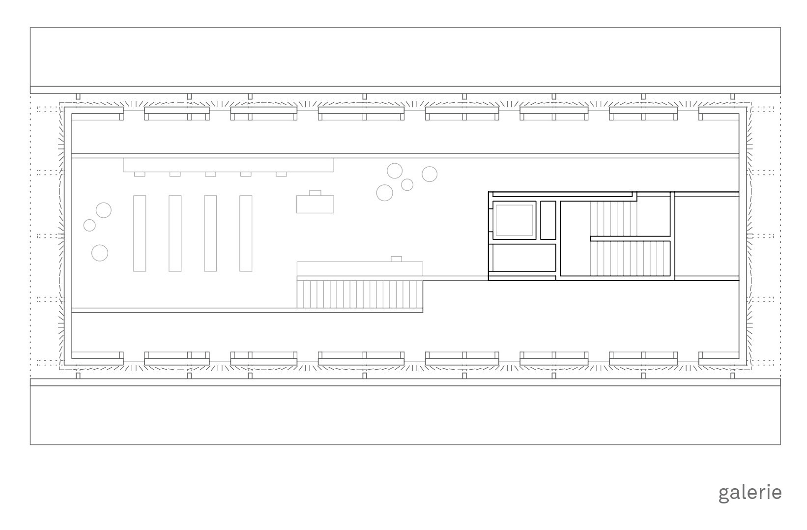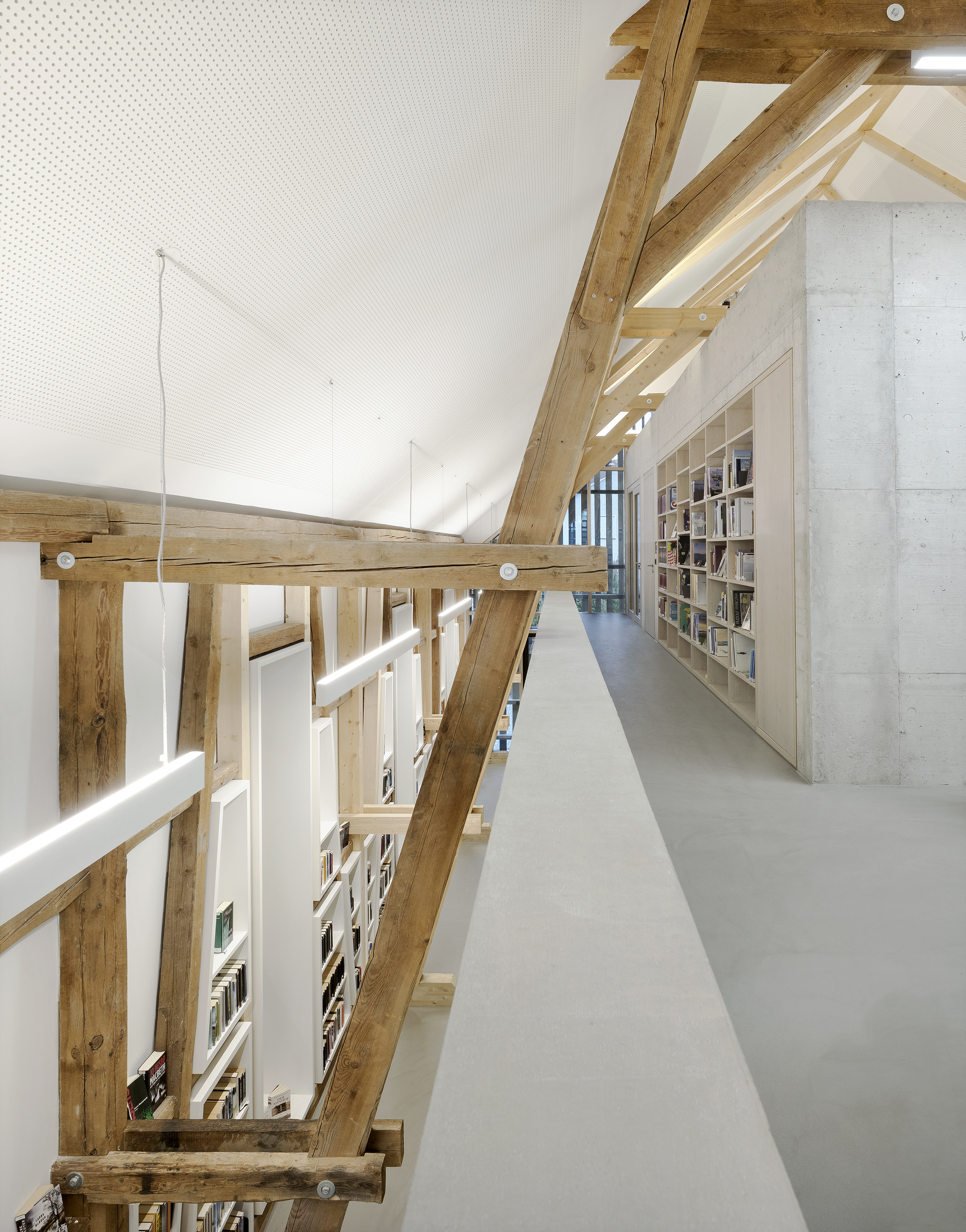 The core emerges from the concrete base, connecting the two upper floors within, and its open gallery creates a tangibly different spatial experience. Nonetheless, the familiar saddleback roof, with its historical timber trussing that projects out far beyond the facade, remains present in the space – and can now be perceived from many perspectives.