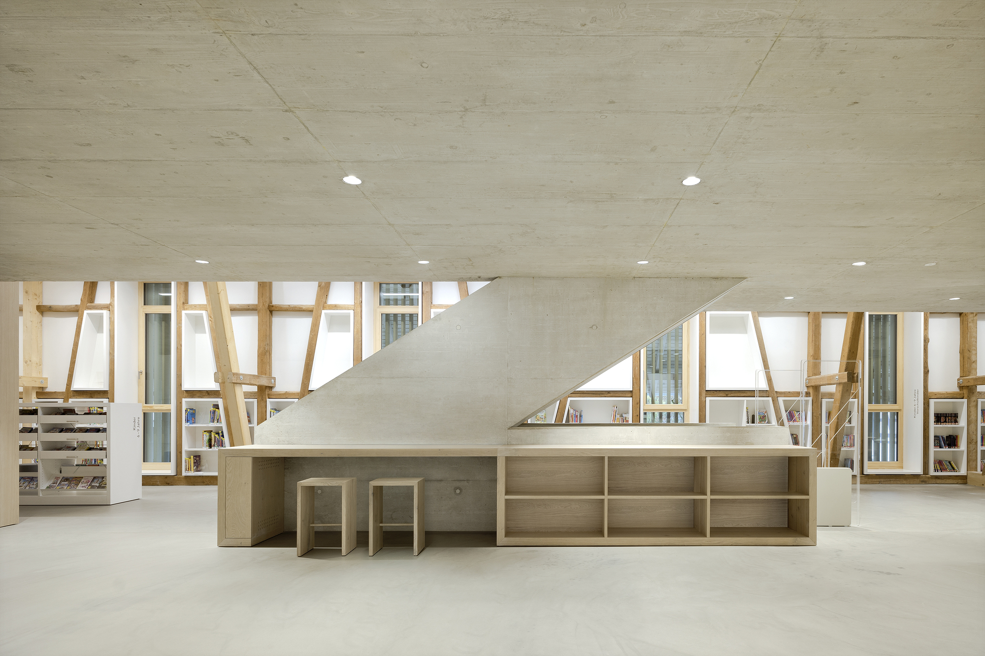 With a lobby that is open to above, the building welcomes its visitors and encourages communication and encounters. The ground floor can be put to a variety of uses: as a dividable multipurpose room, an exhibition space, and a 24-hour library. The library on the first floor, with its media and magazine gallery and its reading stations, offers surprisingly open views though the entire building. Here in particular, the old and the new enter into an exciting dialogue. The balance of past and present becomes the building’s special quality, not only from the outside but especially from the inside.