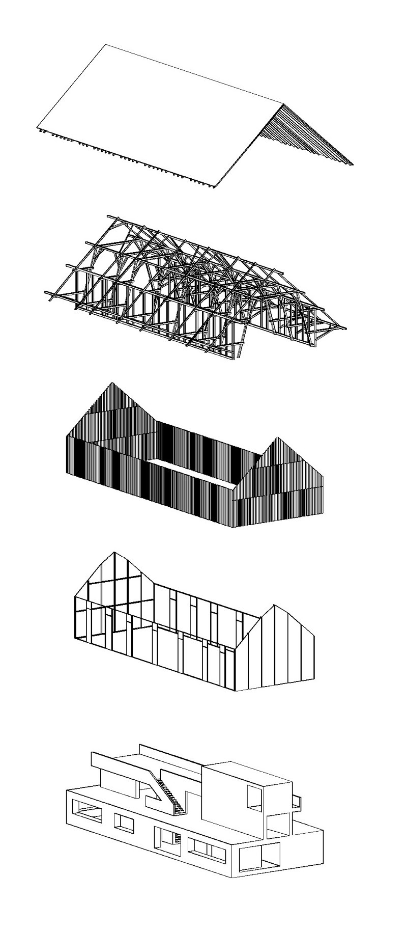 재해석된 지역건축문화는 지역건축 어휘를 사용하되, 현재 거주공간에도 유효한 건축환경을 만드는 것을 목표로 합니다. 바탕이 되는 콘크리트는 주요한 구조와 공간을 지탱하며 재사용된 목재가 최종 박공지붕으로 마무리 됩니다.