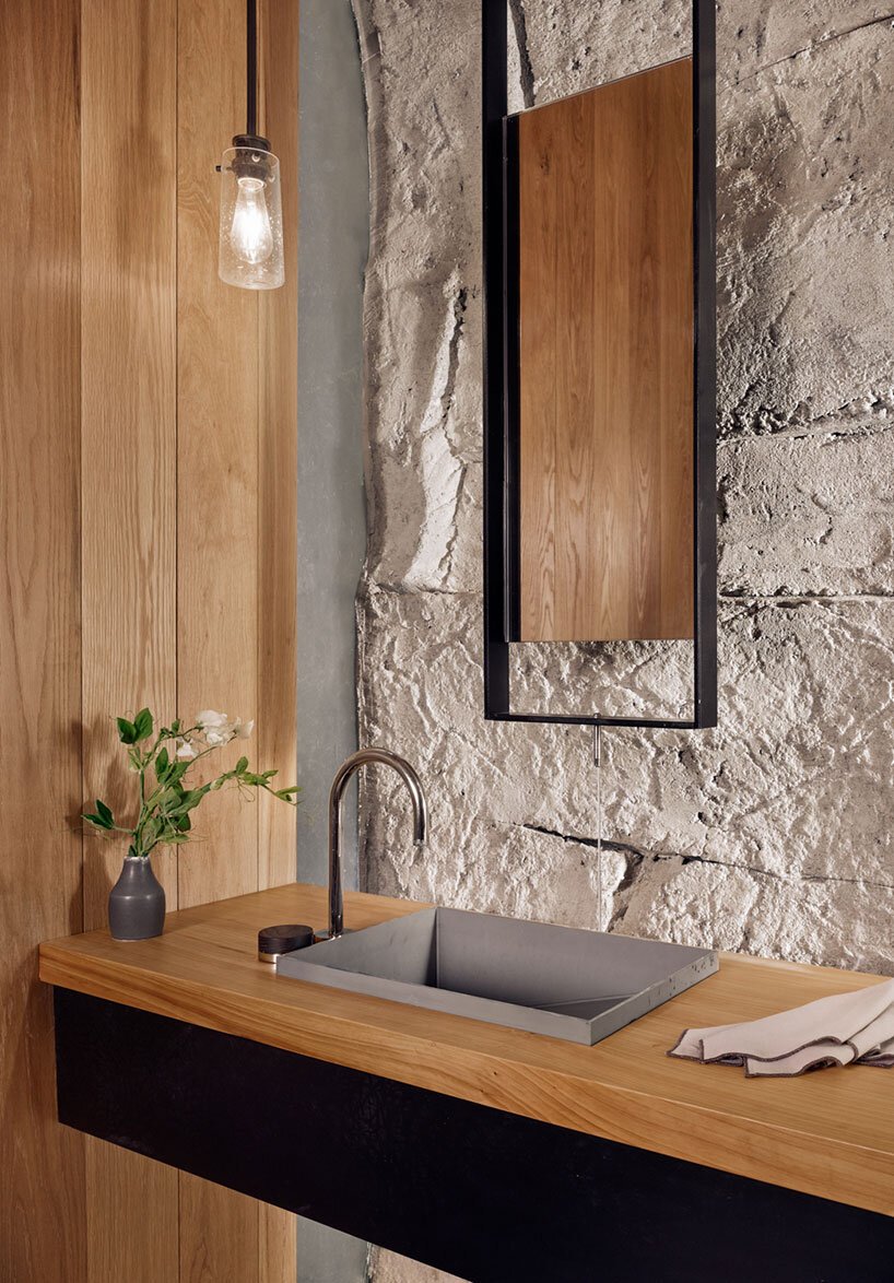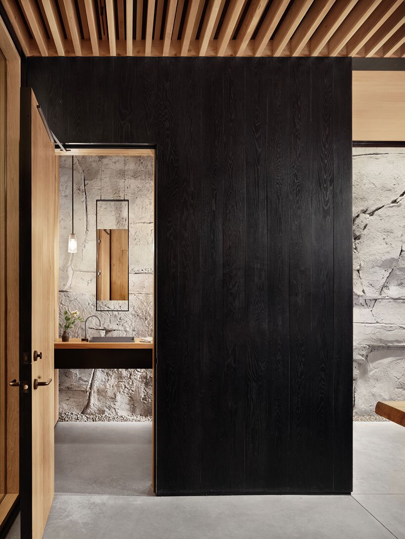 inside clayton korte’s wine cave, a study of white oak, both raw and ebonized, mixes with vertical grain douglas fir to panel the walls and dropped ceilings as a warm contrast to more rugged concrete and stone that surrounds. custom insulated and thermally broken steel and wood windows provide separation between the interior and exterior, as well as the entertaining lounge and the chilled cellar. reclaimed cedar was salvaged and milled for live-edged countertop surfaces for the tasting bar and the floating restroom vanity. lead architect brian korte comments: ‘it’s like a ship in a bottle. the components of the wood insert are deliberately kept away from the existing cave walls so that the room remains adaptable.‘