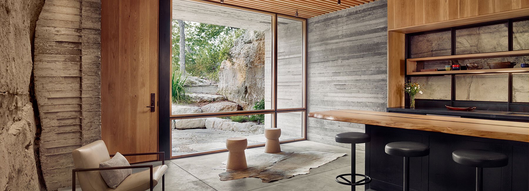 located at the eastern edge of the texas hill country, this private wine cave by clayton korte is nestled into a secluded bend of the blanco river. excavated into the north face of a solid limestone hillside, this shotcrete lined tube is protected on the east and west by tall oak and elm trees, allowing it to nearly disappear within the native landscape. the unassuming exterior entry court reveals a bit of mystery as it provides just a glimpse of what lies within. heavy limestone boulders, collected from the excavation, and lush vegetation further camouflage the entry as you descend into the mouth of the cave.