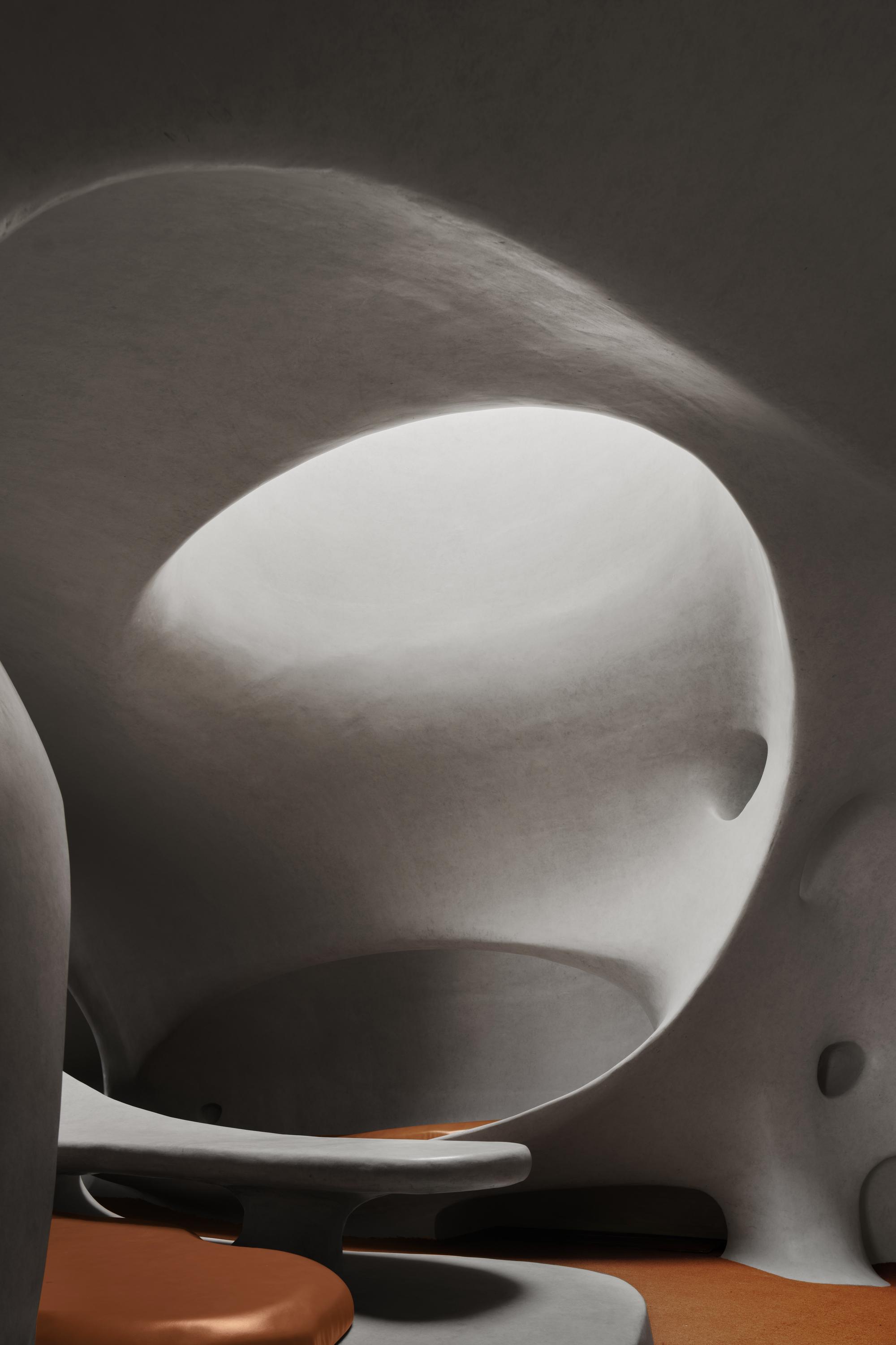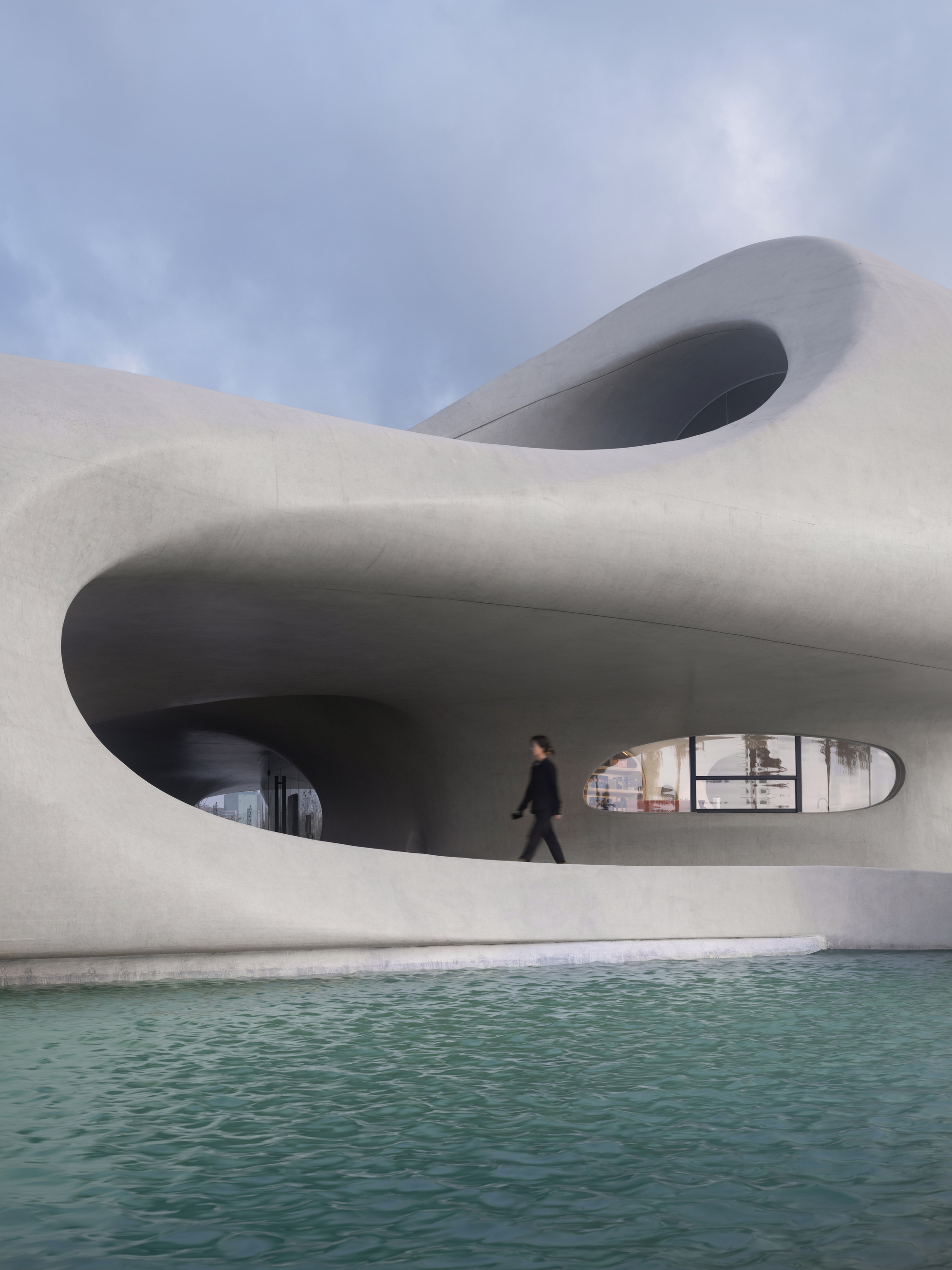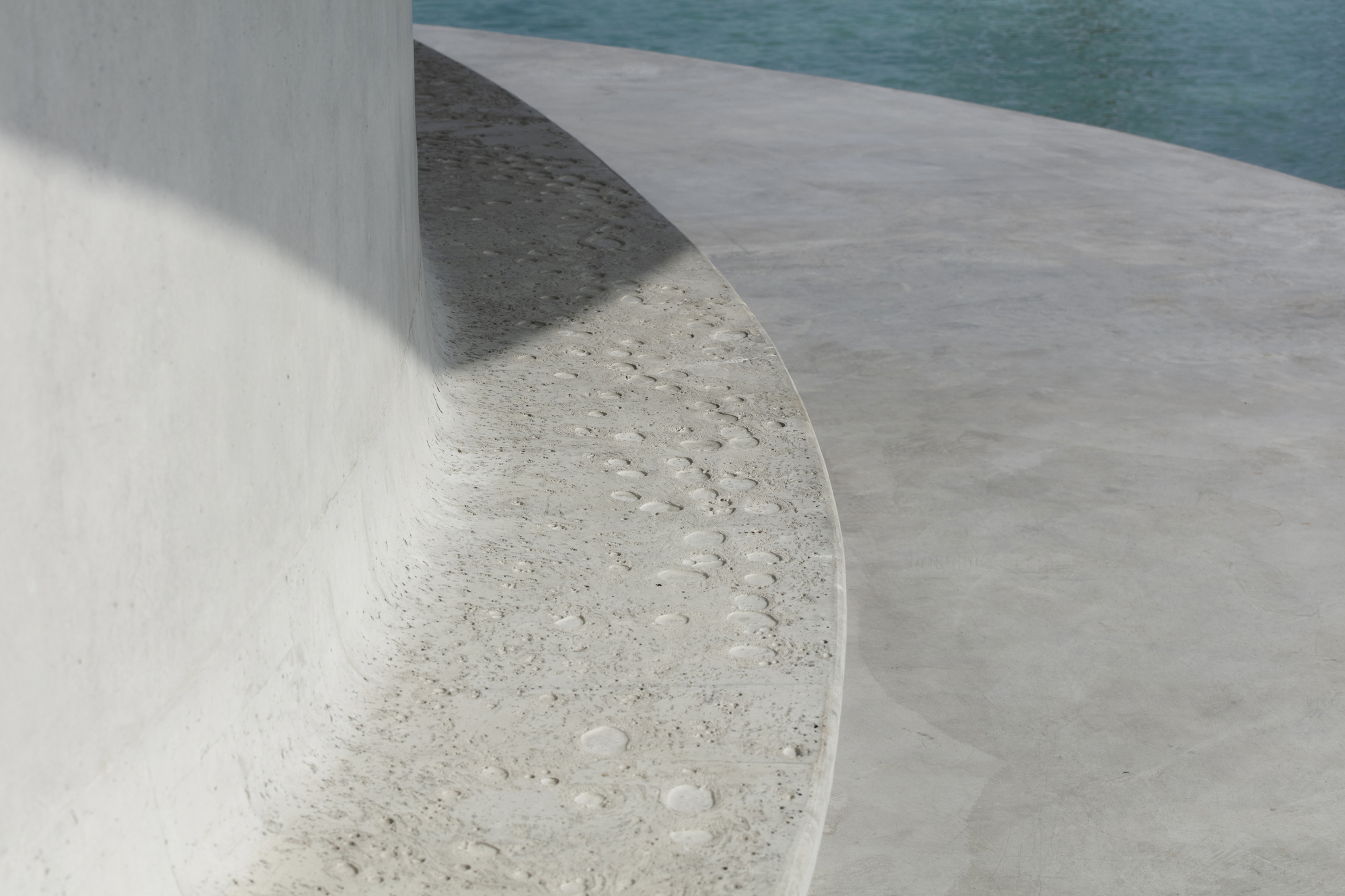 The building, quietly located between land and sea, is highly sculptural. The pavilion’s free and organic forms also allow for the creation of unique interior spaces, where walls, floors, and ceilings merge in unpredictable ways, and the boundaries between the indoors and outdoors are blurred.