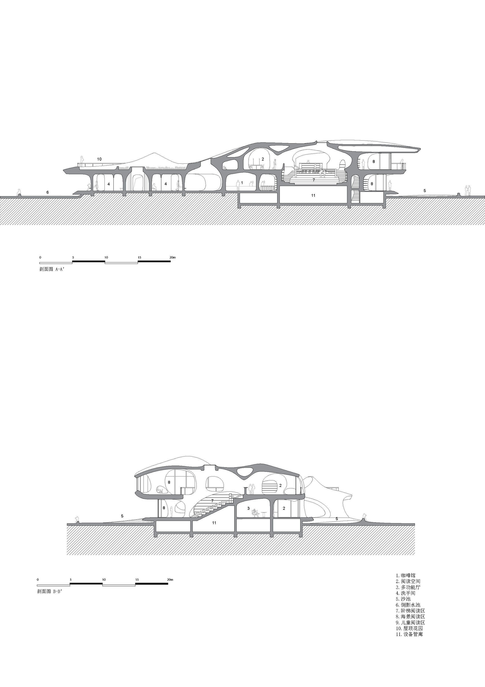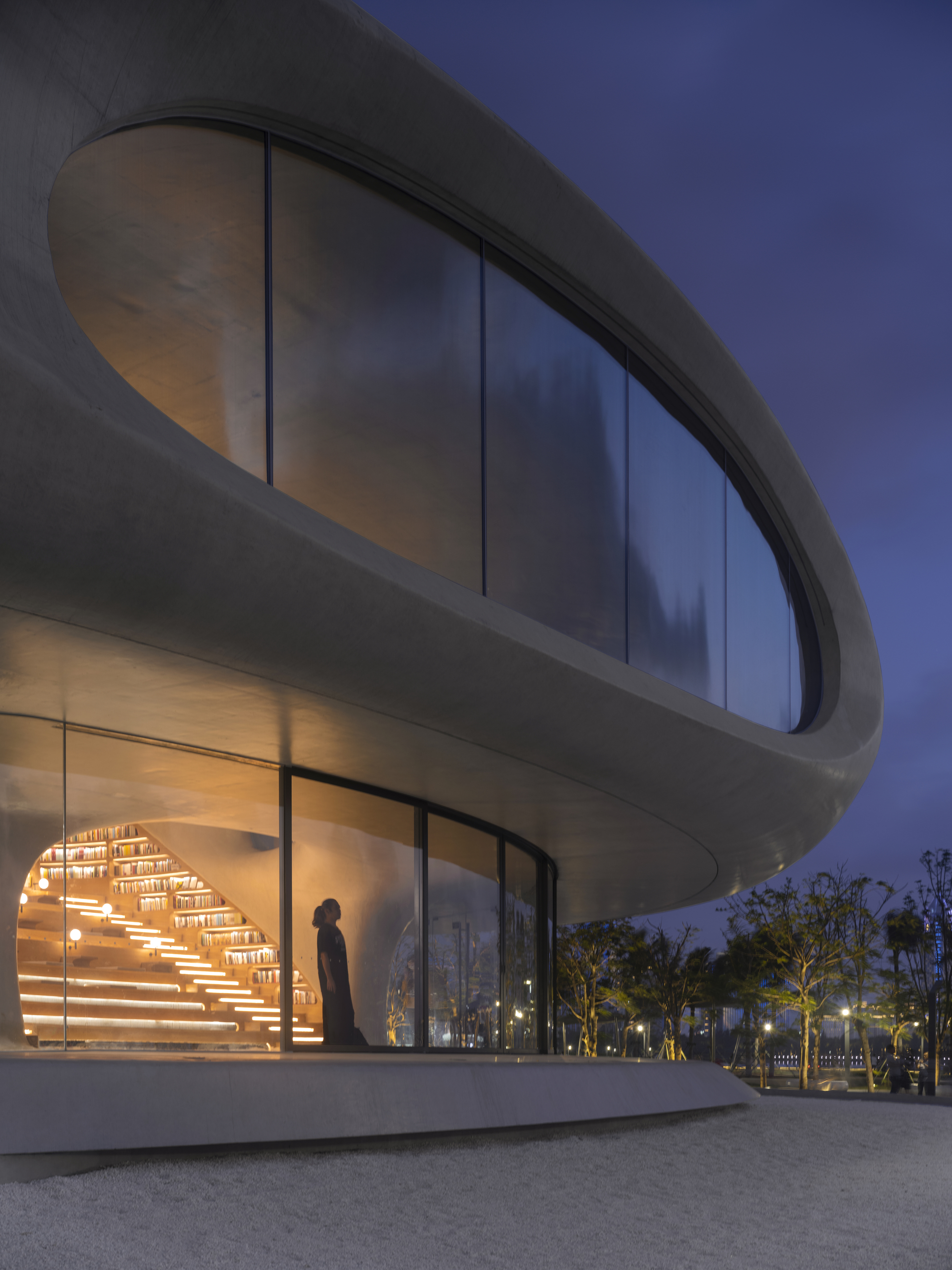 MAD joins this collection of pavilions with a building containing a bookstore and citizen amenities. Situated in Century Park on the shore of Haikou Bay, the project covers an area of 4,397 square meters, with a construction area of 1,380 square meters. To the south side of the pavilion are a library and reading space capable of holding 10,000 books, as well as a multi-functional audio-visual area: free and open for public use. Meanwhile, the building’s northern area features a café, public restrooms, barrier-free restrooms, showers, a nursery room, a public rest area, and a roof garden.