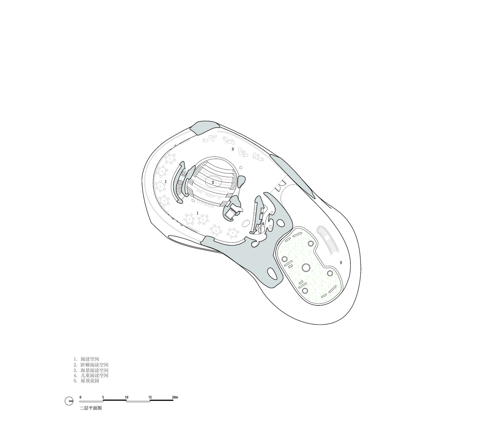 브릿지 역활을 수행합니다. 거대한 백색의 비정형태로 디자인된 클라우드스케이프는 도시와 자연을 연결하는 사람과 사람을 연결하는 건축과 공간을 연결하는 브릿지 역활을 수행합니다. 두개의 타원 평면이 만나며, 프로그램은 시작됩니다. 그중 하나는 주요한 프로그램: 도서관, 열람실등이 자리하는 동안, 화장실과 샤워실 같은 보조공간이 짝을 맞추어 배치됩니다. 소라껍질처럼 휘감아 돌아들어가는 형상은 공간을 유입시킵니다.