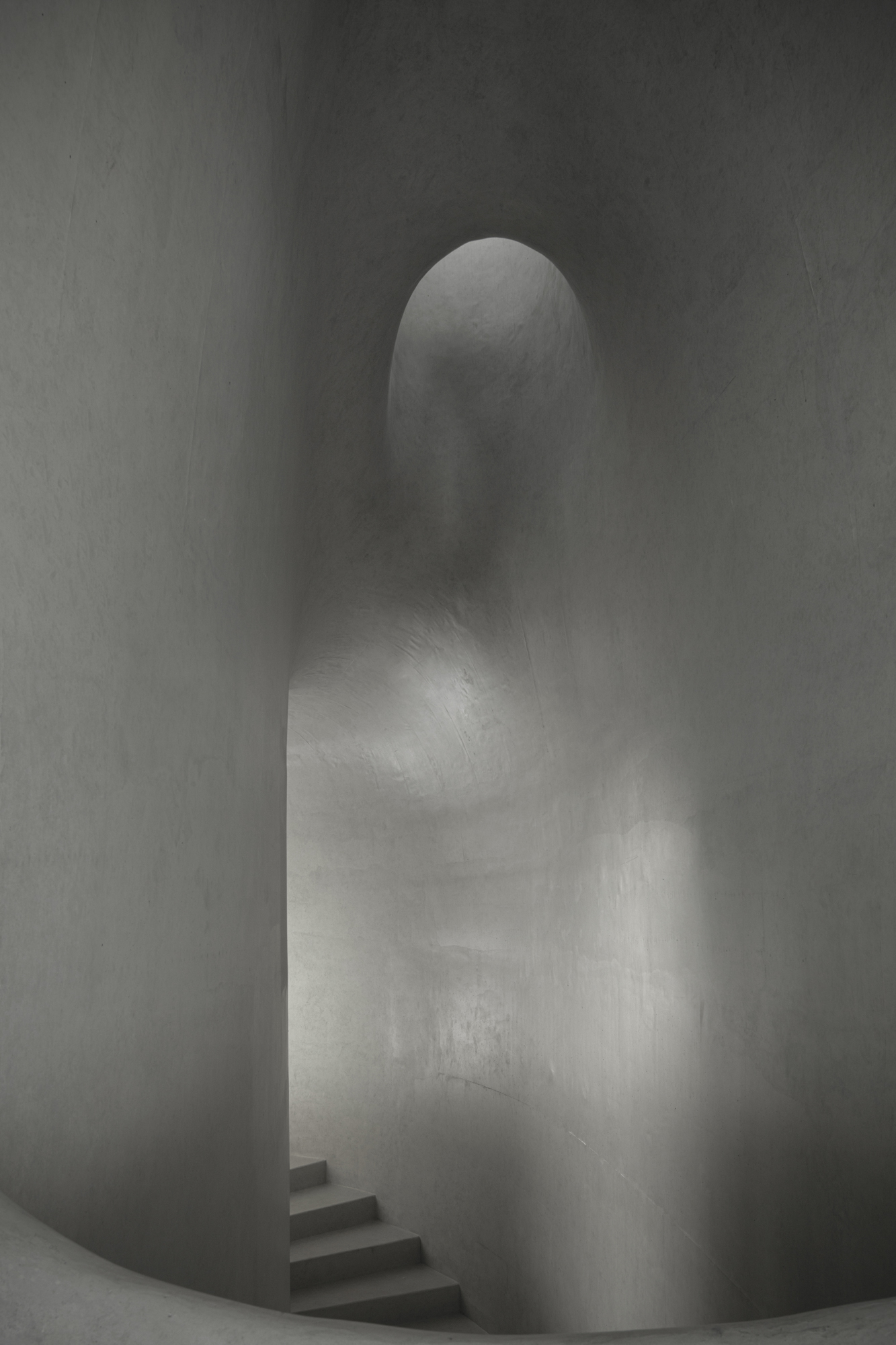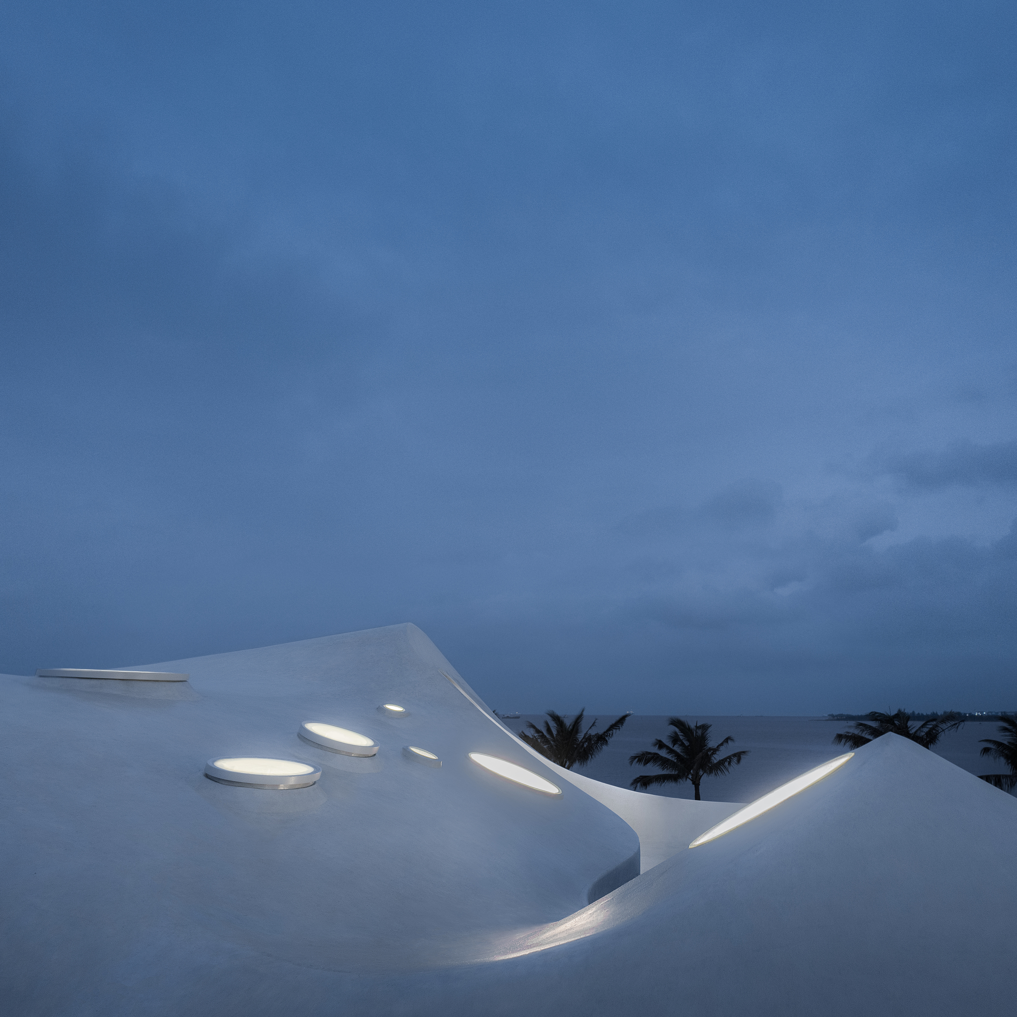 The circular openings of the building are reminiscent of holes forged by wildlife or seas, blurring the boundary between architecture and nature. The varying sizes of the openings allow natural light into the interior and create a natural ventilation effect to cool the building in Haikou’s year-round warm climate. Through the holes, people observe the sky and sea, as if looking at a familiar world through the passage of time and space. This layering of atmospheres, and collision between people and space, creates a sense of living ritual.