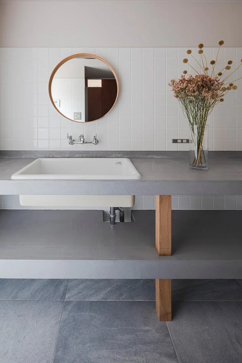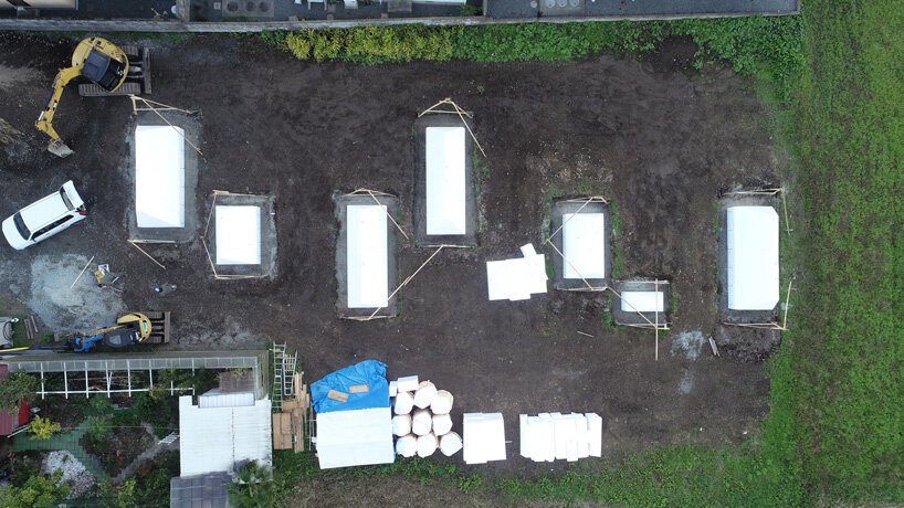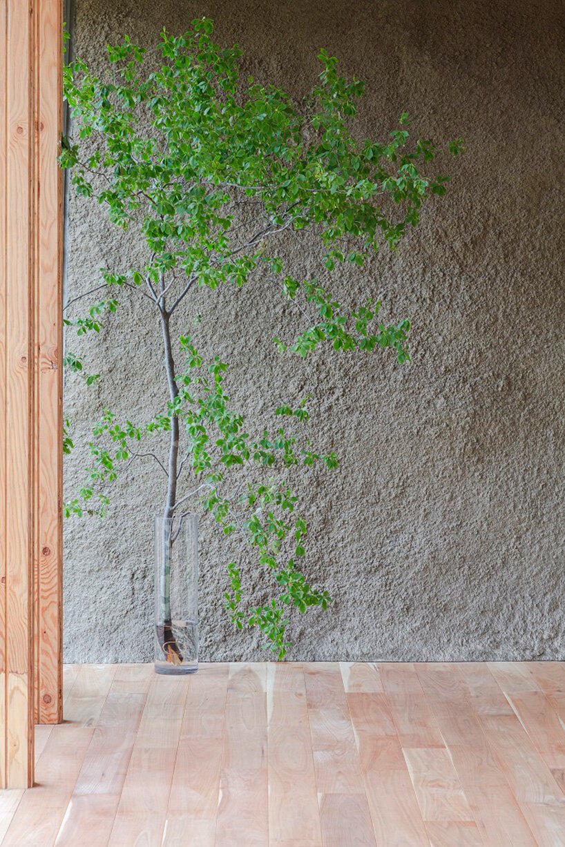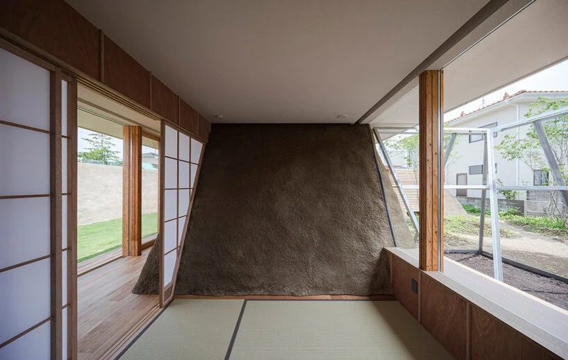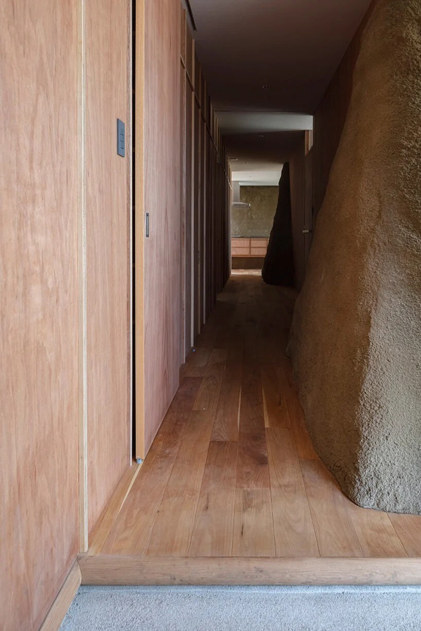 'during this project, we found that disposal of surplus soil costed much more than our estimation,’ continues ADX. ‘by getting an idea from a memory of playing with sand during our childhood, we shifted our plan from “disposing” to “utilizing” it as material of construction.’ the architects sprayed the walls covered with expanded polystyrene with a method of EPS civil engineering for the purpose of using both walls inside and outside as a building structure. as a result, they were able to create an atmosphere that merges with nature.