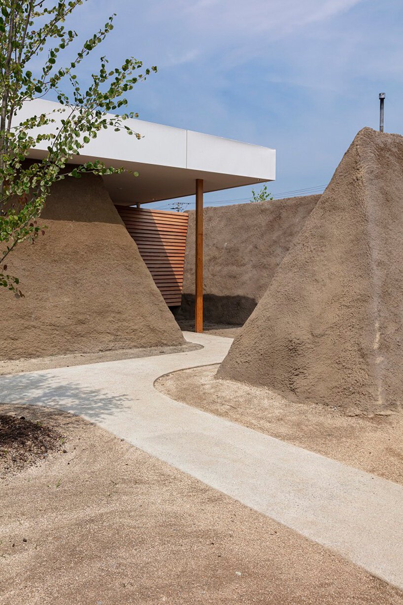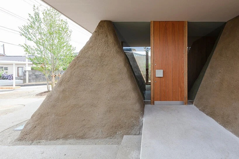 ADX has incorporated excavated soil into the construction of the trapezoid walls of this single-story house in minamisoma city, japan. ‘soil house’ is developed for a client who was forced to leave his home after the great east japan earthquake of 2011. in spite of its urban surroundings, the home establishes a strong connection with nature through an artificial earth landscape that resembles children’s sandcastles.