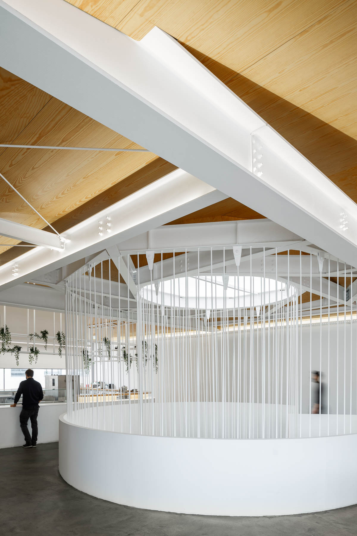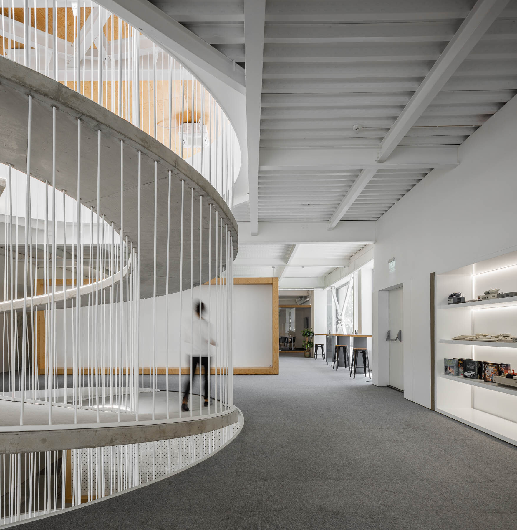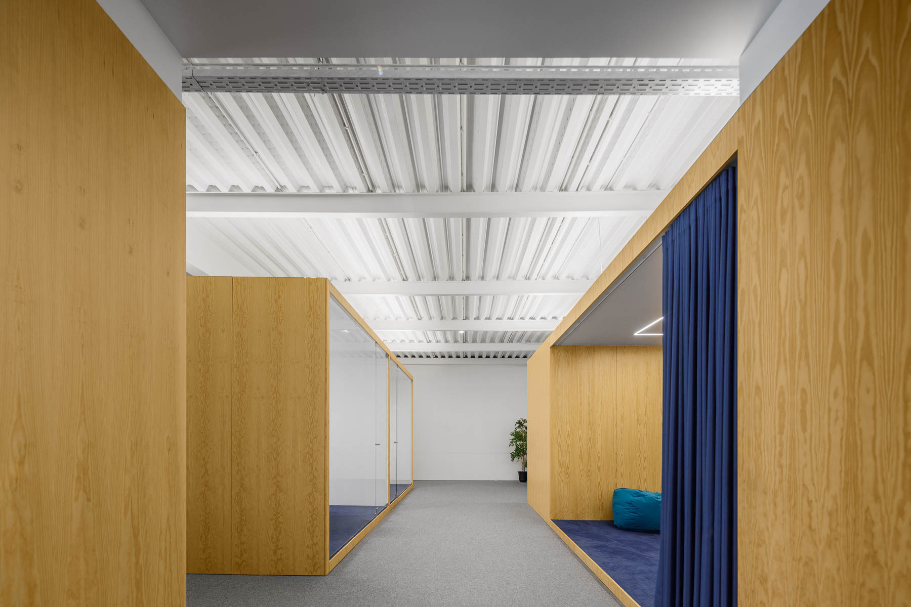 In order to achieve all the intended functionalities, we distributed a series of wooden boxes, where we integrated all the enclosed spaces, meeting rooms, bathrooms, and video room booths. It is the distribution of these boxes throughout the space that defines all the spatial dynamics. By distributing these functions, in a heterogenic way throughout the space, and by mismatching these elements, in a kind of organized chaos, we guaranteed spatial versatility and created a series of nooks and crannies that allow several kinds of appropriation, assigning each one of them a distinct personality.