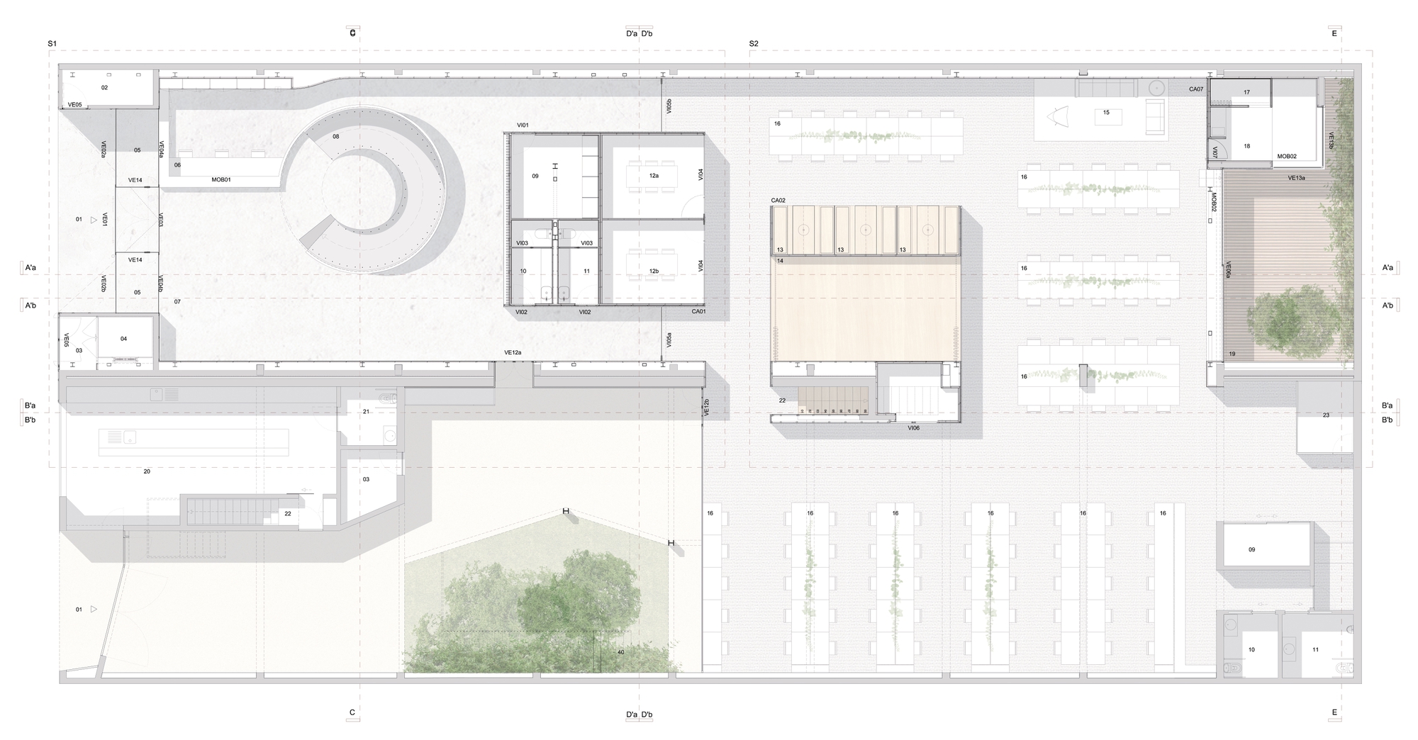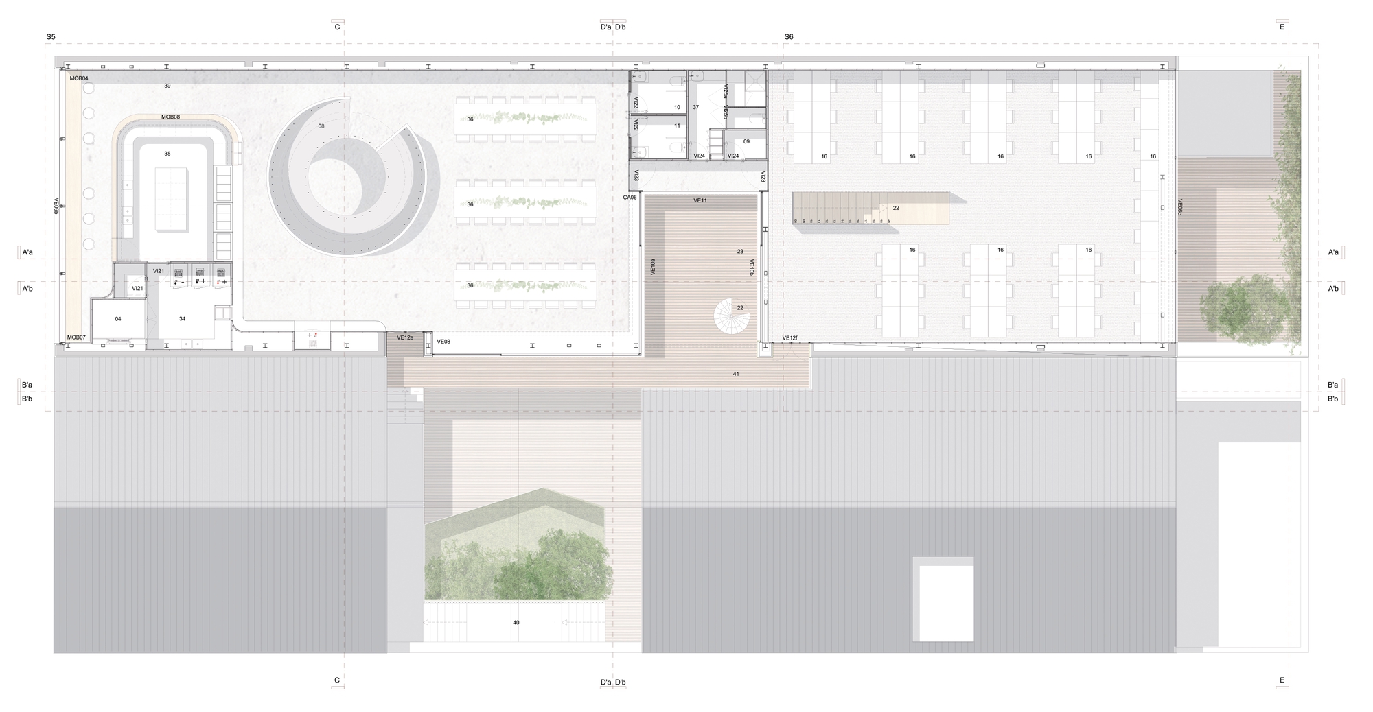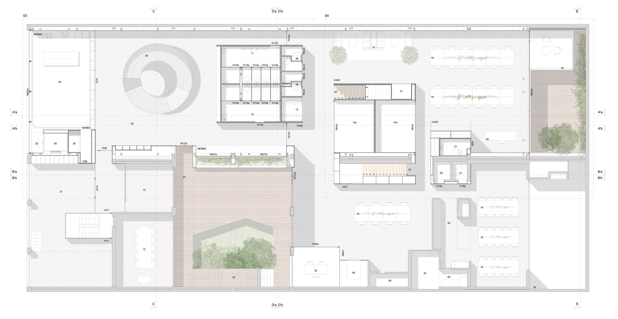 In order to achieve all the intended functionalities, we distributed a series of wooden boxes, where we integrated all the enclosed spaces, meeting rooms, bathrooms, and video room booths. It is the distribution of these boxes throughout the space that defines all the spatial dynamics. By distributing these functions, in a heterogenic way throughout the space, and by mismatching these elements, in a kind of organized chaos, we guaranteed spatial versatility and created a series of nooks and crannies that allow several kinds of appropriation, assigning each one of them a distinct personality.