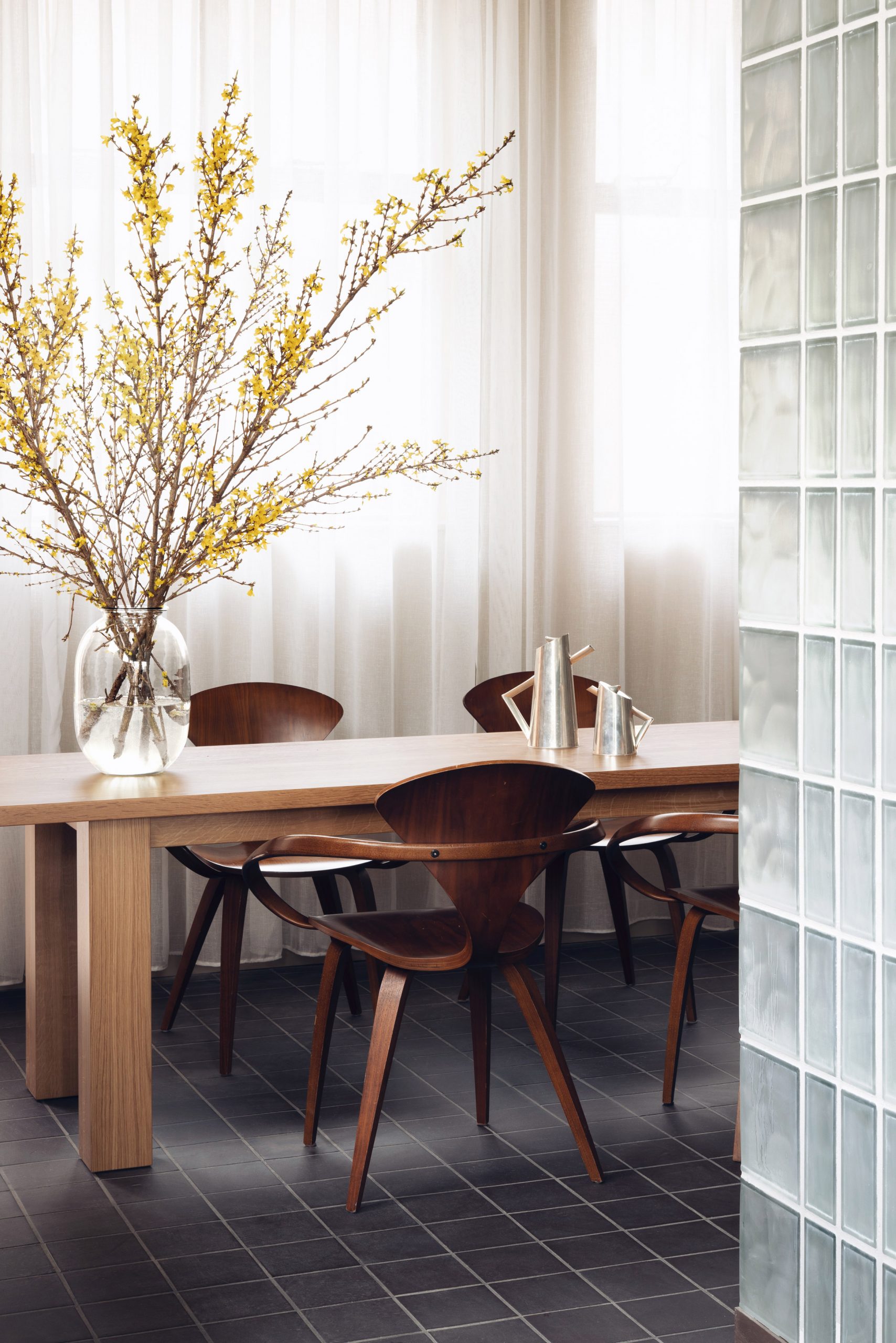 "The design evolved around the bold geometry of this period and the juxtaposition of simple materials: wood, glass, clay and steel."