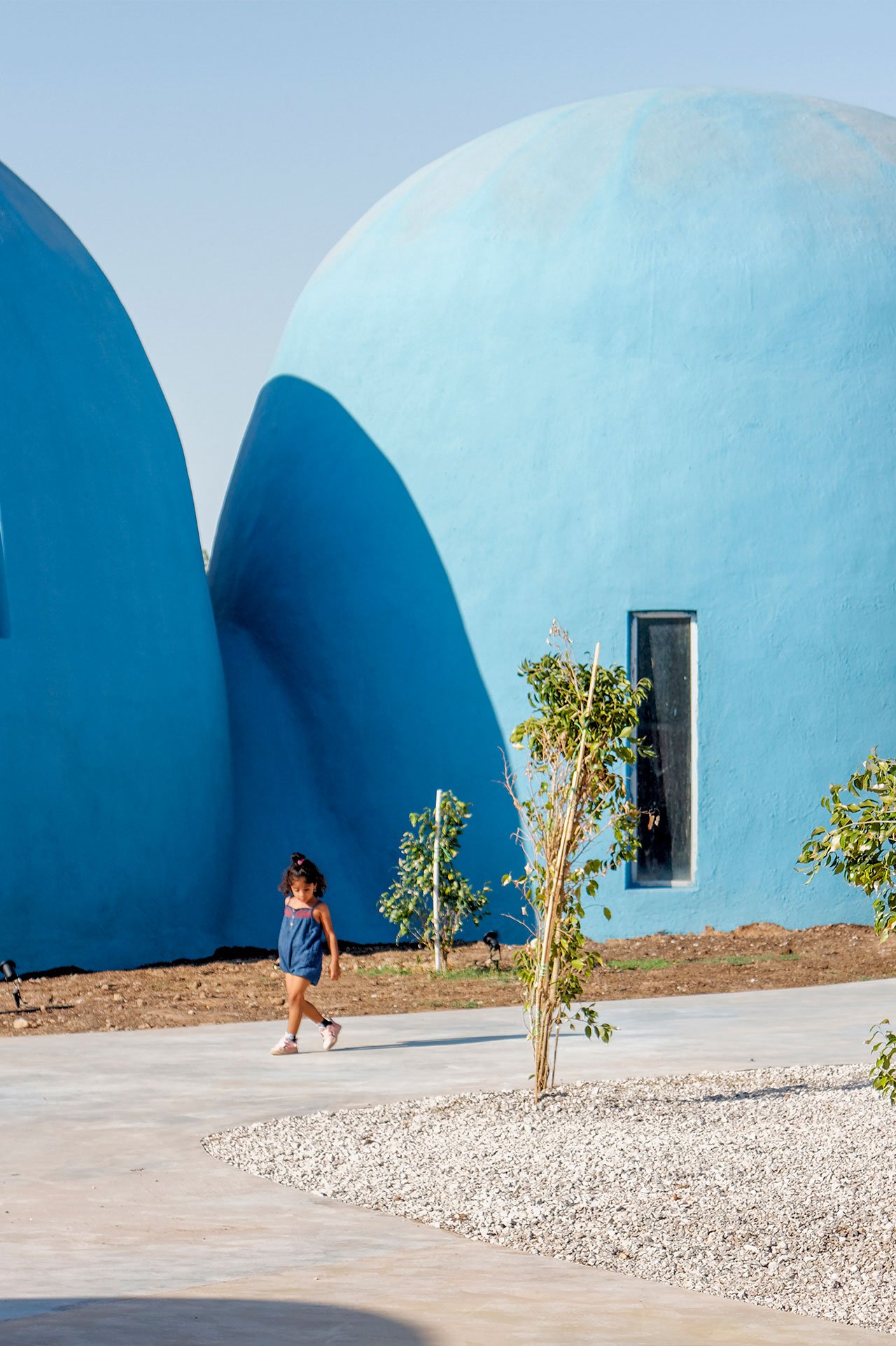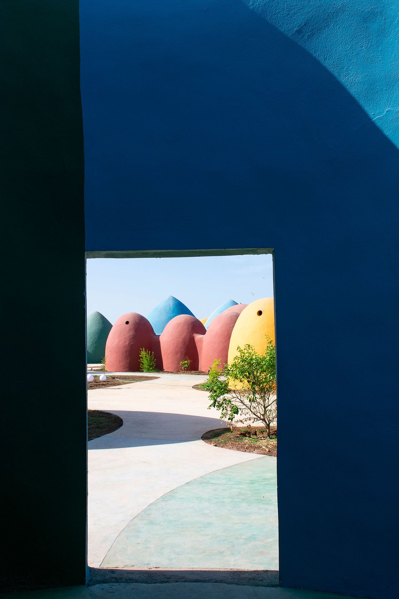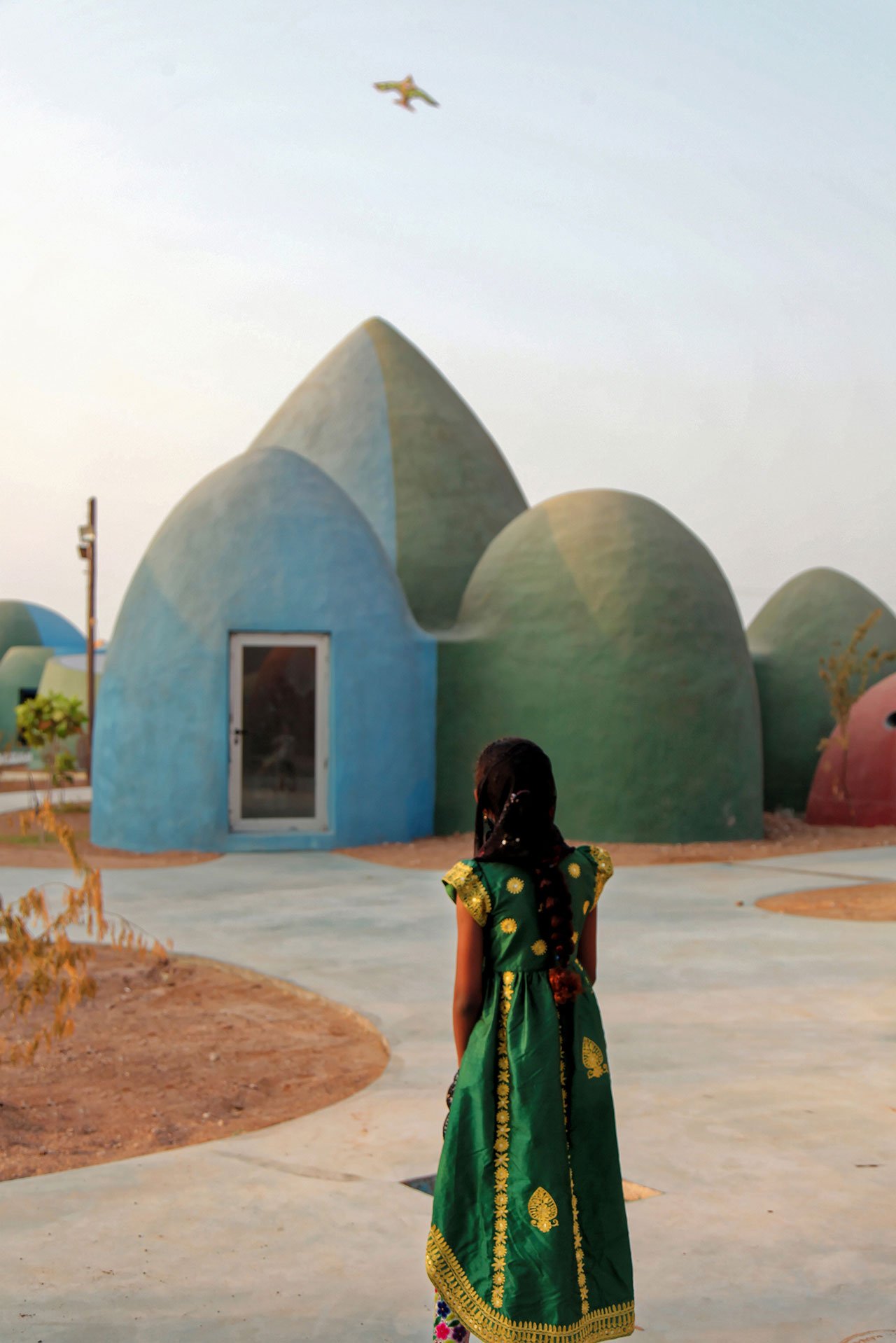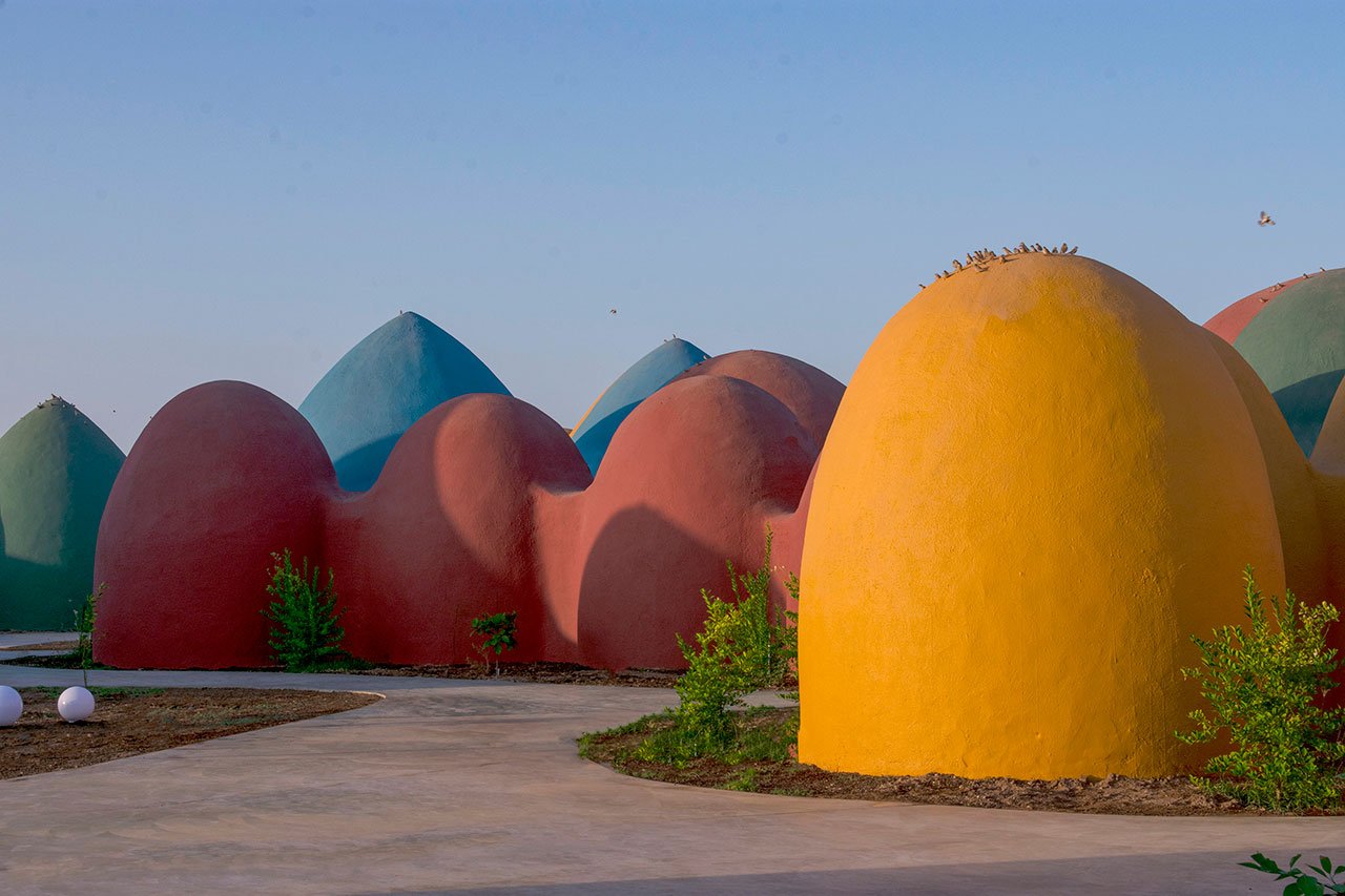 Made by local people, the domes are based on acclaimed Iranian architect Nader Khalili’s “Superadobe” housing units. Part of Khalili’s life-long quest for an architecture that could house the world’s poor, the “Superadome” is a type of rammed earth construction using woven polyester bags filled with sand, soil, or clay – or whatever is at hand. The bags are laid in coils to construct load-bearing walls that spiral inwards to then create a domed roof at the top. The beauty of Khalili’s design lies both in the pre-modern architectural language, a type of timeless vernacular so to speak, and its practicality: it’s extremely low budget, doesn’t require skilled labour and ensures reduced heating and cooling costs due to thermal mass.