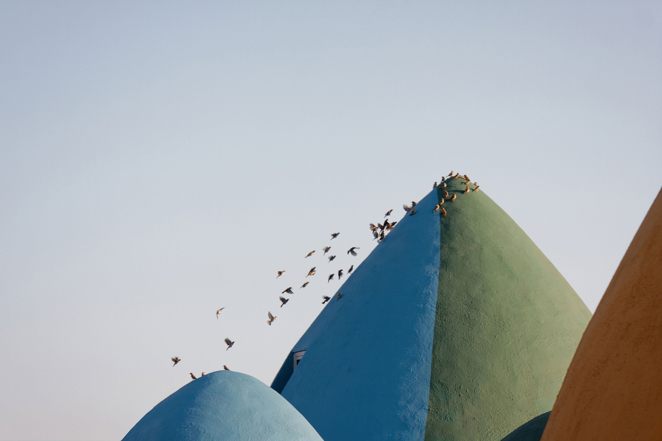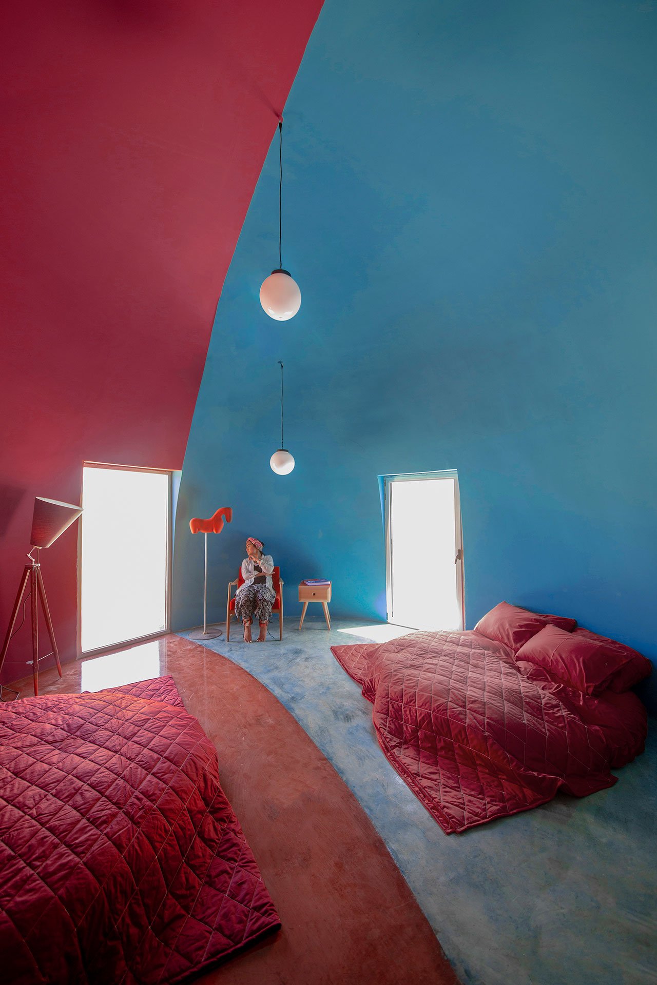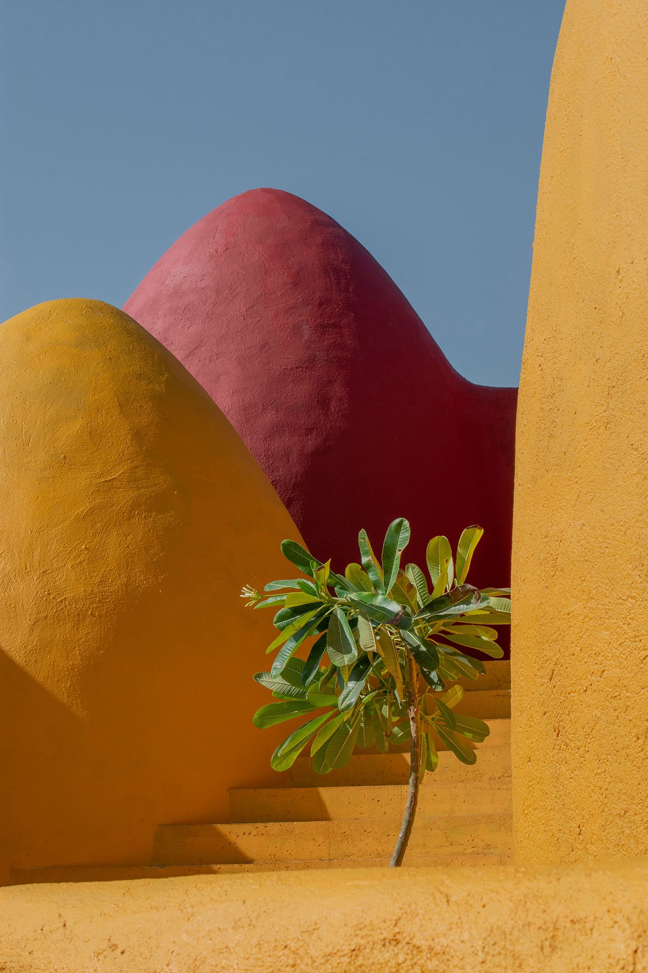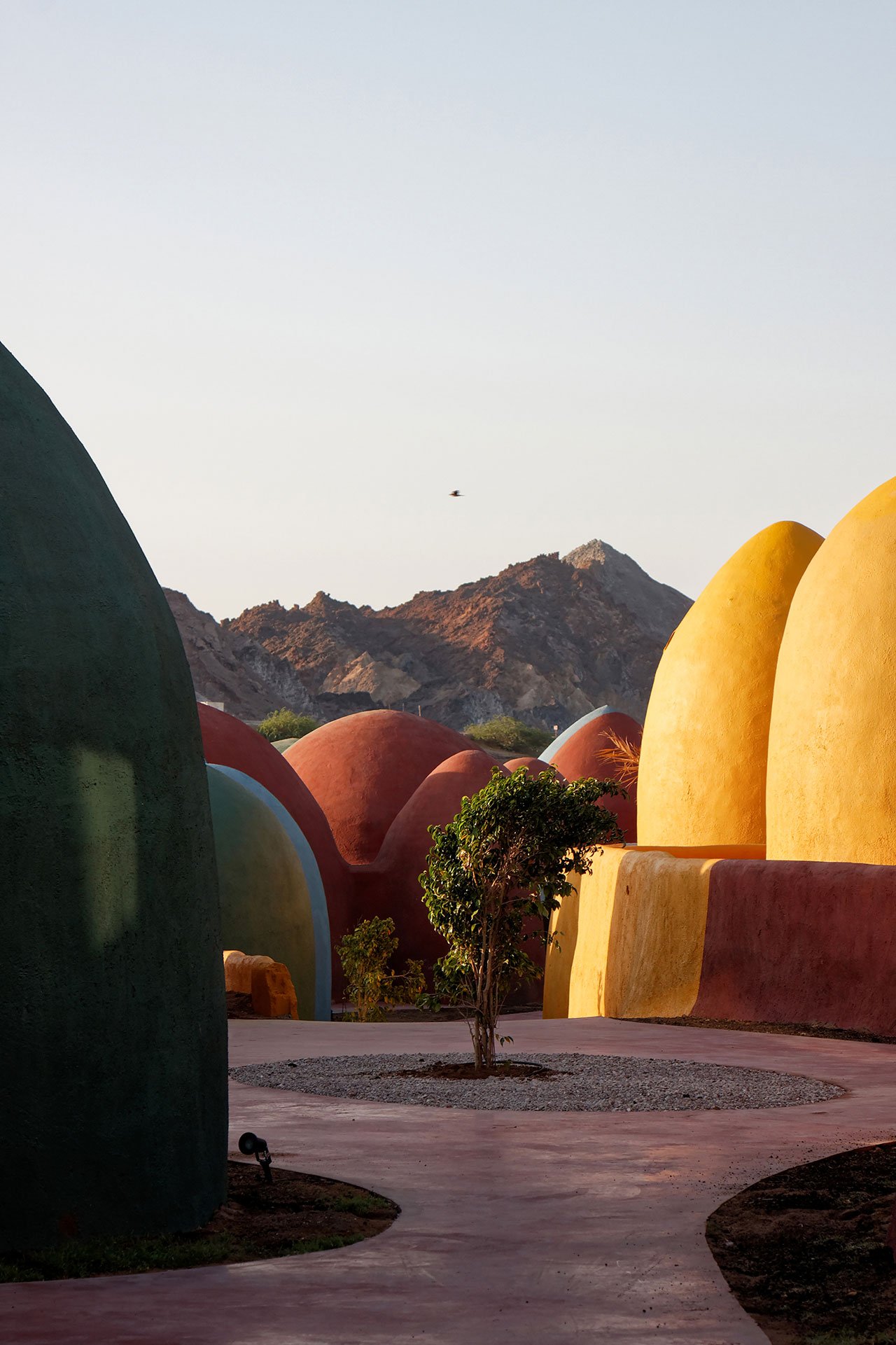 Located on a beachfront expanse outside the island’s only settlement, Majara Residence takes the form of smaller and larger pointed domes grouped in clusters of varying density providing accommodation for 84 guests together with a café, restaurant and wellness centre as well as handicraft workshops, a cultural boutique and an art residency program. Set against a backdrop of jagged rock formations, the undulating composition of domes creates, in the architects’ words a “colourful three-dimensional fabric”, its blood-red, yolk-yellow, sky blue and sea green hues echoing both the colouration and morphology of the island’s otherworldly vistas.