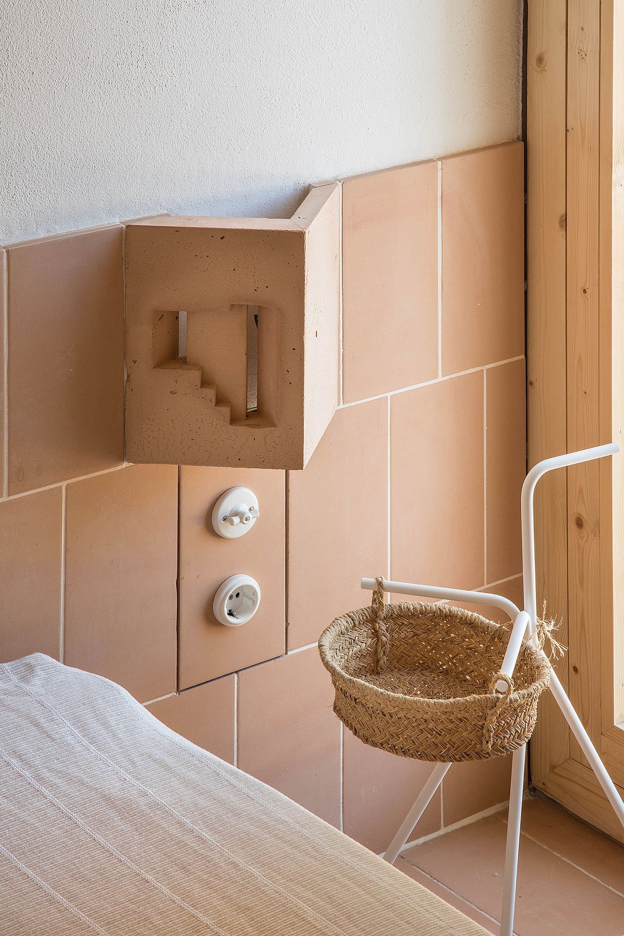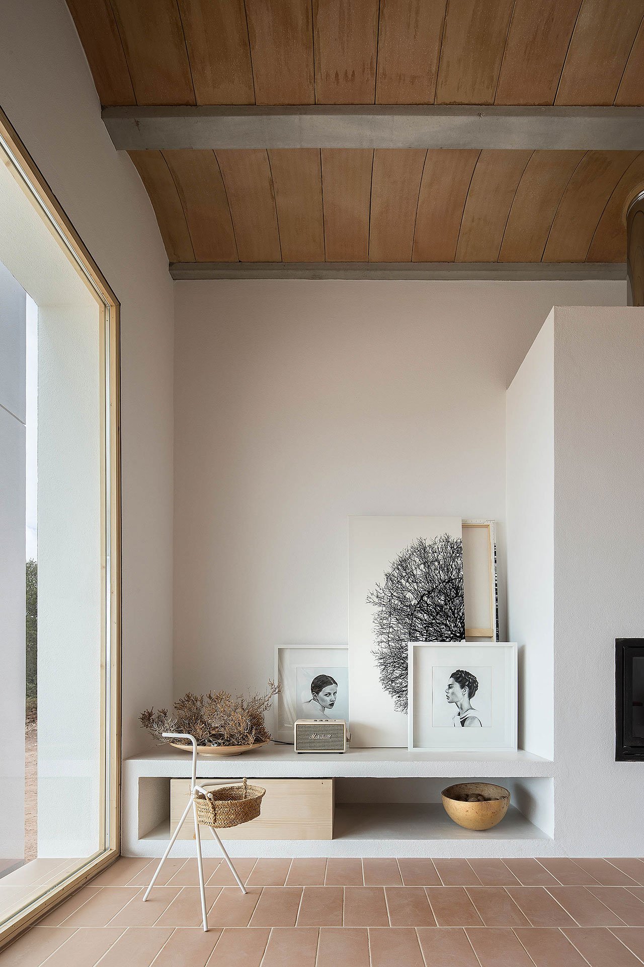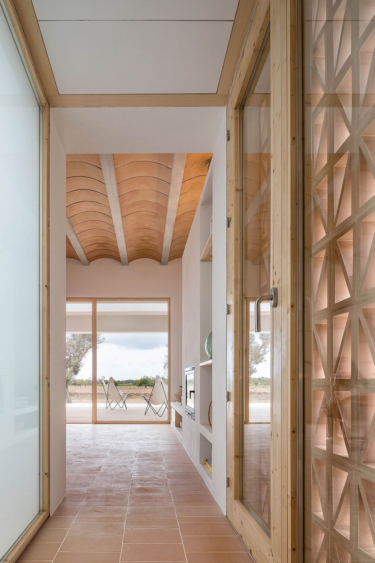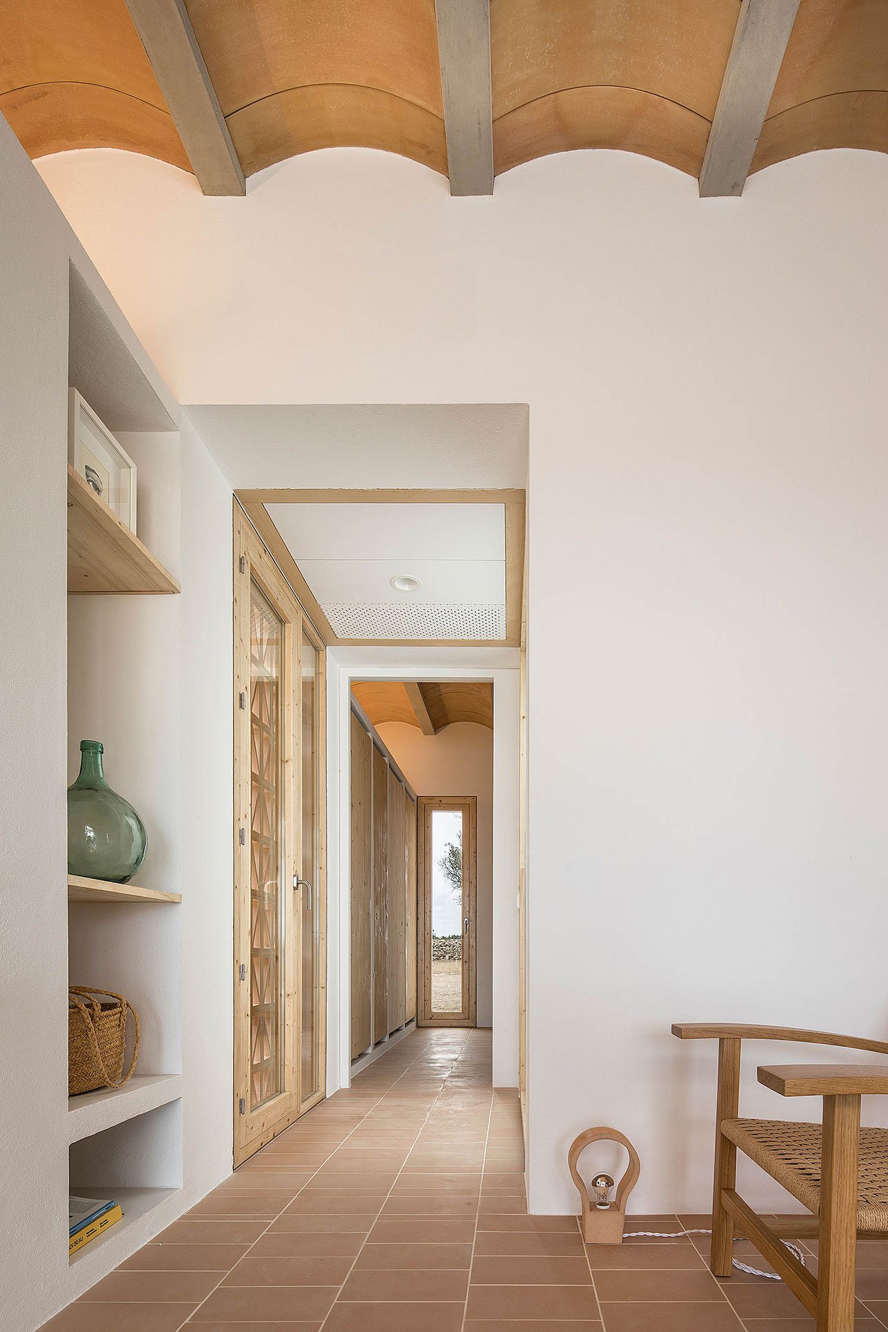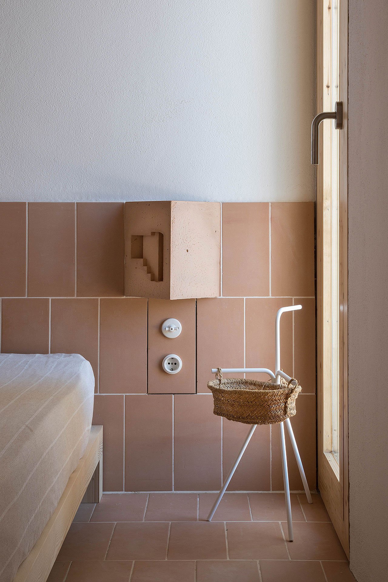 The interior design is underpinned by a muted colour palette of earthy tones and natural materials that echoes the rural landscape outside. Mallorca-style low-depth ceramic vaults in the ceiling and pressed terracotta floor tiles imbue the rooms with soft, warm textures. Terracotta tiles have also been used to design the bespoke headboards for the bedrooms and lattice walls for the bathroom, as well as used in crashed form to make the gravel that surrounds the building volumes and protect their flat roofs. Natural wood, featured in custom-designed built-in furniture, doors and windows complements the terracotta surfaces as do the green ceramic tiles in the bathroom which have been inspired by the local vegetation.