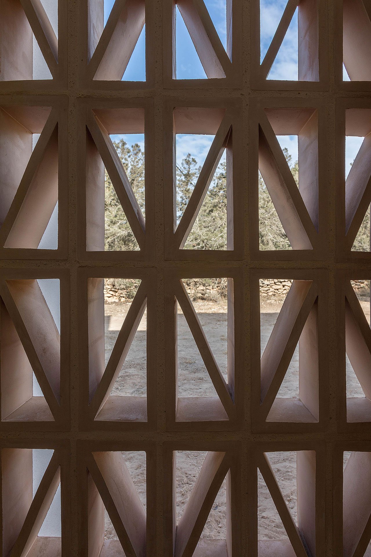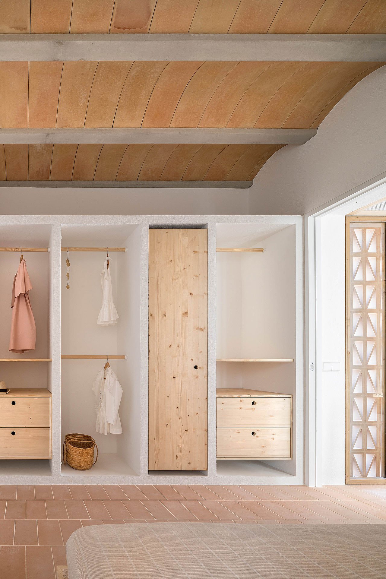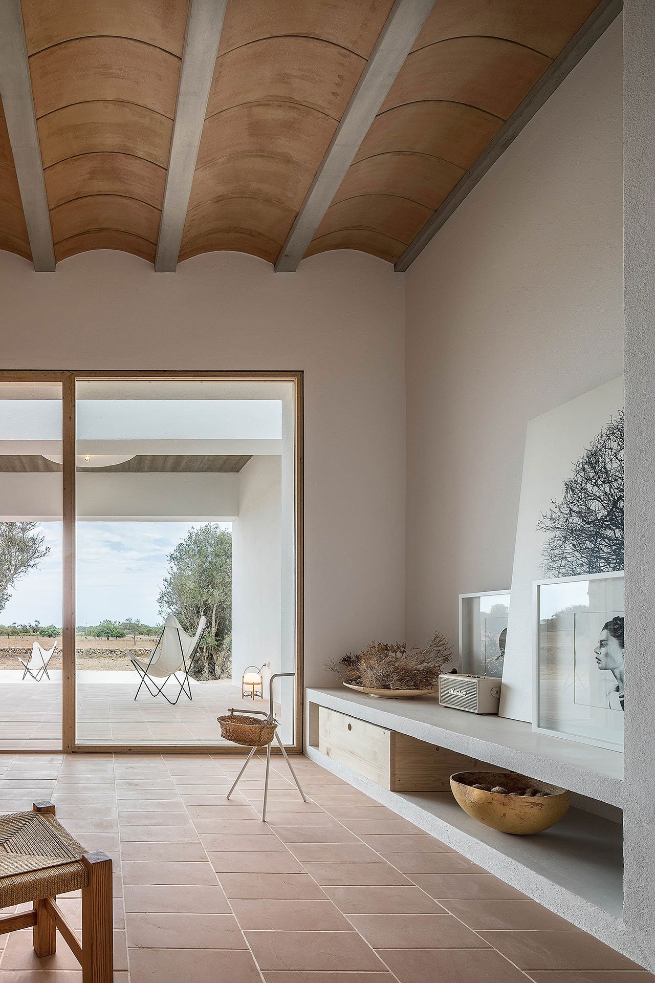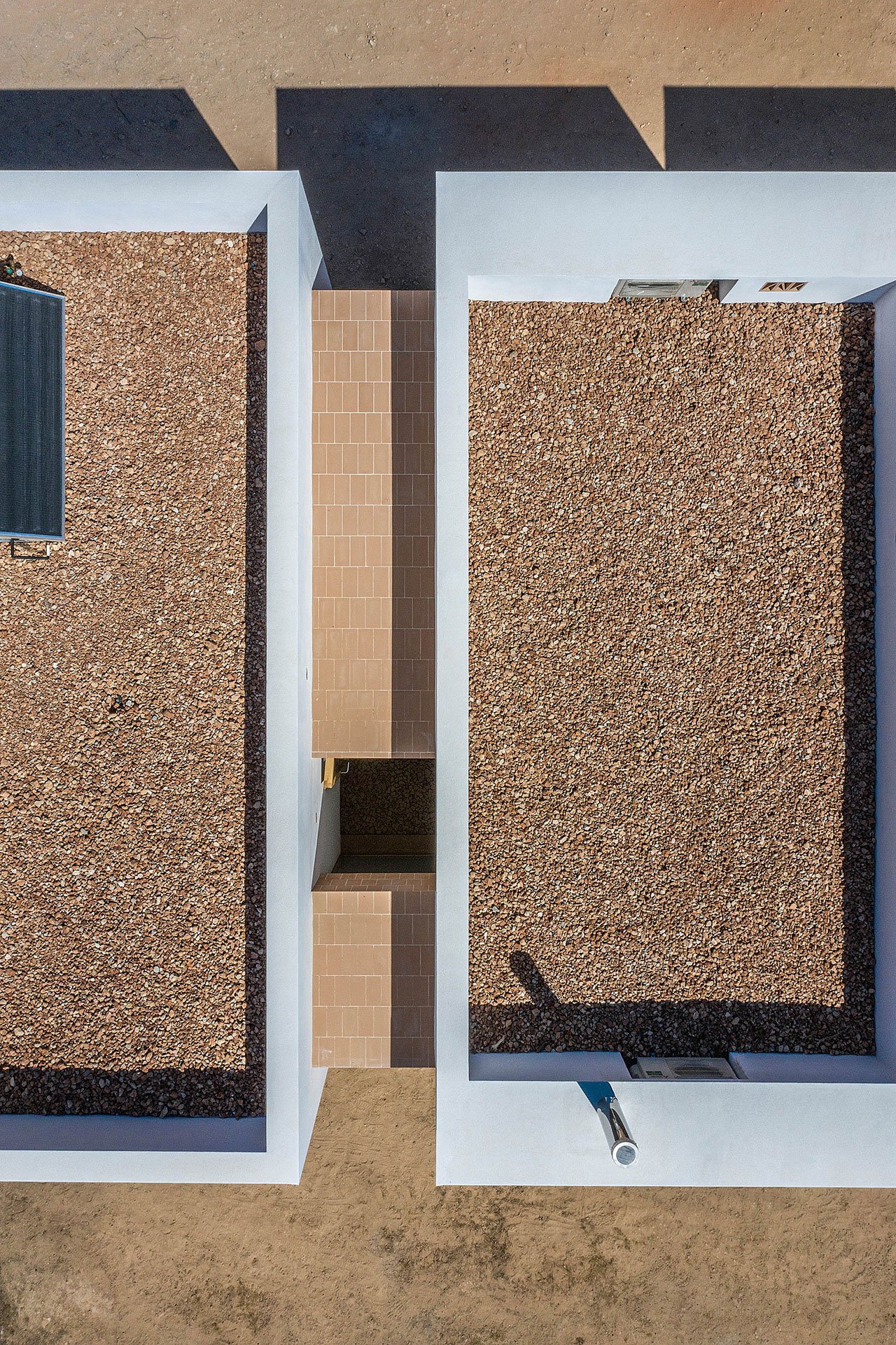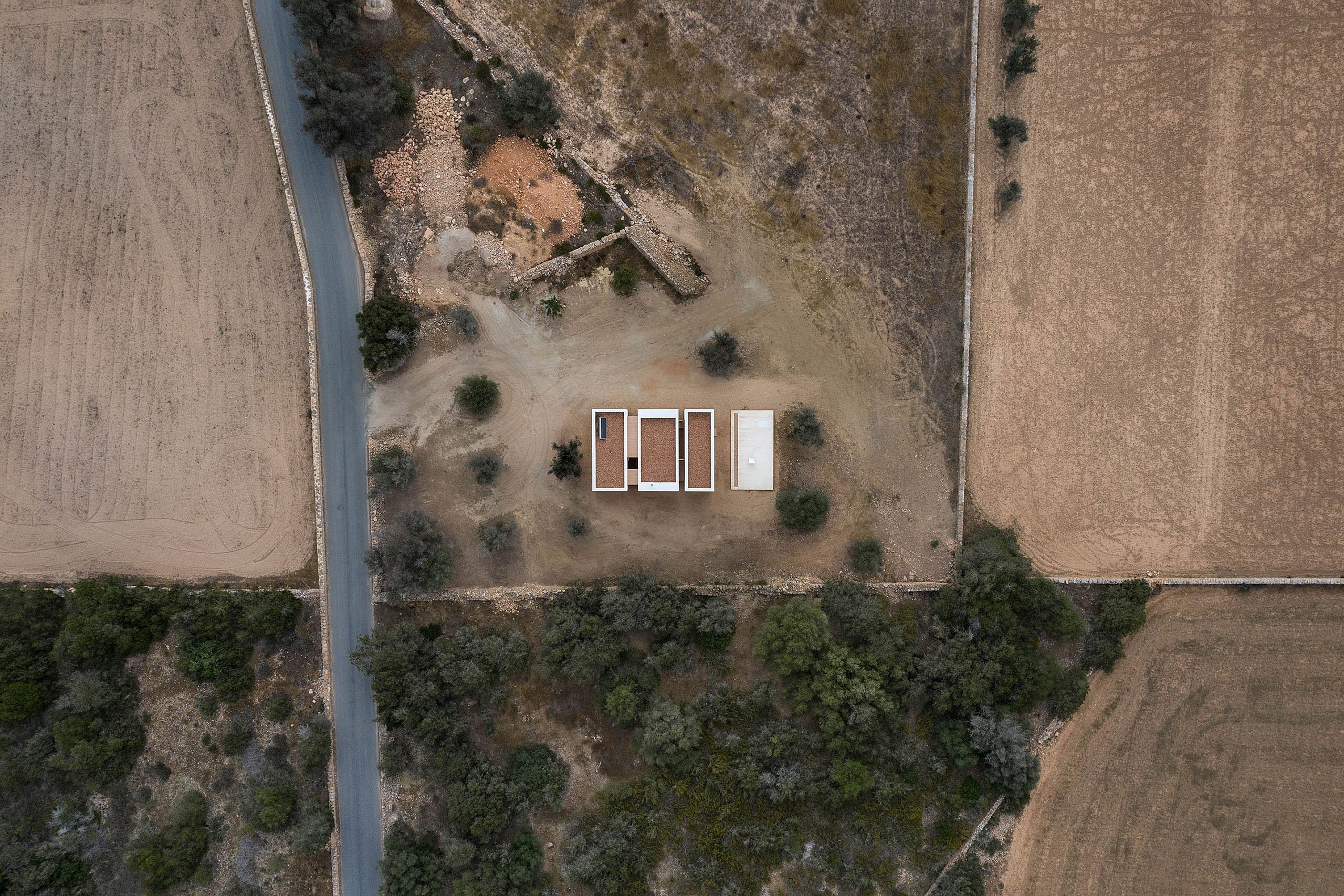 The interior design is underpinned by a muted colour palette of earthy tones and natural materials that echoes the rural landscape outside. Mallorca-style low-depth ceramic vaults in the ceiling and pressed terracotta floor tiles imbue the rooms with soft, warm textures. Terracotta tiles have also been used to design the bespoke headboards for the bedrooms and lattice walls for the bathroom, as well as used in crashed form to make the gravel that surrounds the building volumes and protect their flat roofs. Natural wood, featured in custom-designed built-in furniture, doors and windows complements the terracotta surfaces as do the green ceramic tiles in the bathroom which have been inspired by the local vegetation.