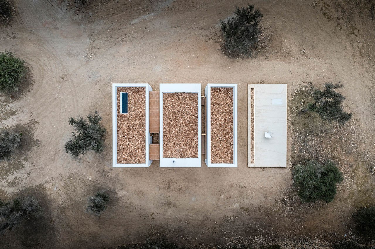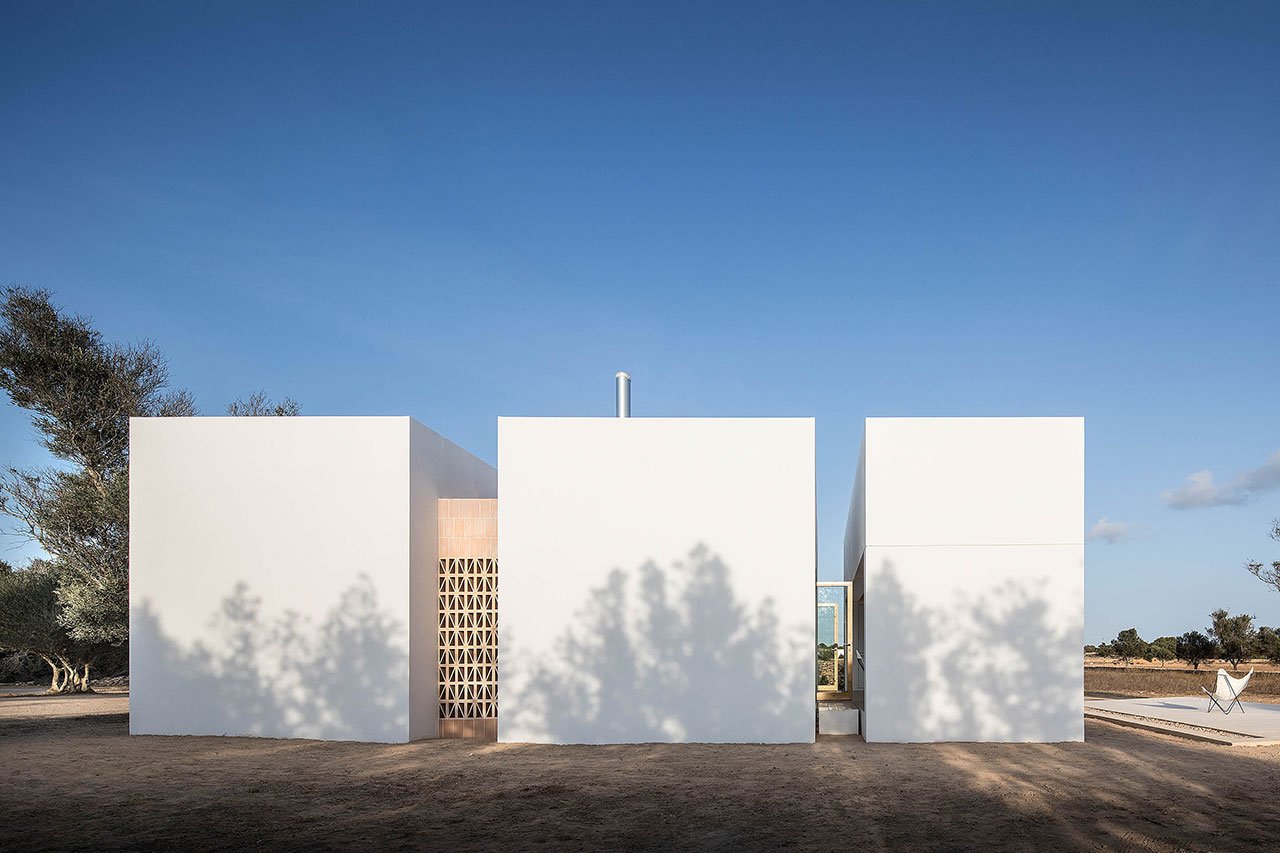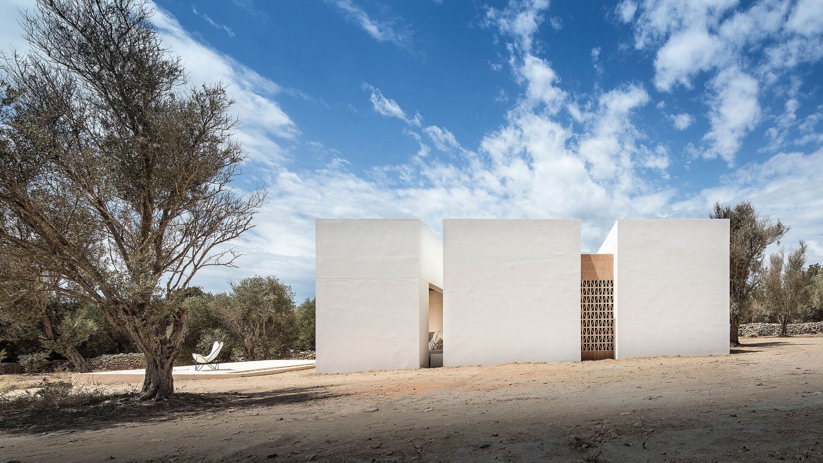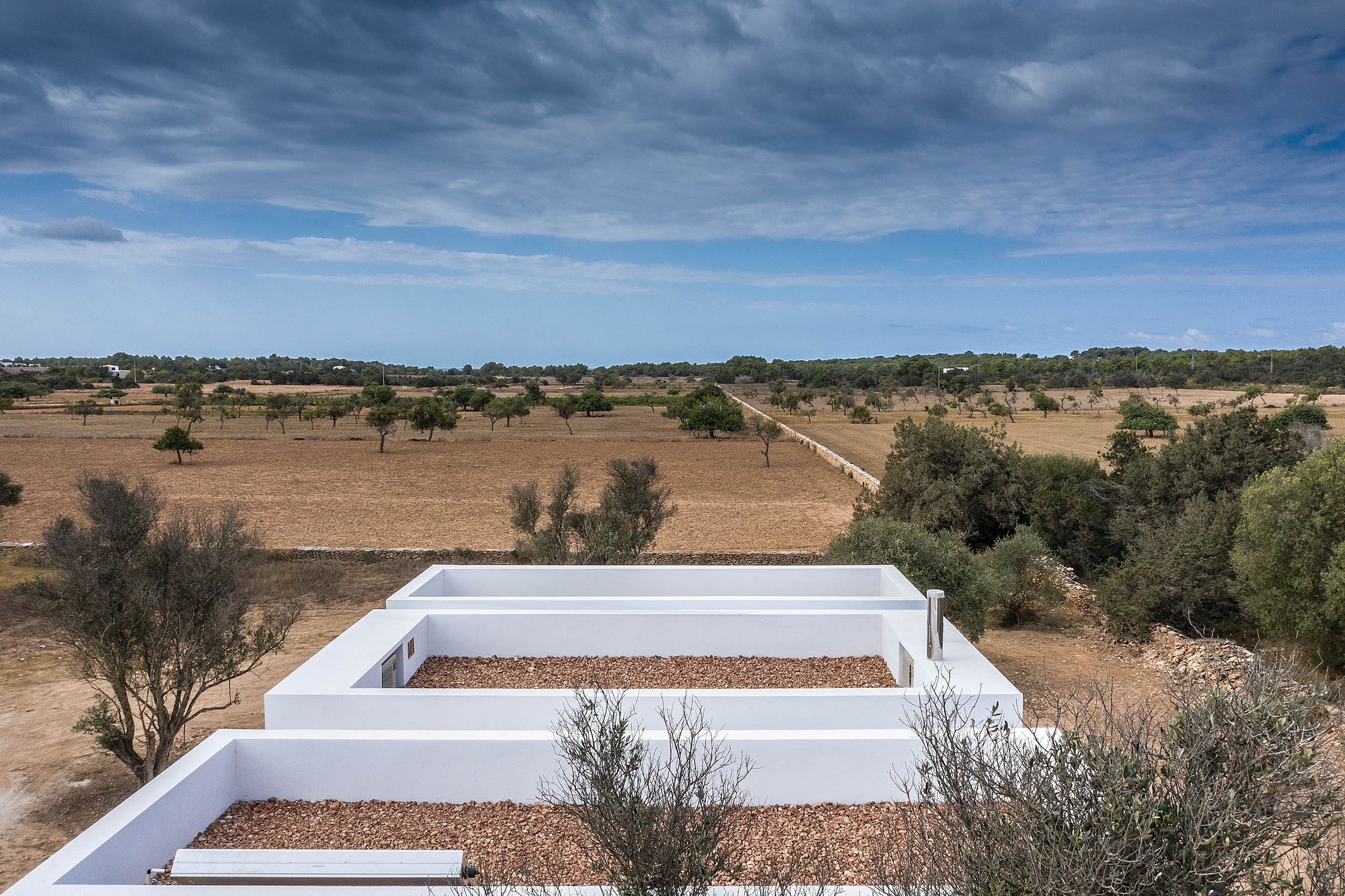 Surrounded by wheat and oat fields, traditional dry-stone walls and groves of almond and fig trees, far away from the tourist-filled beaches and whitewashed villages, Castelló took advantage of the rural plot’s tranquil location to design a modest retreat in perfect harmony with the natural landscape. Inspired by the island’s vernacular architecture, the house is a low-key affair that is made up by three closely stacked, whitewashed, cubic volumes. The breakdown of the building mass into three parts neatly divides the interior into private, communal and outdoor areas, whilst allowing natural light and air to filter inside, and ensuring for a minimal visual impact.