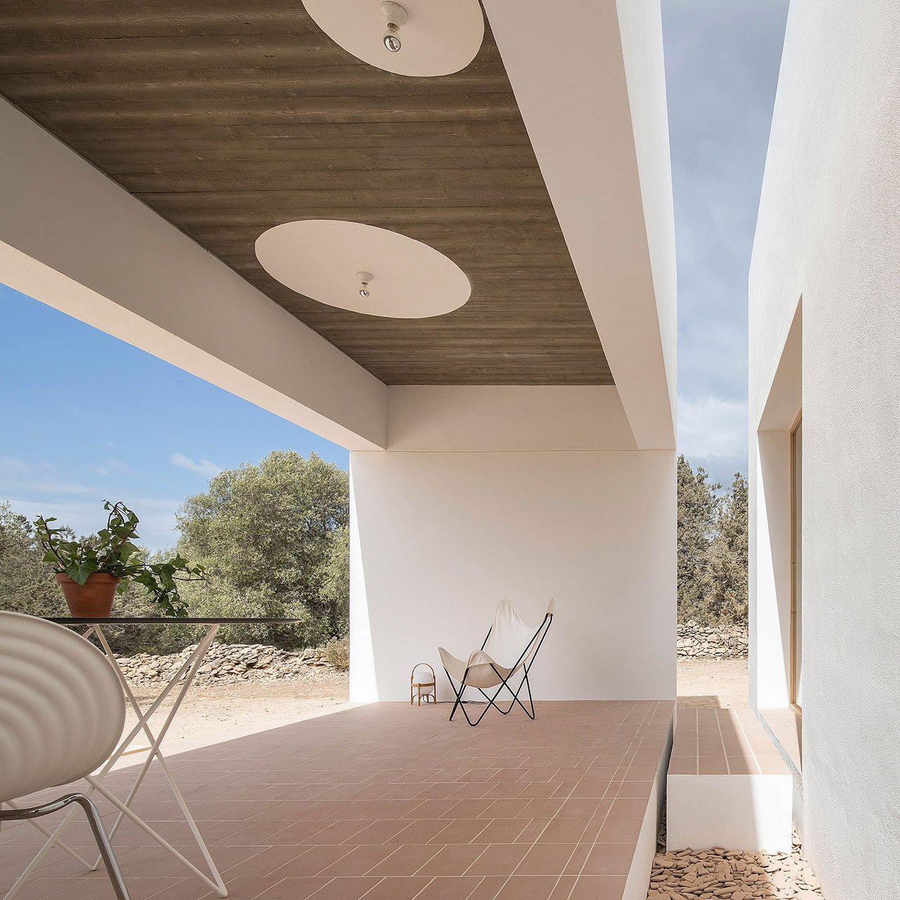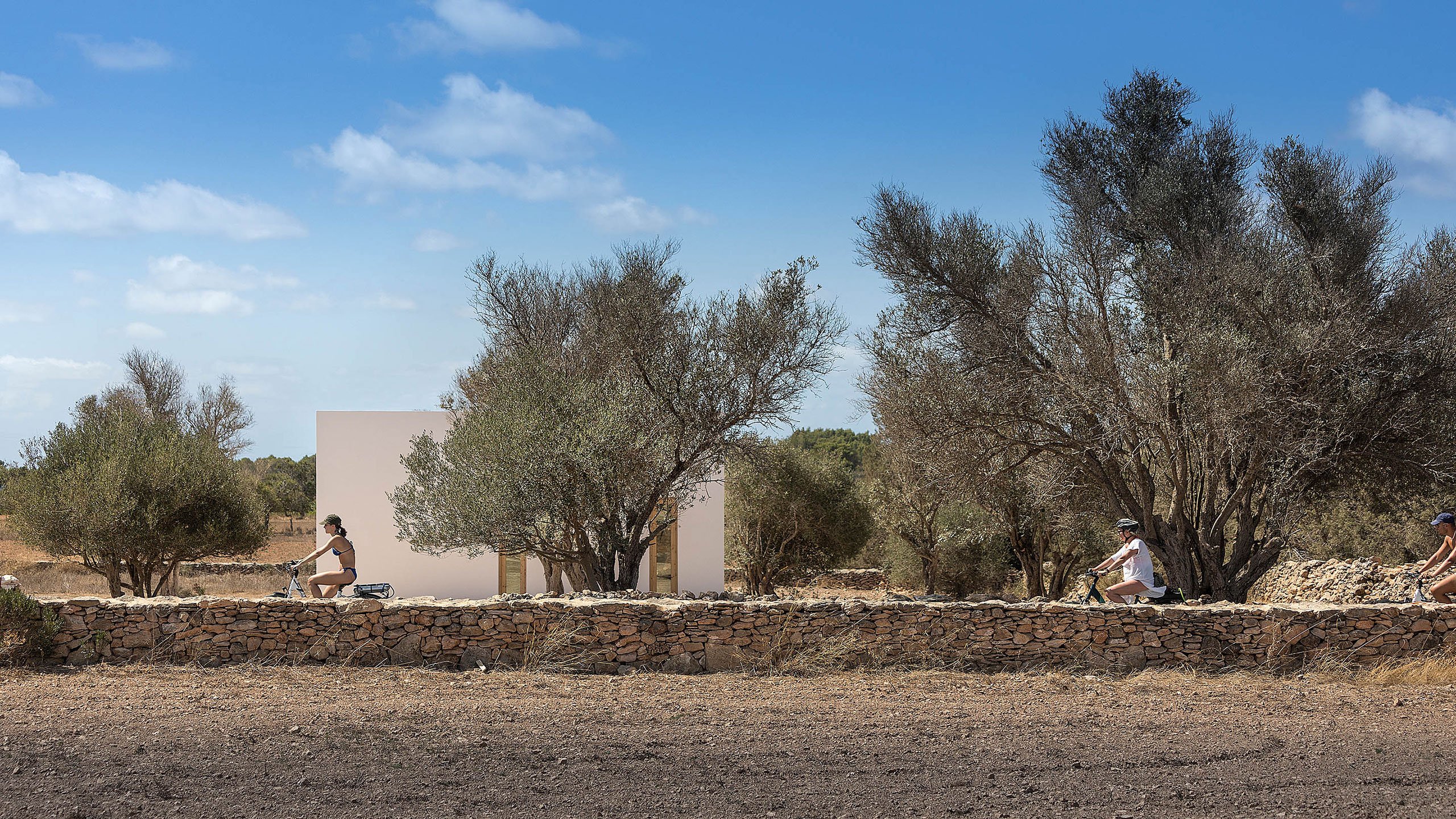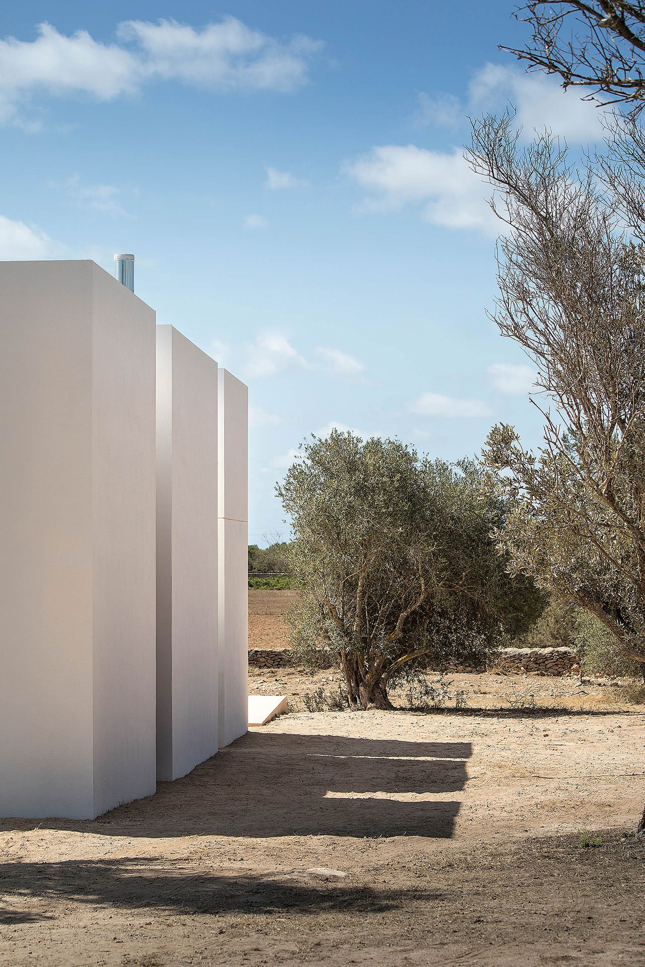 Surrounded by wheat and oat fields, traditional dry-stone walls and groves of almond and fig trees, far away from the tourist-filled beaches and whitewashed villages, Castelló took advantage of the rural plot’s tranquil location to design a modest retreat in perfect harmony with the natural landscape. Inspired by the island’s vernacular architecture, the house is a low-key affair that is made up by three closely stacked, whitewashed, cubic volumes. The breakdown of the building mass into three parts neatly divides the interior into private, communal and outdoor areas, whilst allowing natural light and air to filter inside, and ensuring for a minimal visual impact.