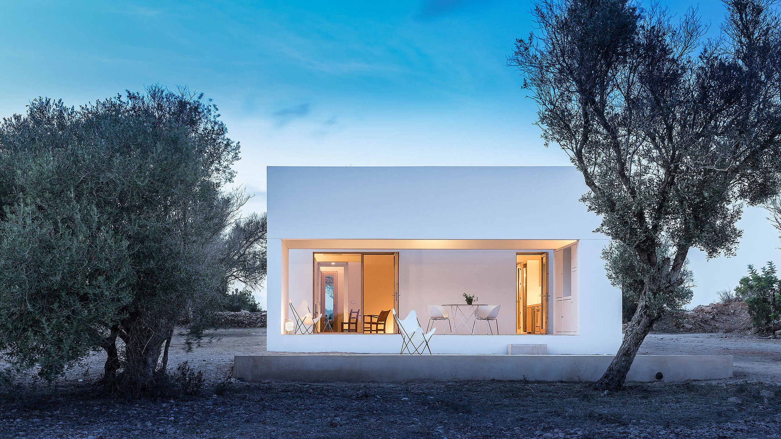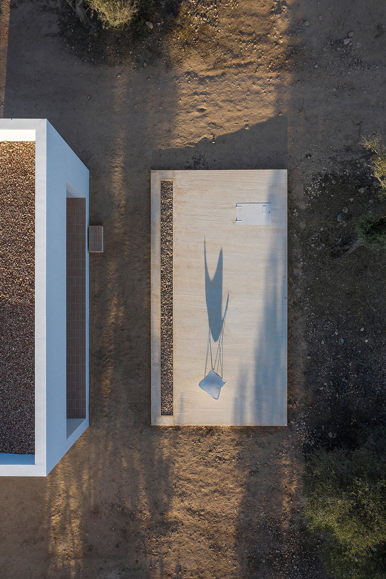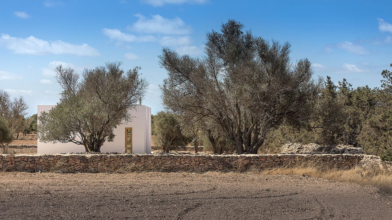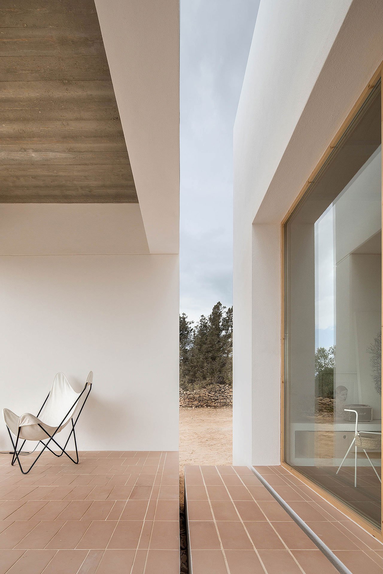Surrounded by wheat and oat fields, traditional dry-stone walls and groves of almond and fig trees, far away from the tourist-filled beaches and whitewashed villages, Castelló took advantage of the rural plot’s tranquil location to design a modest retreat in perfect harmony with the natural landscape. Inspired by the island’s vernacular architecture, the house is a low-key affair that is made up by three closely stacked, whitewashed, cubic volumes. The breakdown of the building mass into three parts neatly divides the interior into private, communal and outdoor areas, whilst allowing natural light and air to filter inside, and ensuring for a minimal visual impact.