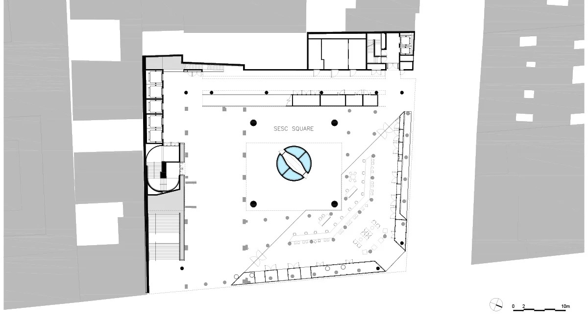 in the bustling urban center of são paulo, on the corner of rua 24 de maio and rua dom josé de barros, a new building provides a wealth of leisure and culture spread across 14 storeys. the project, which has been completed by paulo mendes da rocha and MMBB arquitetos, is the latest destination of SESC — a non-profit brazilian institution that has a variety of outposts across the country. the development, which reuses an existing structure in the city center, includes a rooftop swimming pool and a subterranean theater. other facilities in the building include sports facilities, a library, and even a dental clinic.