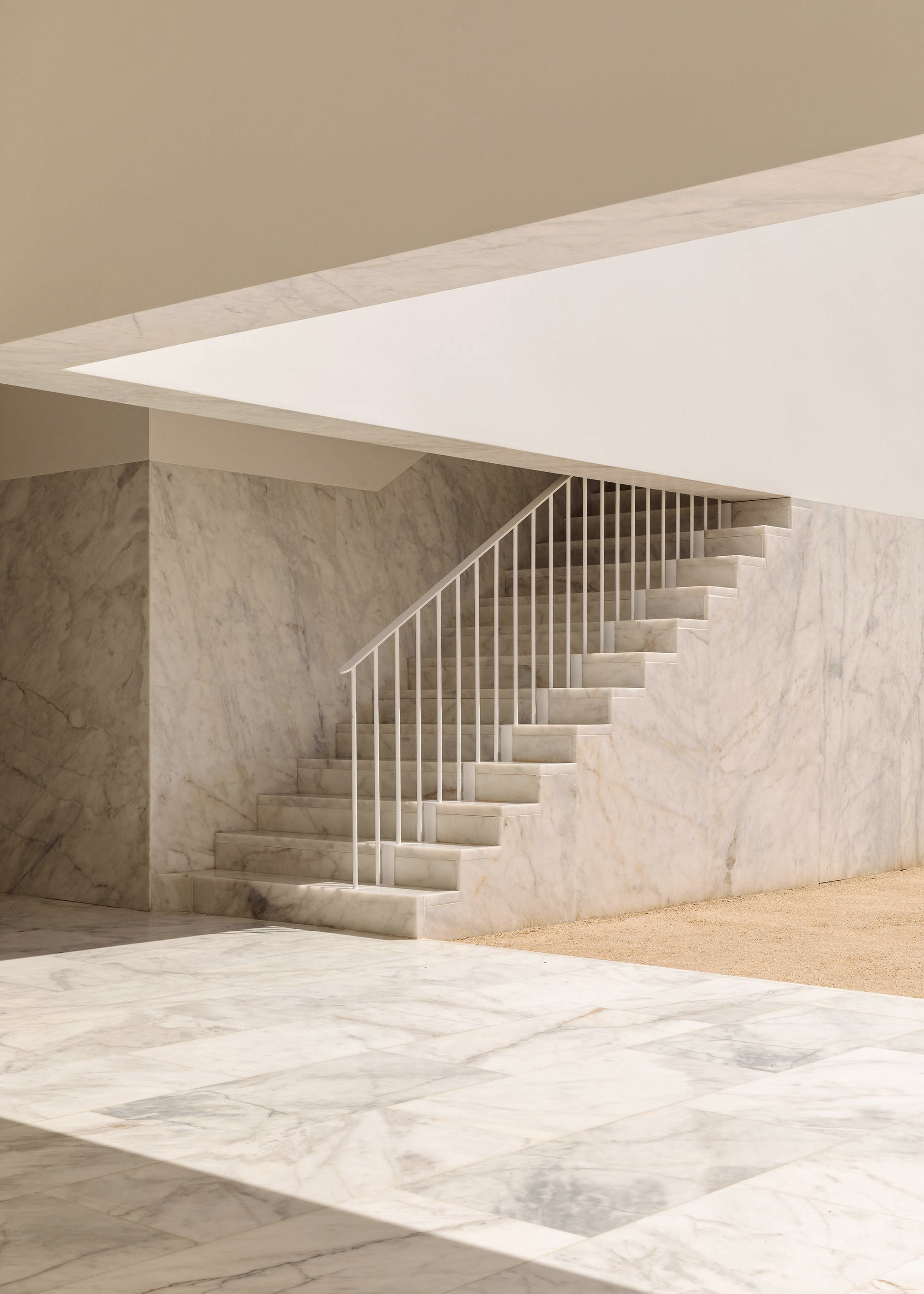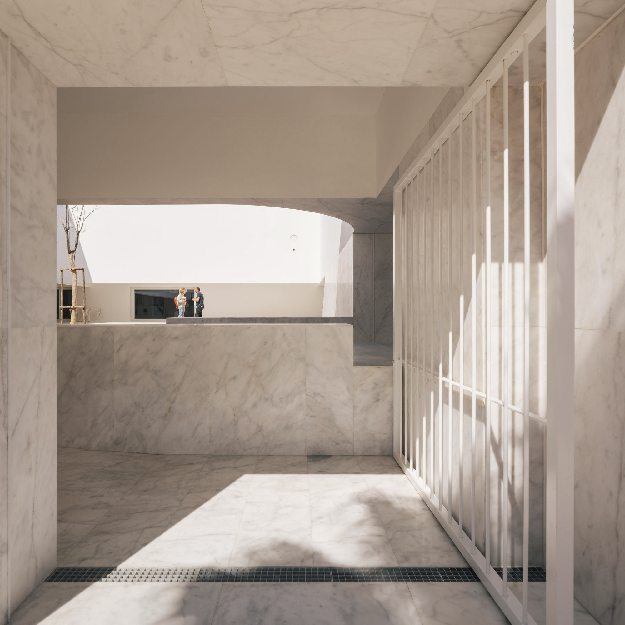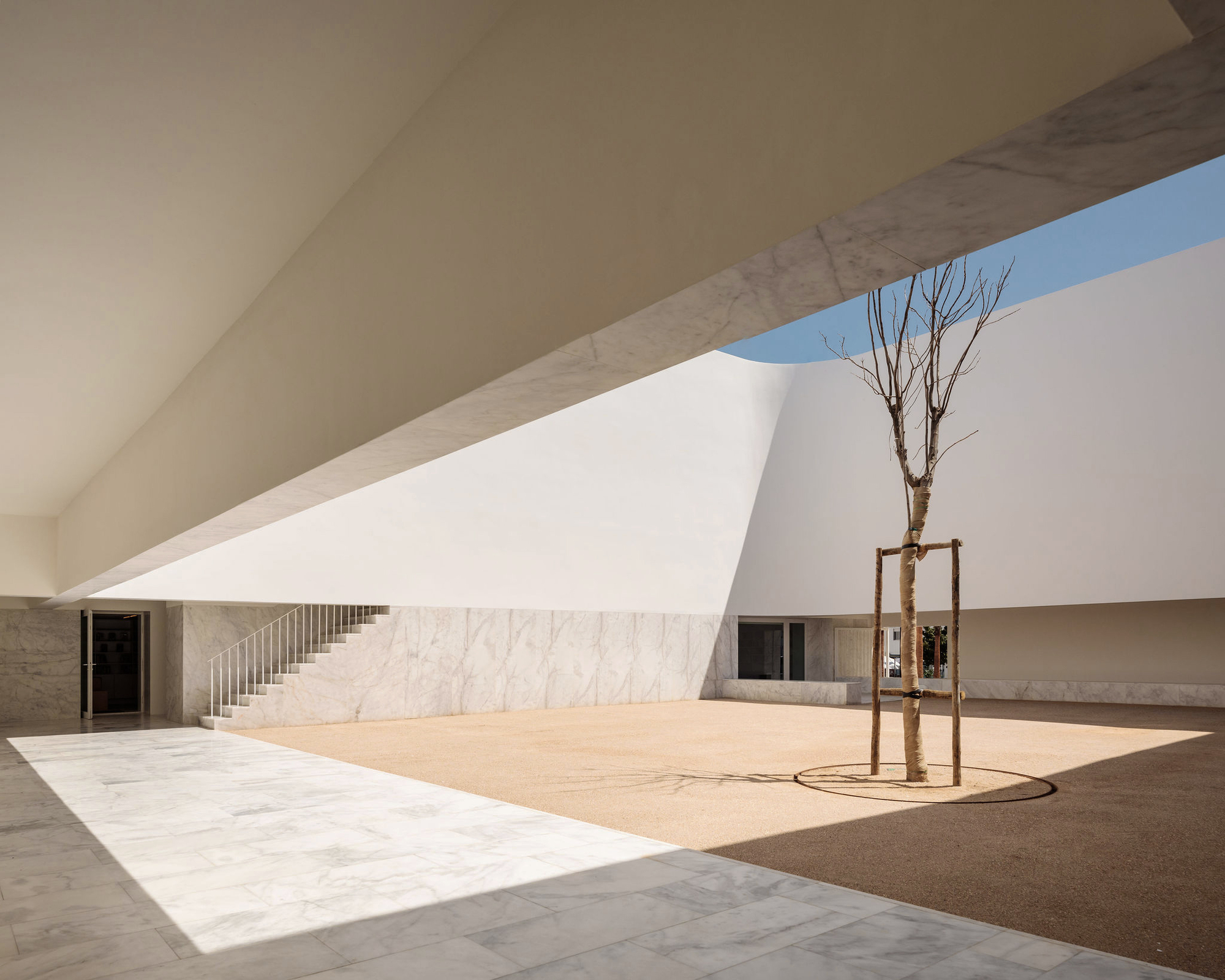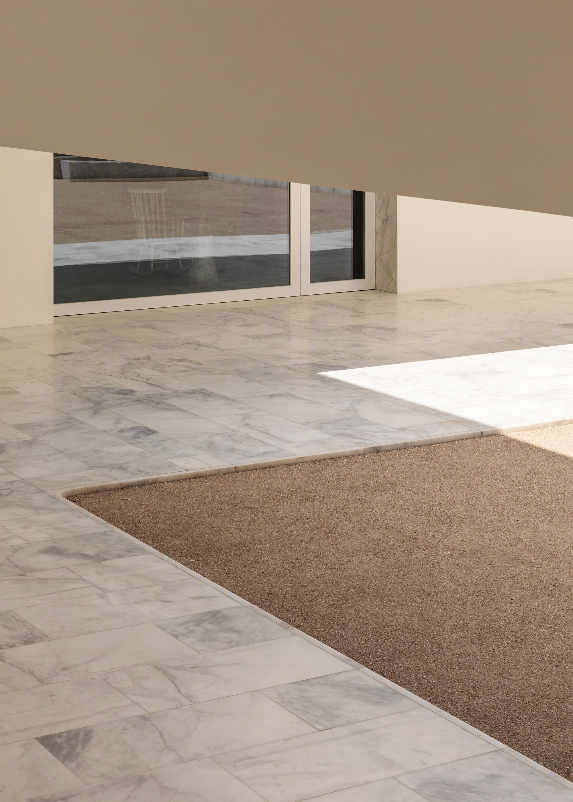 One enters through a cloister, which constitutes the main room of the building and which creates the pause that precedes the function, the moment when the movement soothes down and the noise is replaced by the delicate sound of the running water in the fountain, which marks the arrival. The galleries around the central courtyard generate paths that promote a gradual adjustment of scale, evoking protection and shade, and guiding the way around the gravel court and the jacaranda tree that is planted there.