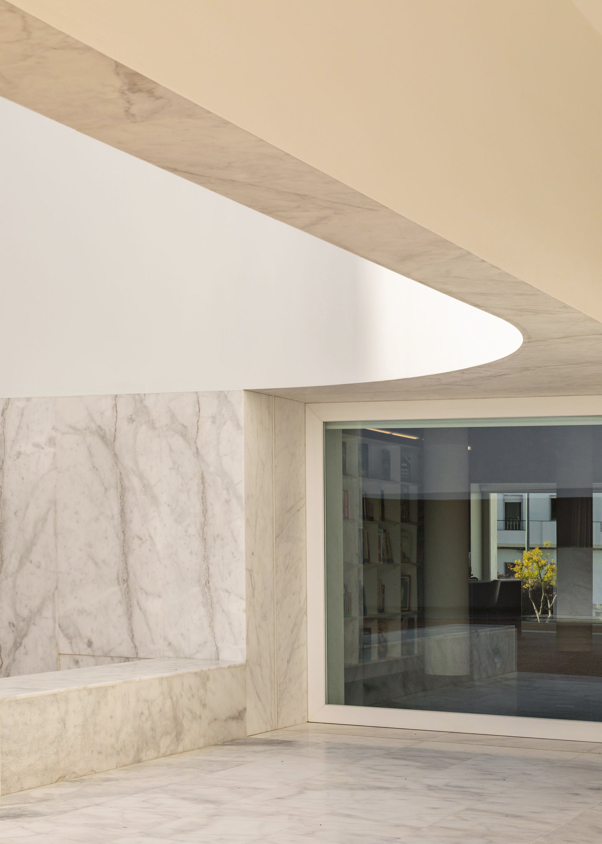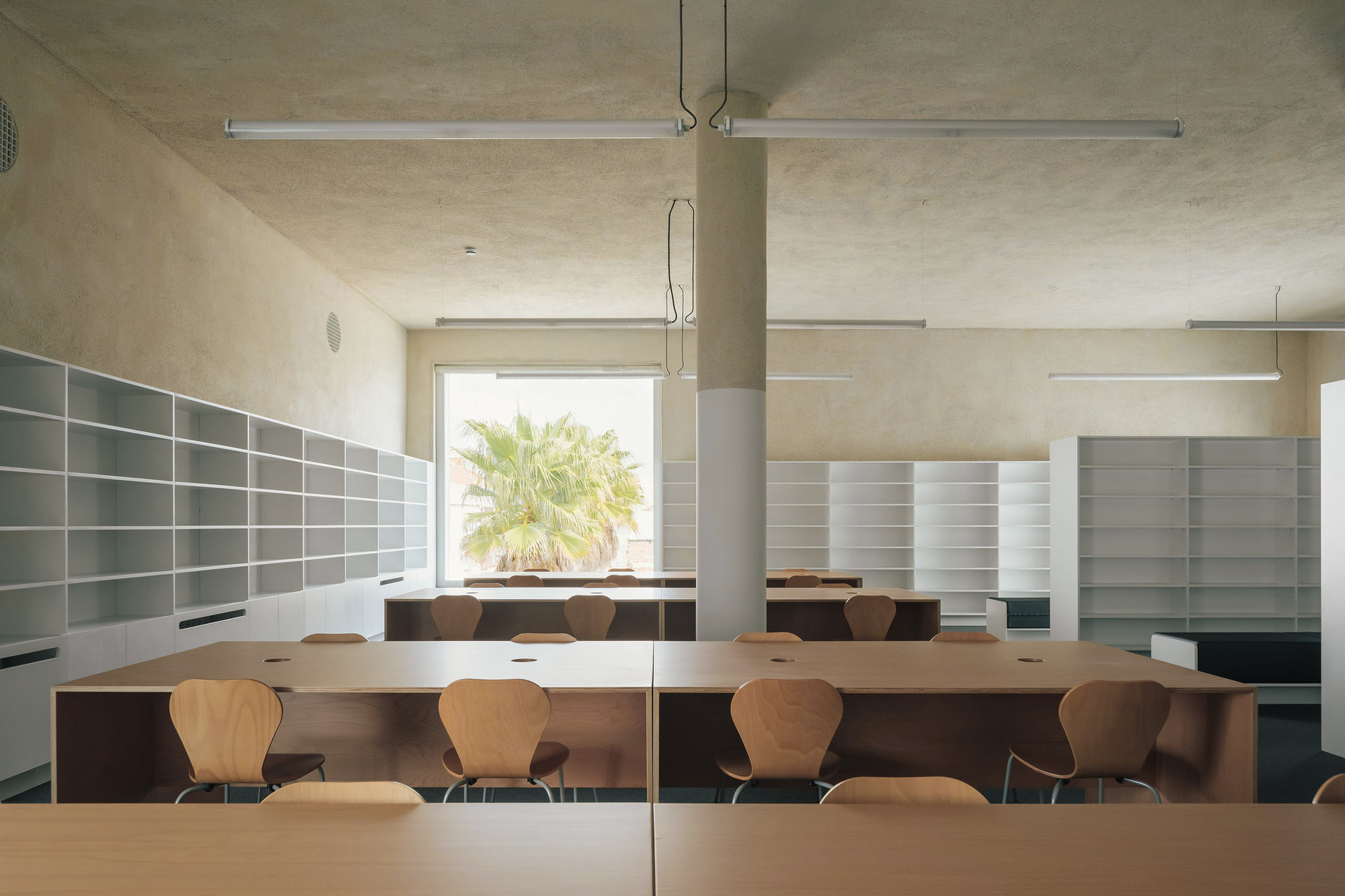 The Grândola’s new Library and Municipal Archive is accessed through the set of palm trees that structure the renovated Praça da República, now purged of all the noisy and conflicting elements, which have been removed from there in search for a more pacified order. This square is the central place of the city and the epicenter between the Municipal Garden, to the southwest, and the Orange tree garden, to the east.