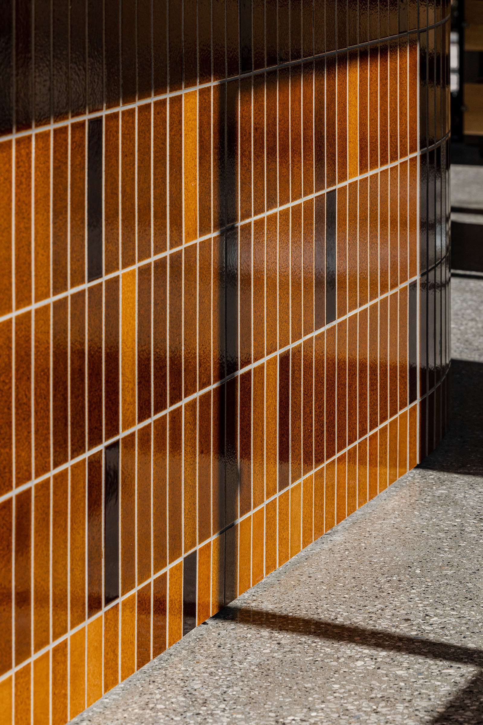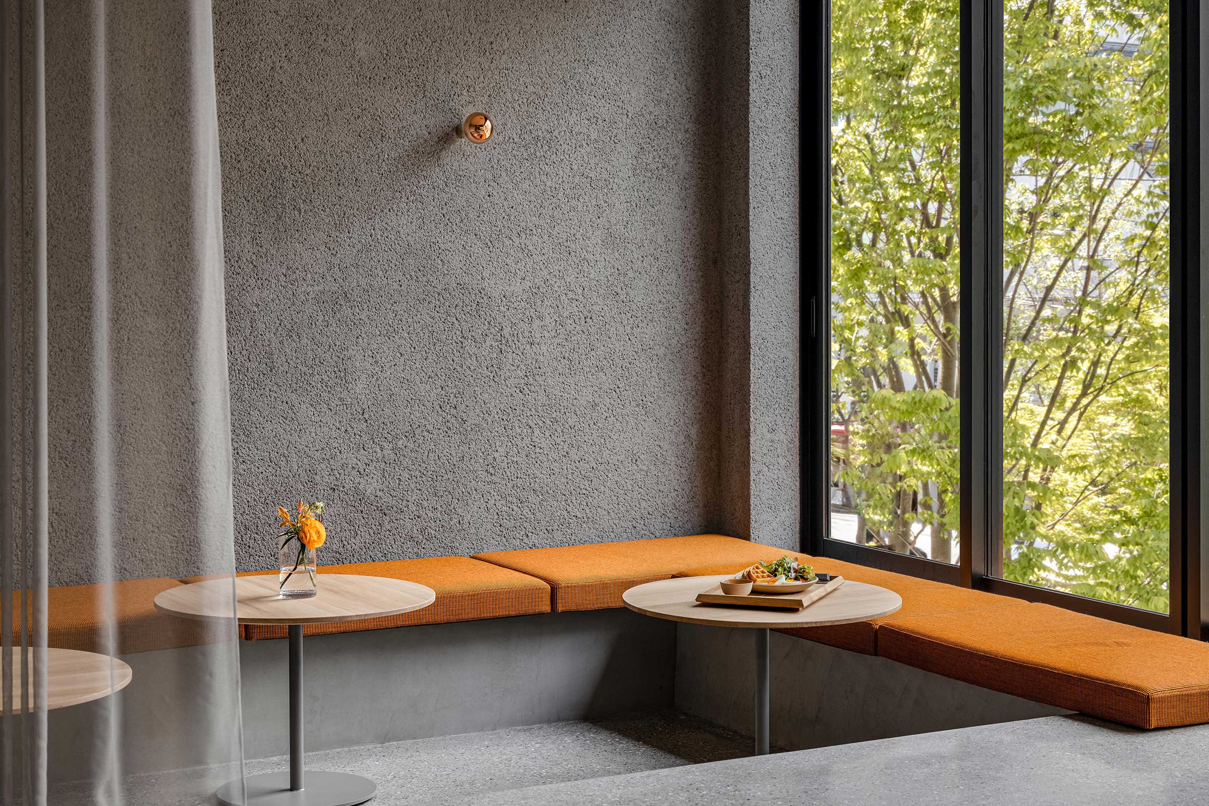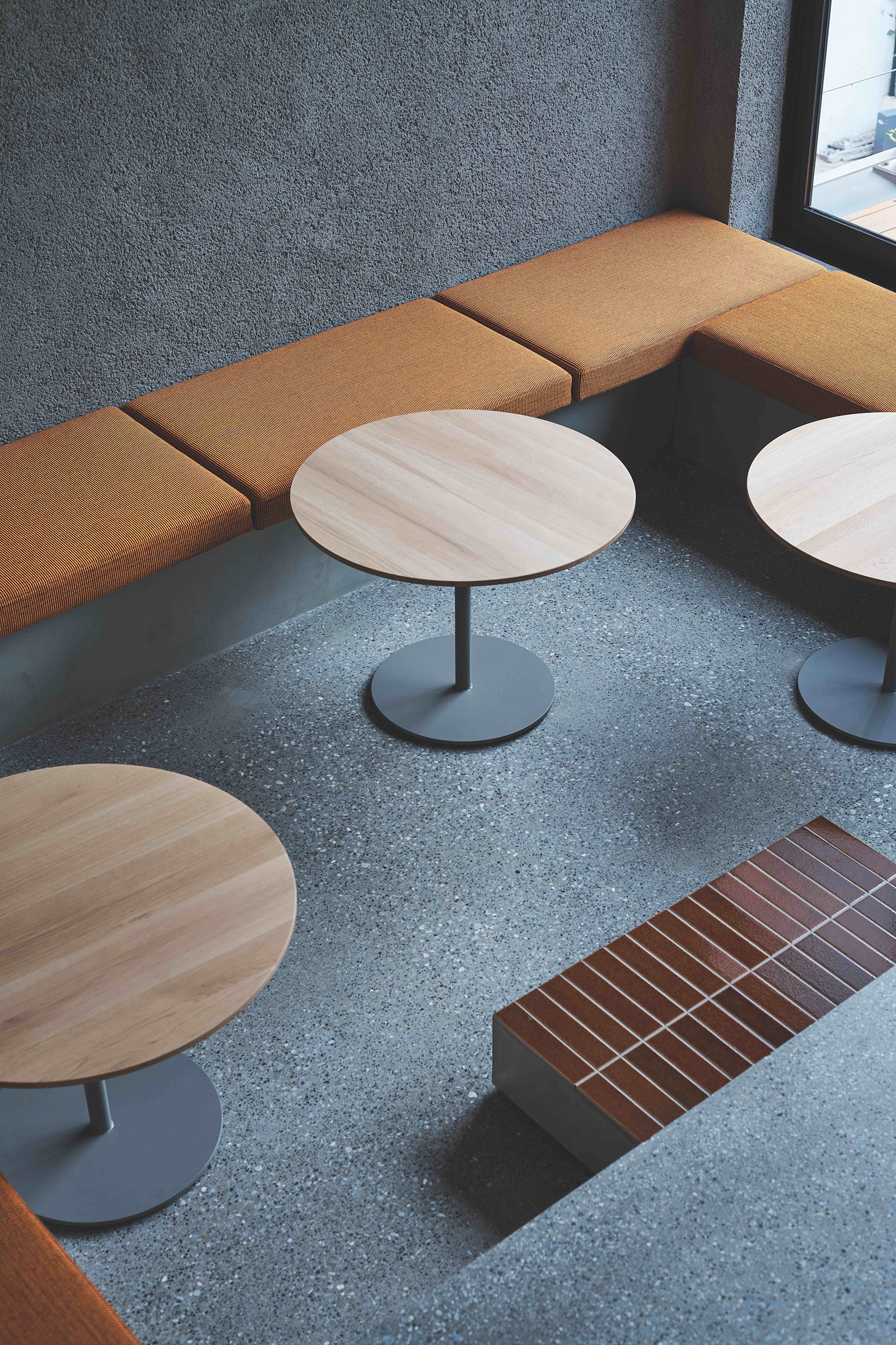 Throughout the cafe, more than 7000 tiles were carefully laid by a single skilled artisan. On the ground floor, the designer placed tables of differing heights –a high counter with stools so that people can watch the barista preparing their coffee, and a lower table for people to enjoy the park from inside. Moving up to the second floor, you will find a variety of seating options designed to suit the needs of different customers. At one end of the space, a lowered floor area with banquette seating (upholstered in an autumnal orange textile) can be separated-off from the main area via a grey, sheer curtain.