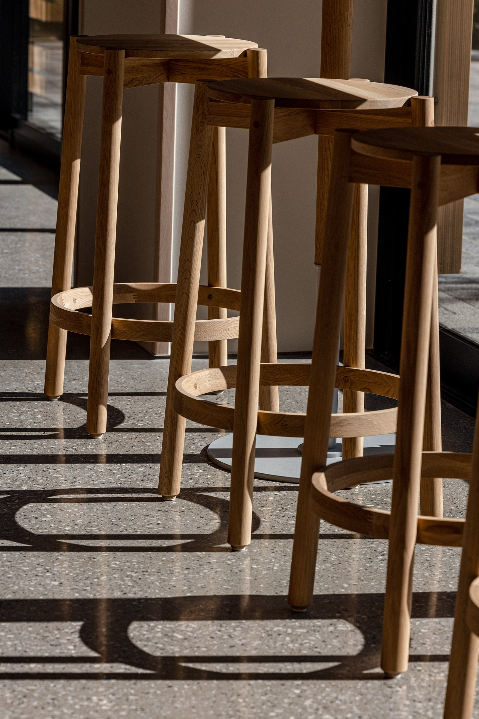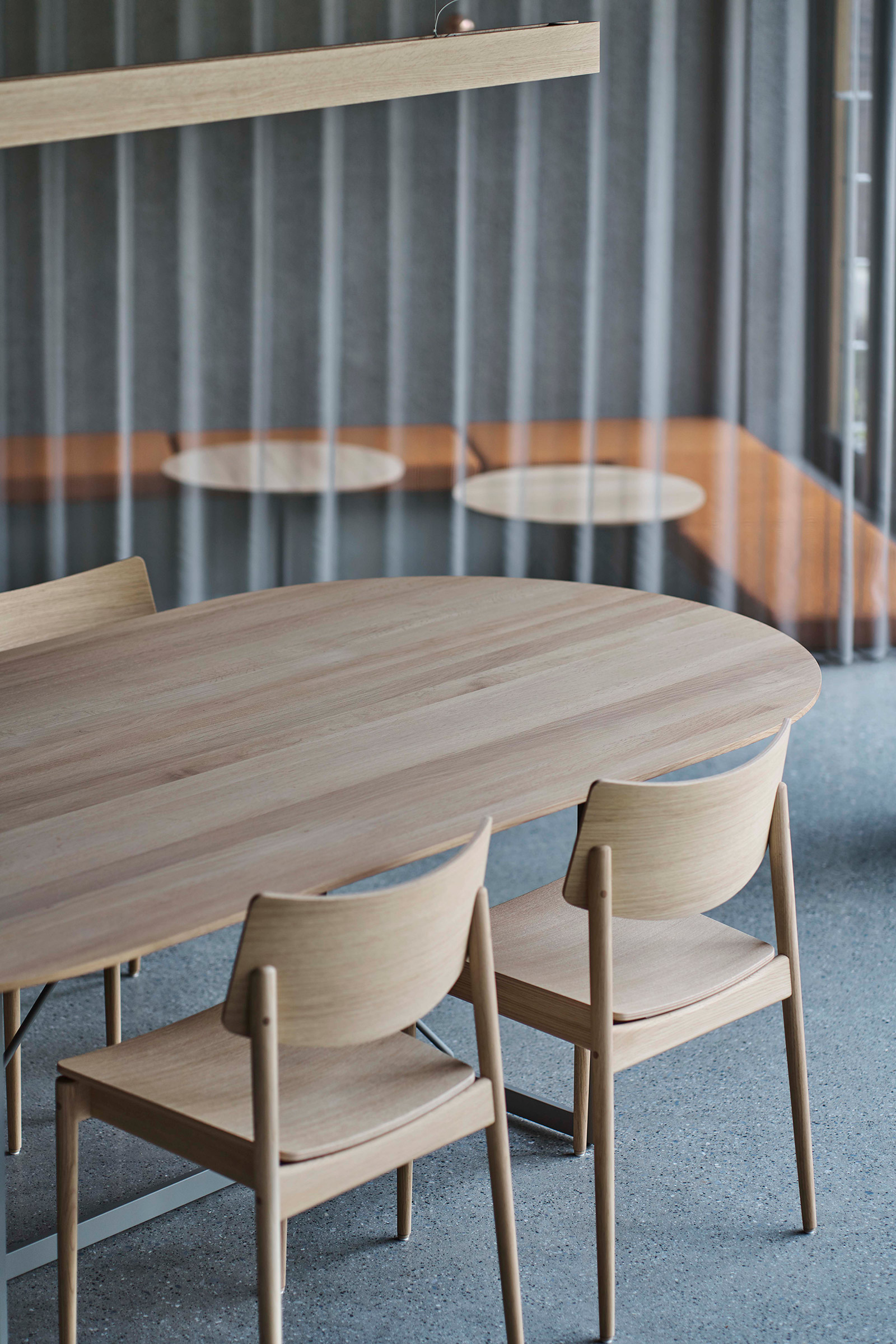 An oval dining table in the center provides a casual, communal atmosphere for sitting around, and a high counter table with a library-like light allows for quiet groups and singles to sit at the rear of the space. At the far end, a low, tiled coffee table is surrounded by comfortable lounge chairs and sofas. In addition to the early morning coffee/food menu, appetizers and natural wine will also be available in the evening. The studio hope that visitors will enjoy the warm atmosphere as if they had been invited to visit the welcoming house of a close friend.