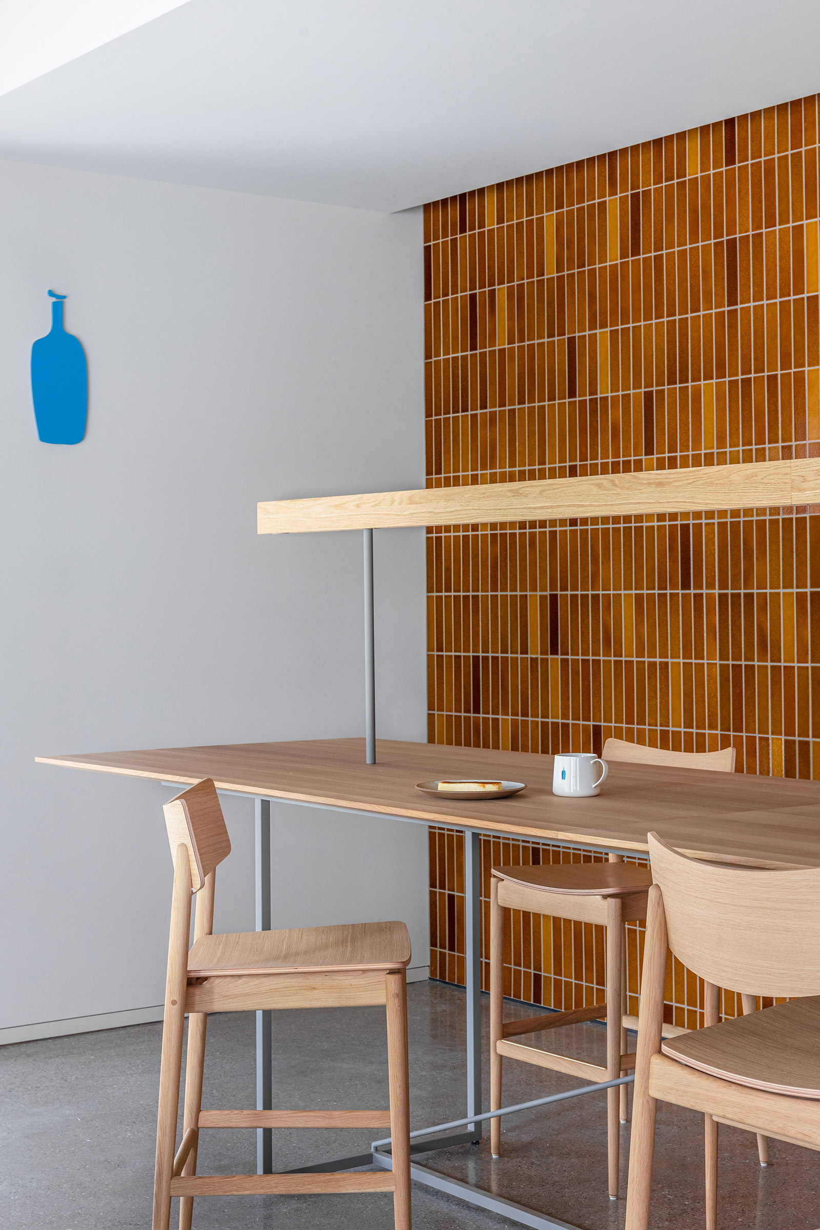 Blue Bottle Coffee Shibuya is a minimal space located in Tokyo, Japan, designed by Keiji Ashizawa Design. The Blue Bottle Coffee Shibuya cafe is located a short walk from the busy atmosphere of the downtown area. Designed as an urban retreat situated between two parks, the interior is the second Blue Bottle Coffee produced by the studio. Walking through Kitaya Park past customers enjoying coffee on Ishinomaki Laboratory’s benches, you first encounter a large, curved tile-counter surrounding the kitchen area. These tiles, with a special volcanic ash glaze, are a key material to connect the interior and exterior and were developed as a collaboration between London material manufacturer, Dzek, and the Amsterdam-based design studio Formafantasma.