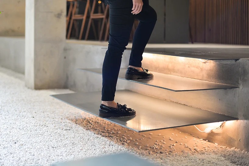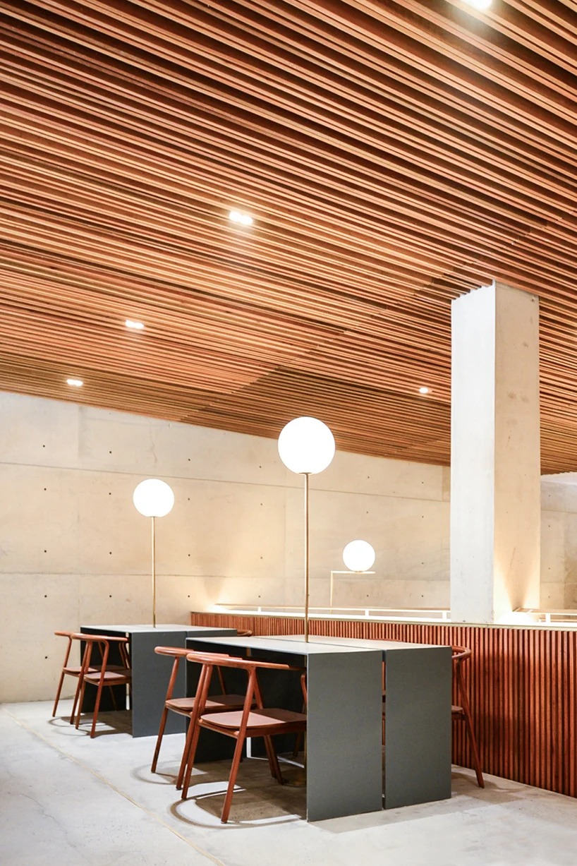 shophouses are commonly bordered by walls in a vertical grid to distinguish one shophouse from the others. the designer transformed the typical zoning of those shophouses into horizontal zoning with different leveling to differentiate each area. the levels consist of the lobby on the first floor, the café on the second floor, and a study place for students on the third floor. to complement the leveling, the ceilings are designed slanted upwards following each level.