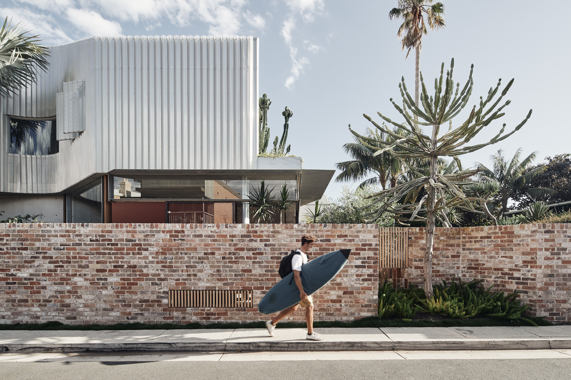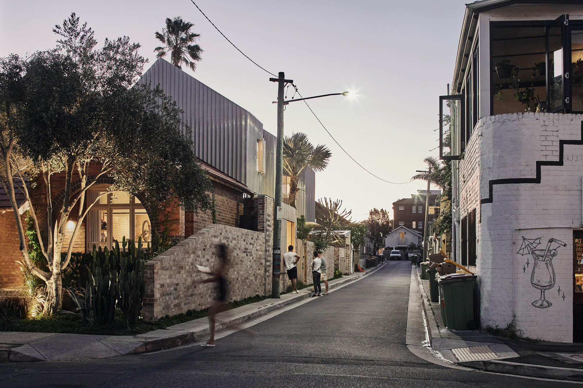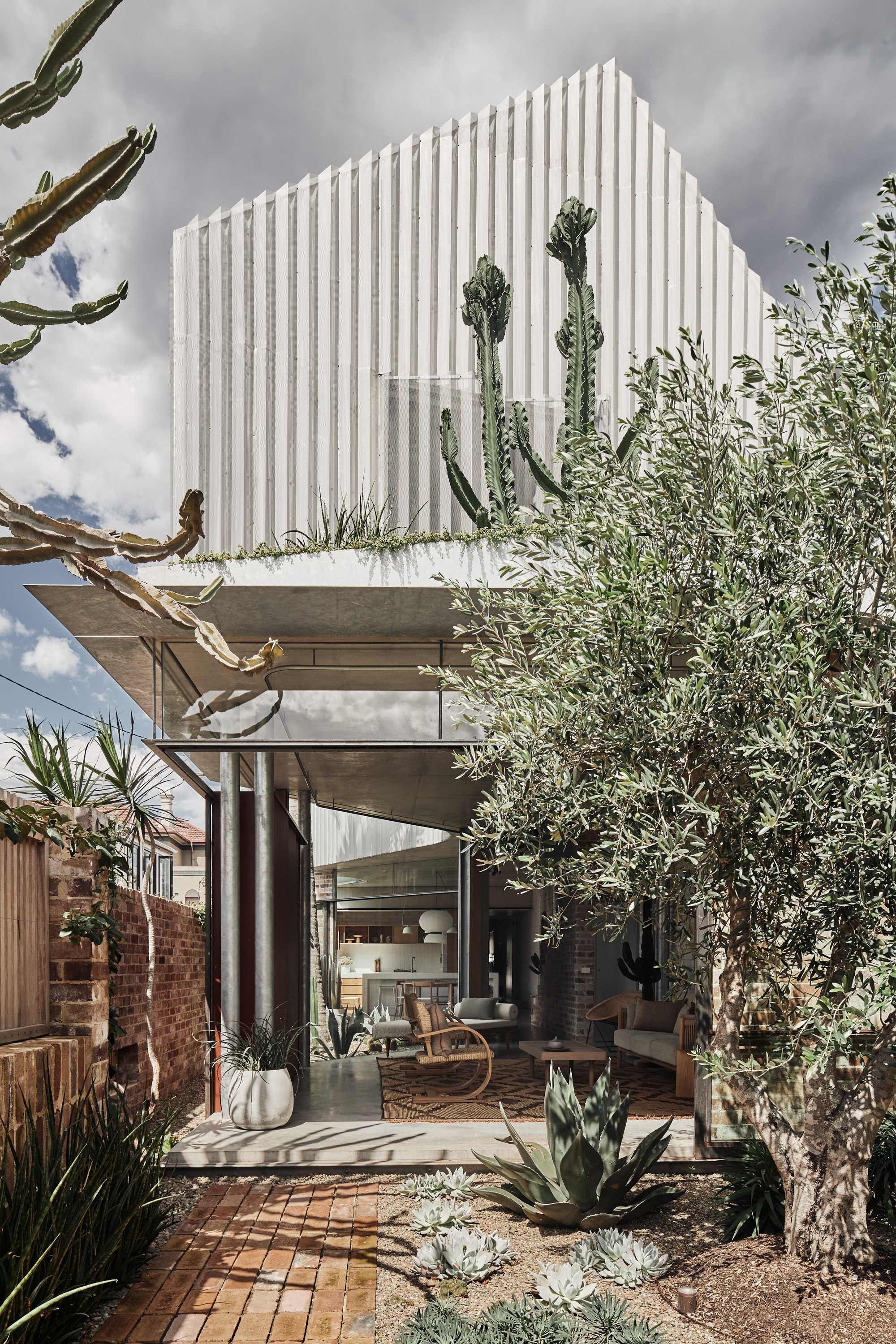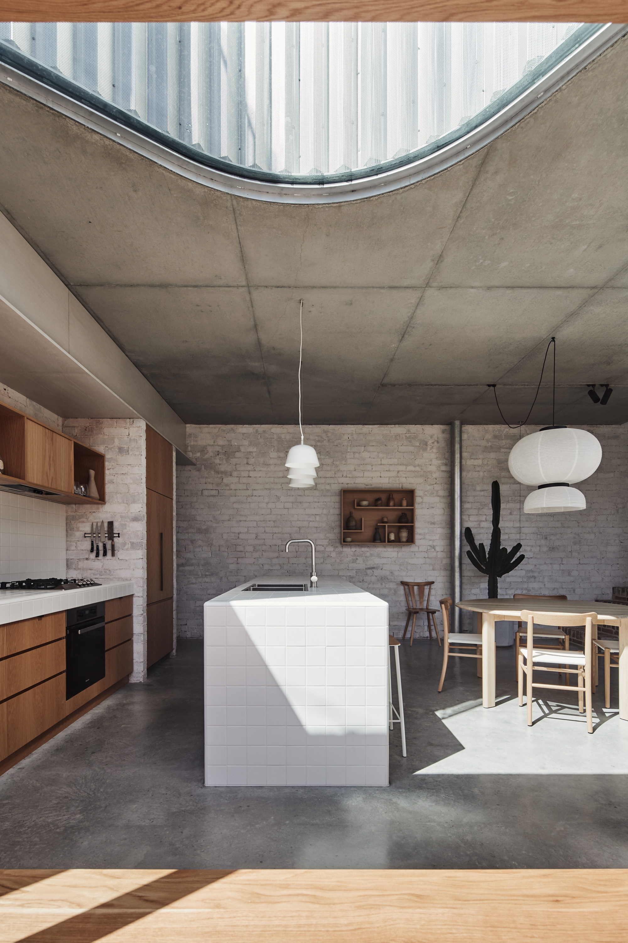 The upper level, containing three bedrooms, is conceived as a solid mass that carves voids for light, creating diagonal and oblique viewing lines along the length of the laneway for the bedrooms, thereby moderating potential privacy loss from the rear facades across the laneway. These scoops of light allow the garden to be continuous along the majority of the site length, with the main scoop shaped around a new Bismarck Palm introduced as part of the garden works.