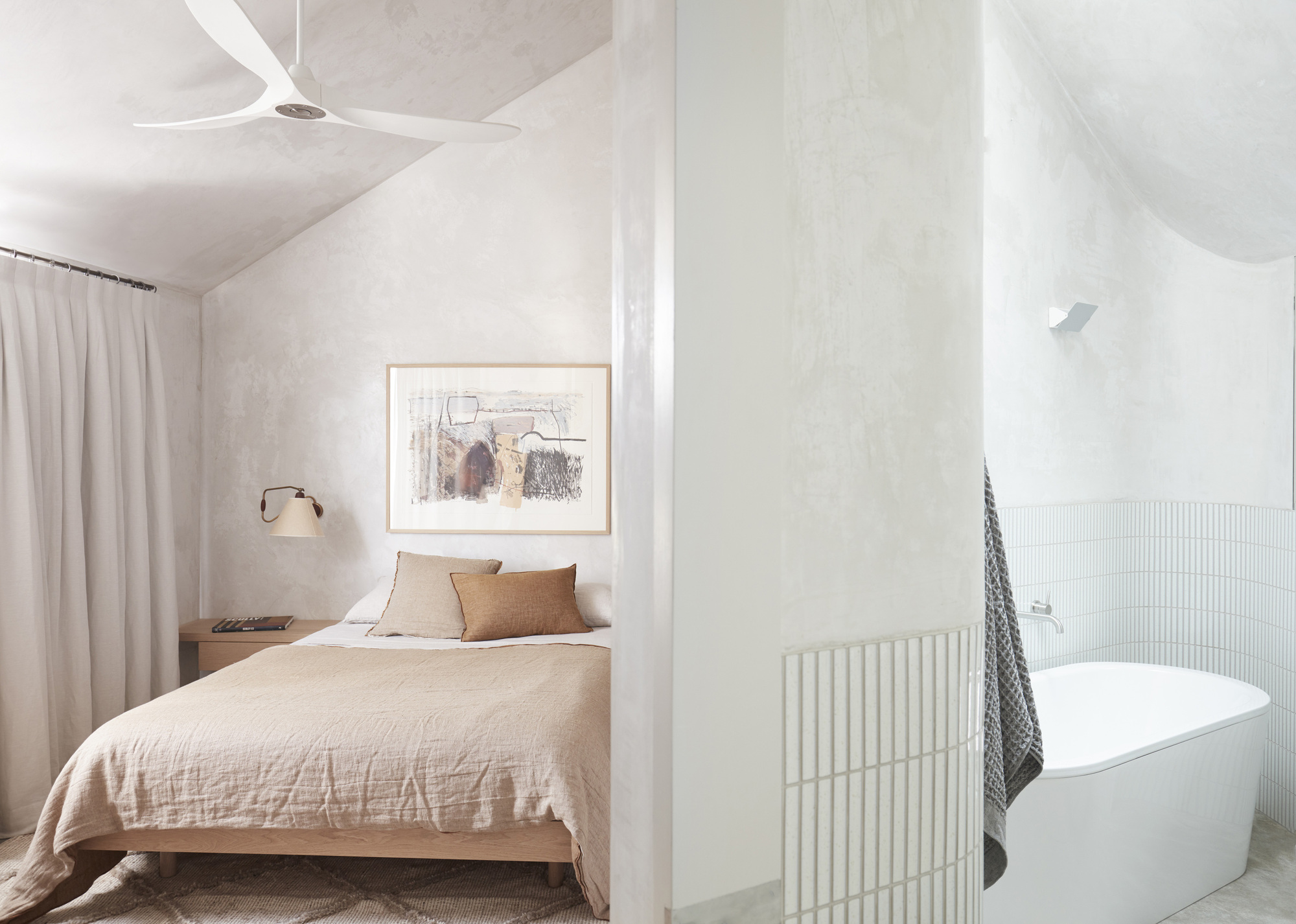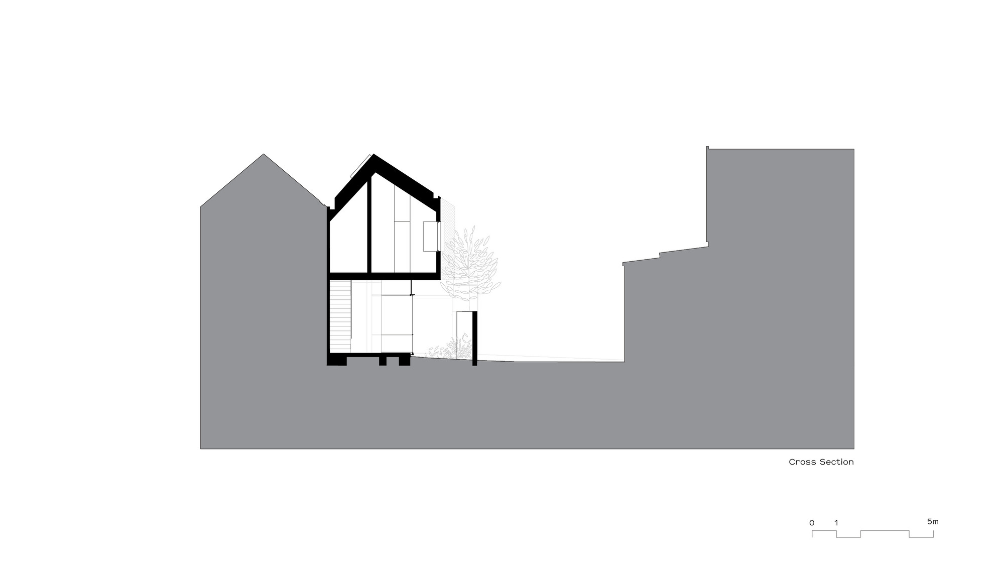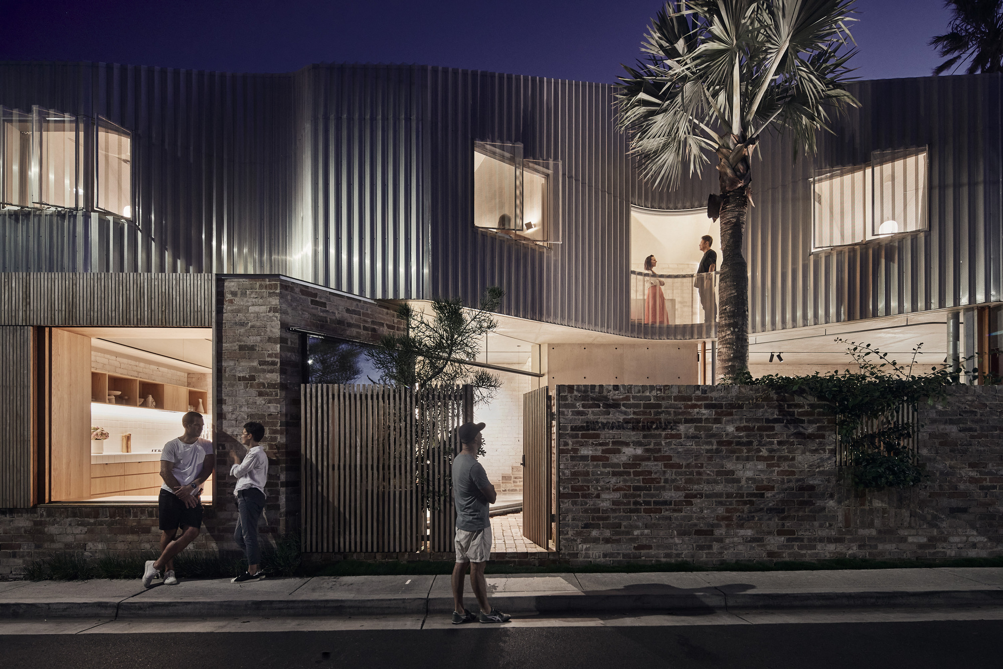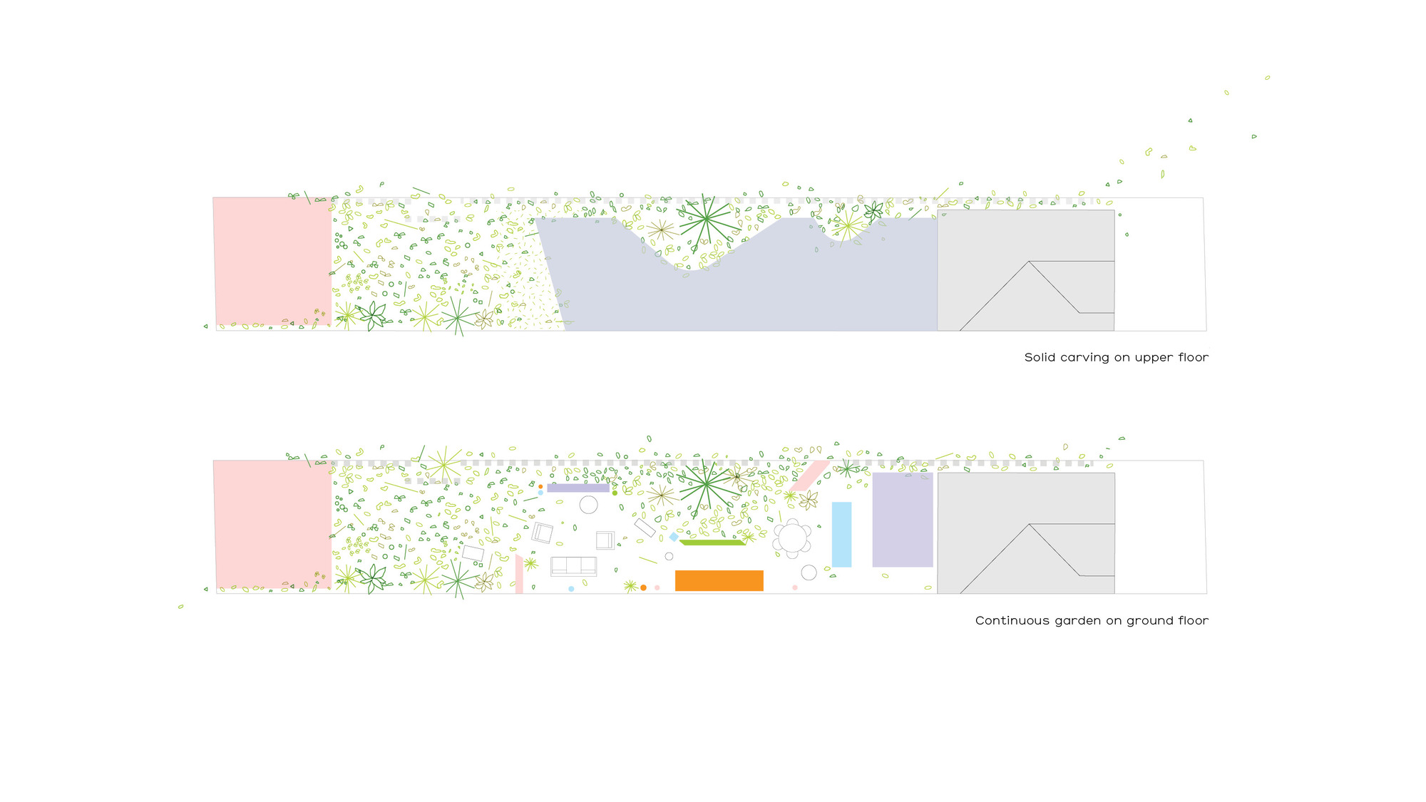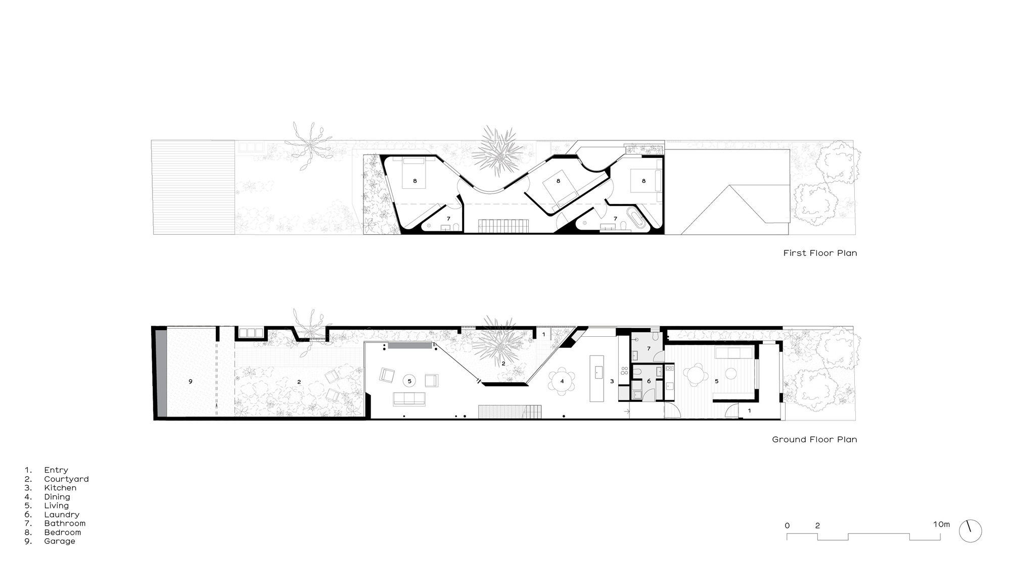 The upper level, containing three bedrooms, is conceived as a solid mass that carves voids for light, creating diagonal and oblique viewing lines along the length of the laneway for the bedrooms, thereby moderating potential privacy loss from the rear facades across the laneway. These scoops of light allow the garden to be continuous along the majority of the site length, with the main scoop shaped around a new Bismarck Palm introduced as part of the garden works.