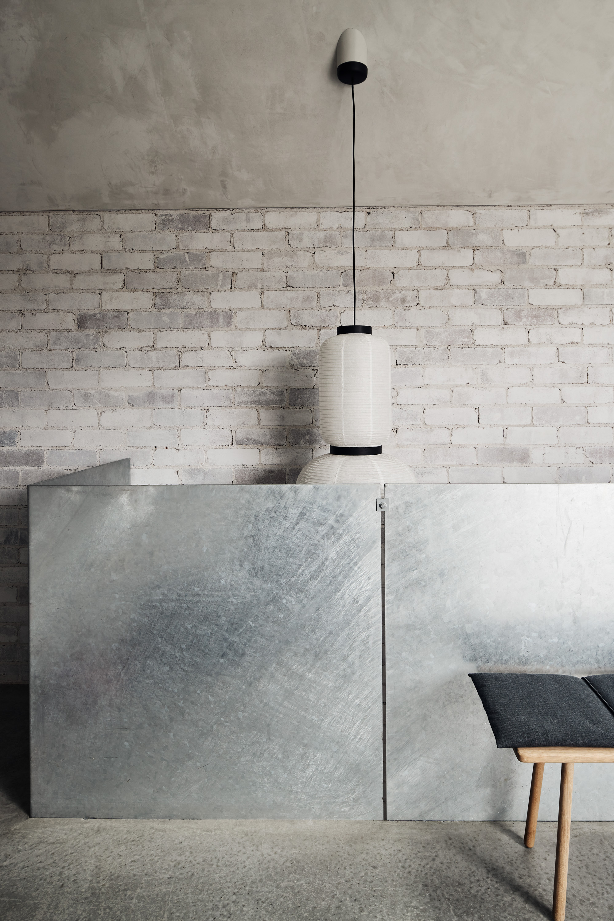 Into this context the ground floor of the house was conceived spatially and materially as a continuous garden between the boundary walls of the site. The brick common wall of the semi to the south was exposed and the new laneway edge to the north was rebuilt using bricks recycled from the site demolition. The garden is formed around key figures within the plan: the kitchen bench, a window seat to the lane, a concrete structural blade wall, a steel cabinet for storage.