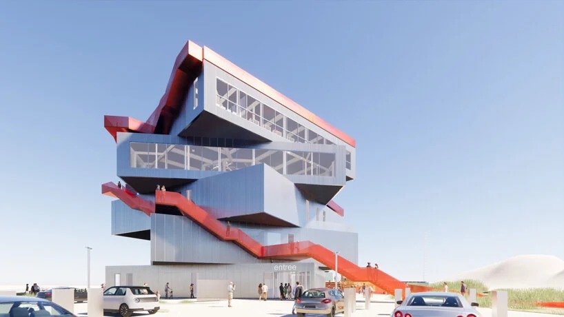 with a design that prioritizes functionality and circularity, MVRDV reveals its scheme for a new exhibition space and visitor centre at rotterdam port in the netherlands. the ‘harbour experience centre’ comprises five stacked and rotated volumes wrapped in external staircases, which take visitors from the ground all the way to a rooftop terrace. the eye-catching building will be constructed from reclaimed and recycled materials, and the structure itself is designed to be easily disassembled and reused.