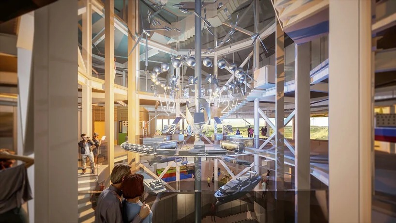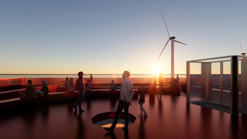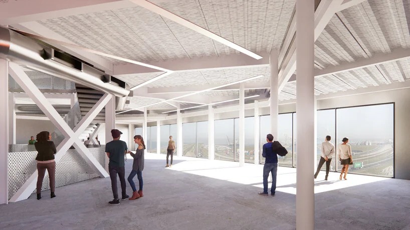 the harbour experience centre will replace an existing information centre called ‘futureland’. MVRDV‘s new intervention will provide a larger, permanent exhibition where people can learn about europe’s largest port. it also boasts a more prominent location than its predecessor at the harbour’s western-most point. with its tall, stacked structure, the centre is imagined as a beacon against the flat landscape.