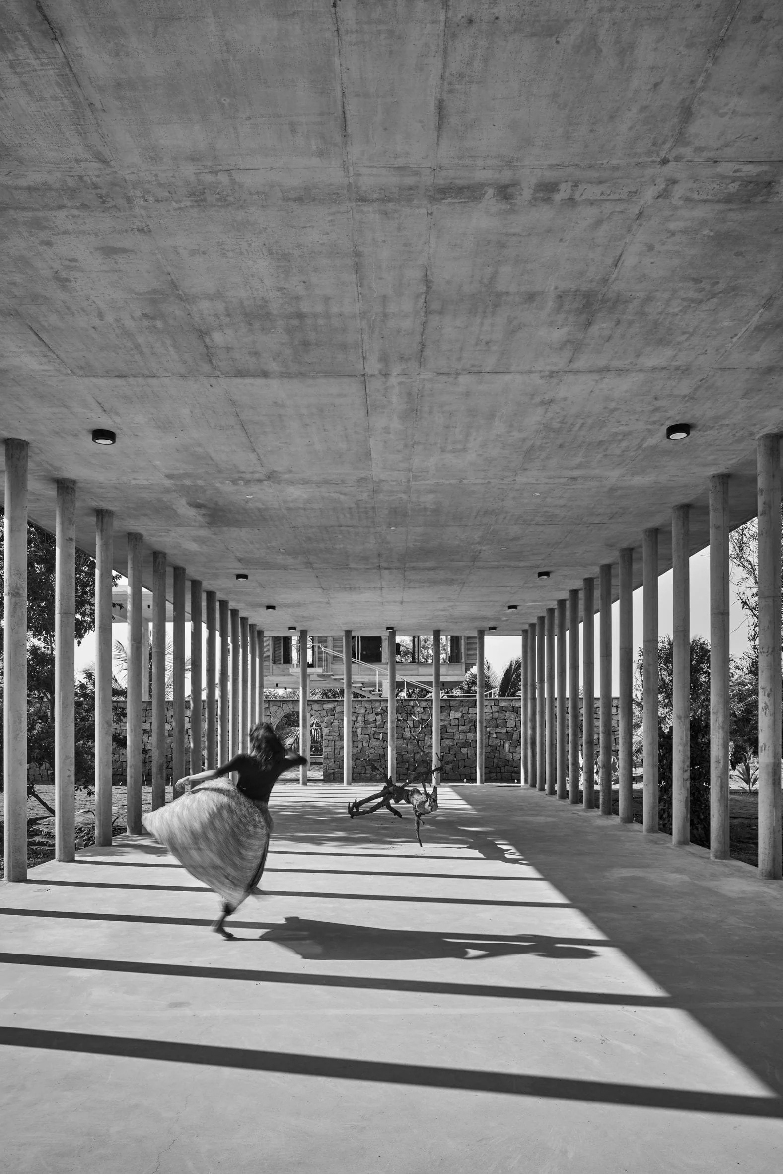 "The unbounded spatial configuration is consciously kept devoid of unwanted wall envelopes," they said, "for experiencing the natural elements like the refreshing monsoons, the warmth of the morning sunlight, birds chirping and the aroma of the flora sprinkled all over the site."