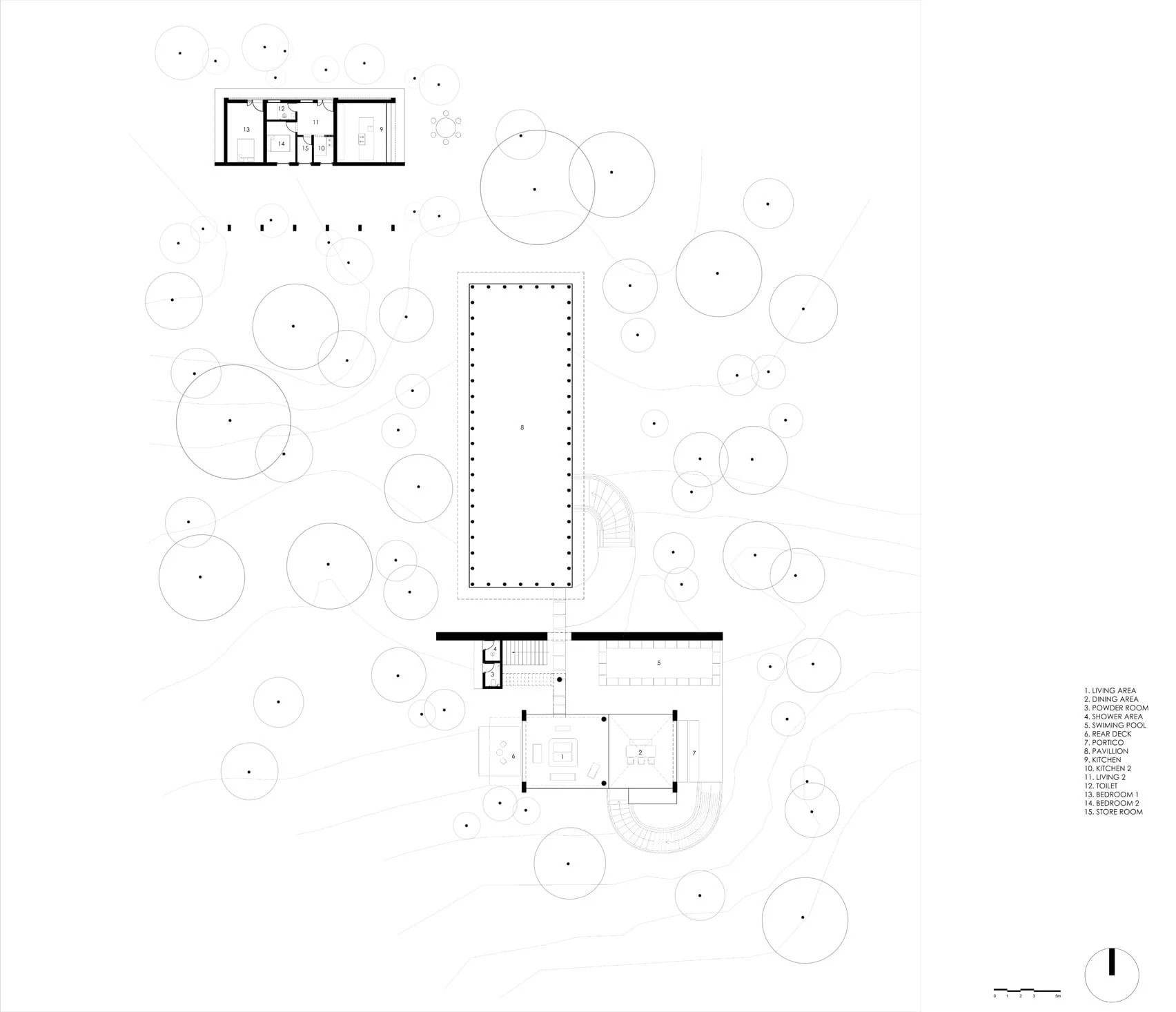 덥고 습한 열대기후 속에 건축은 직사광선을 피할 수 있는 차양 및 공간과 자연환기를 통해 내부 온도를 조절하는 열린 공간을 계획합니다. 콘크리트를 구조 바탕으로 우드재질의 마감재가 편안한 거주공간을 만들어 냅니다. 수평요소인 바닥 및 지붕과 수직요소인 기둥은 단순하면서도 직설적으로 구조화 되어, 미니멀 건축의 모습을 그립니다.