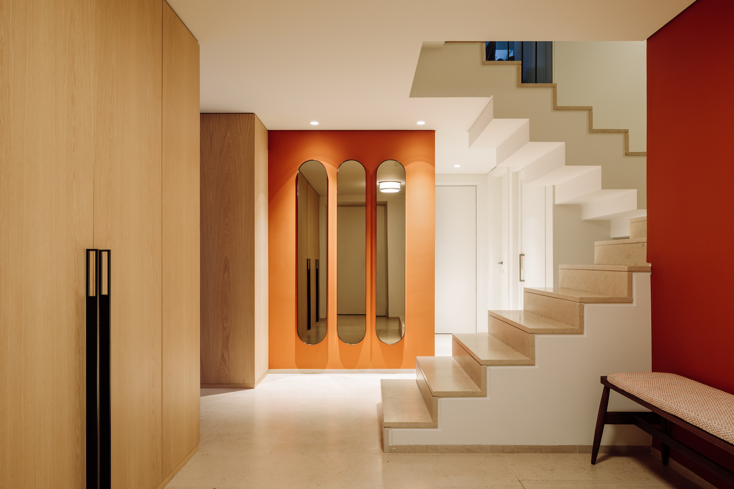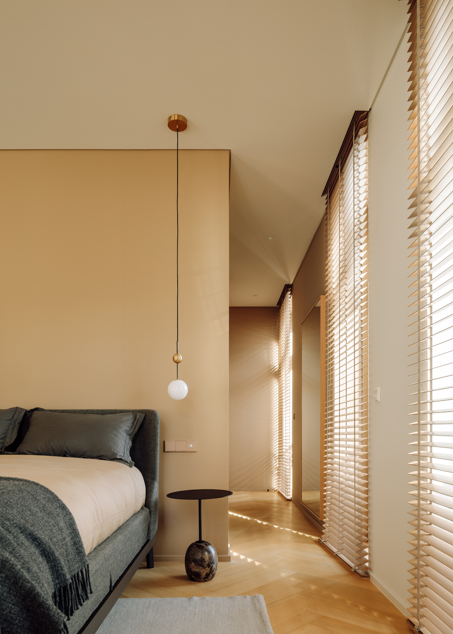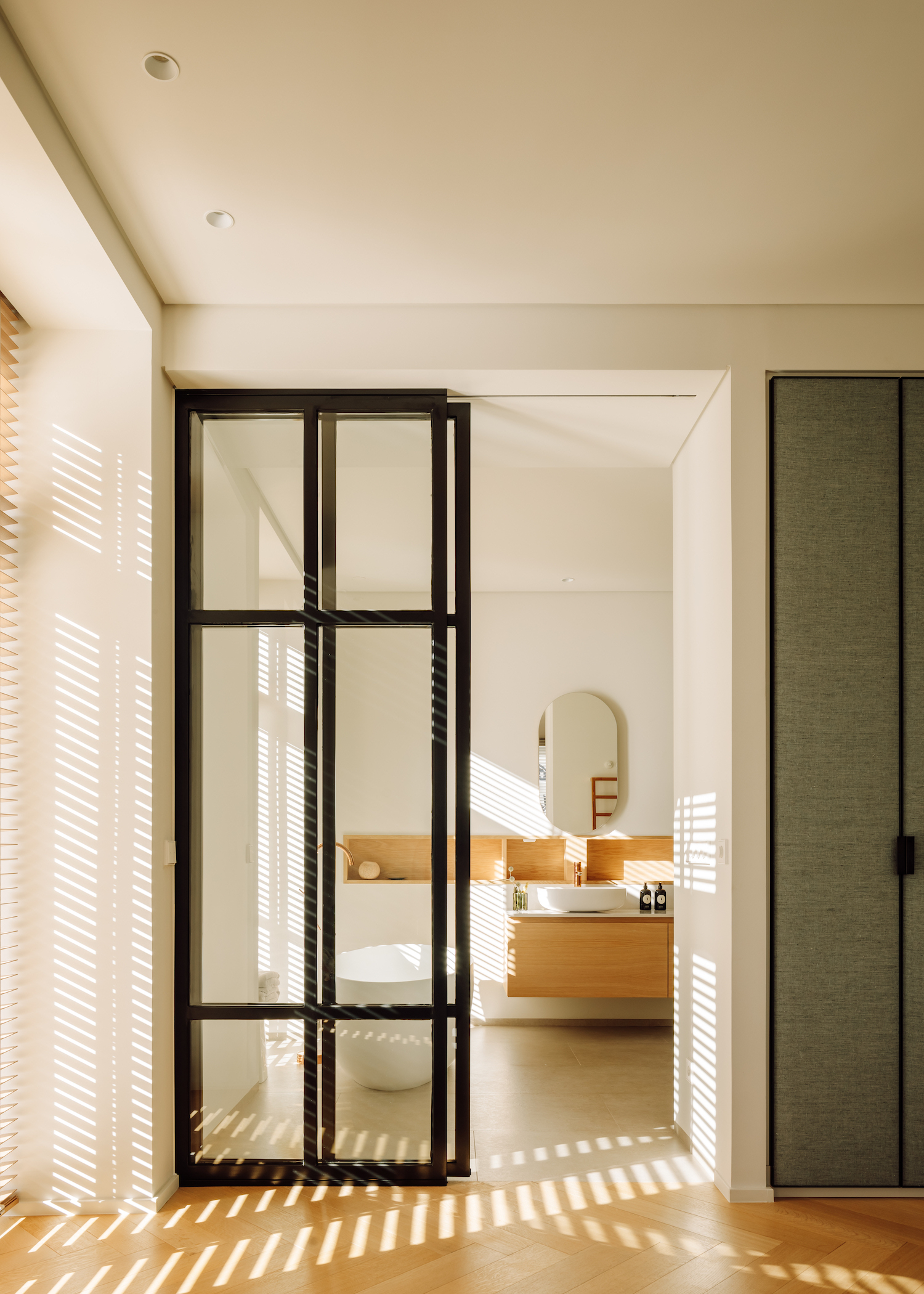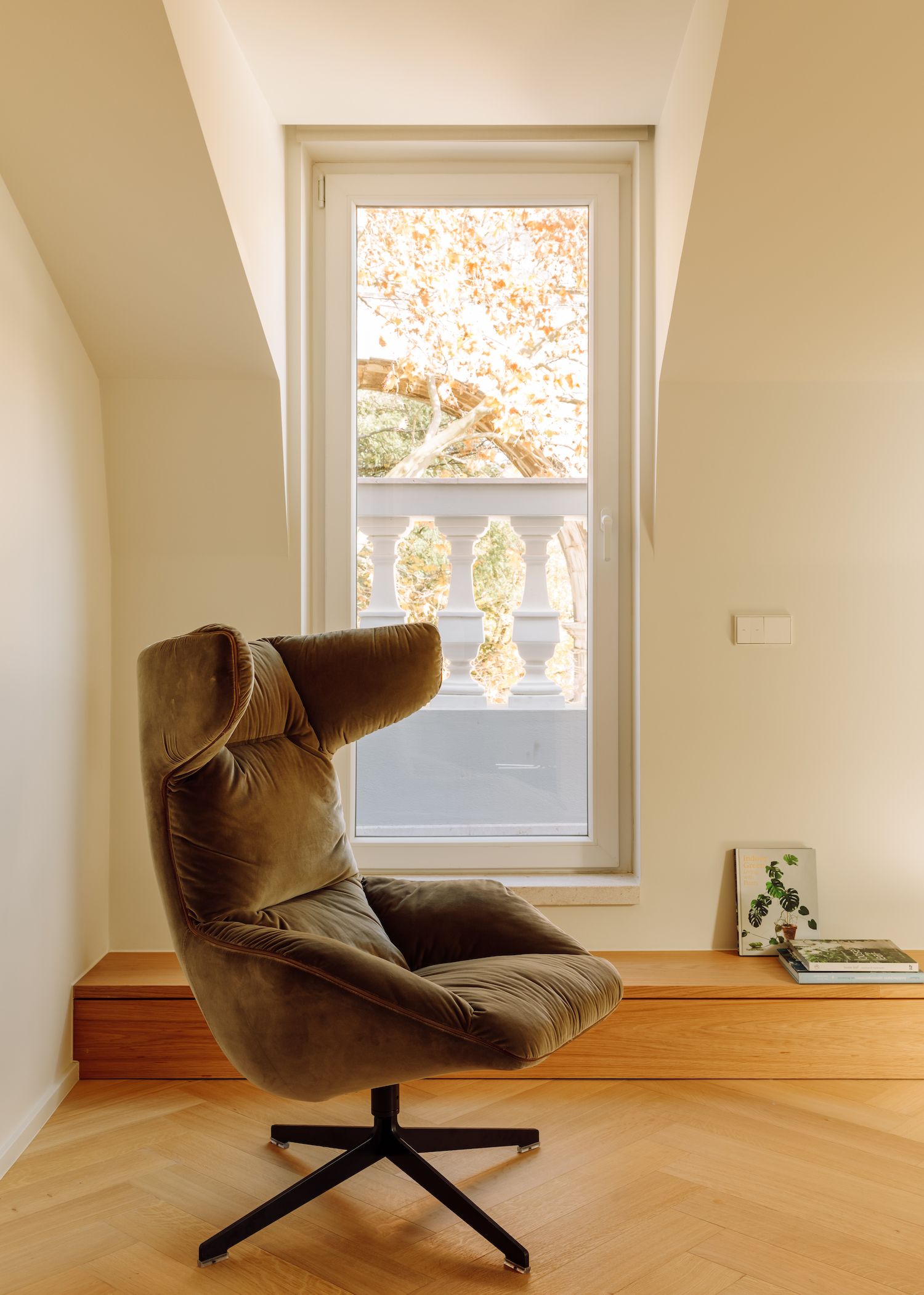 The house has large windows on three sides and is nicely isolated from the exterior with refined Venetian wooden blinds which con- tribute to create a soft and calm atmosphere. The general color palette of neutral beige-grey tones is punctuated with some touches of accent colors.The XIX century old house had to be renovated into a contemporary space but with traditional architectural Portuguese elements such as the large stone window frames, the decorative metal work balconies and the carved wooden entry door.