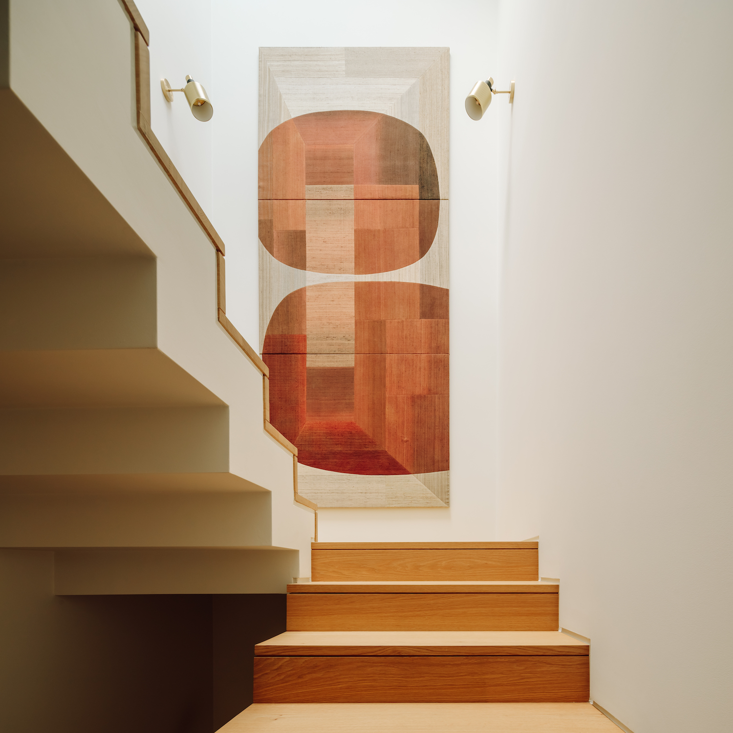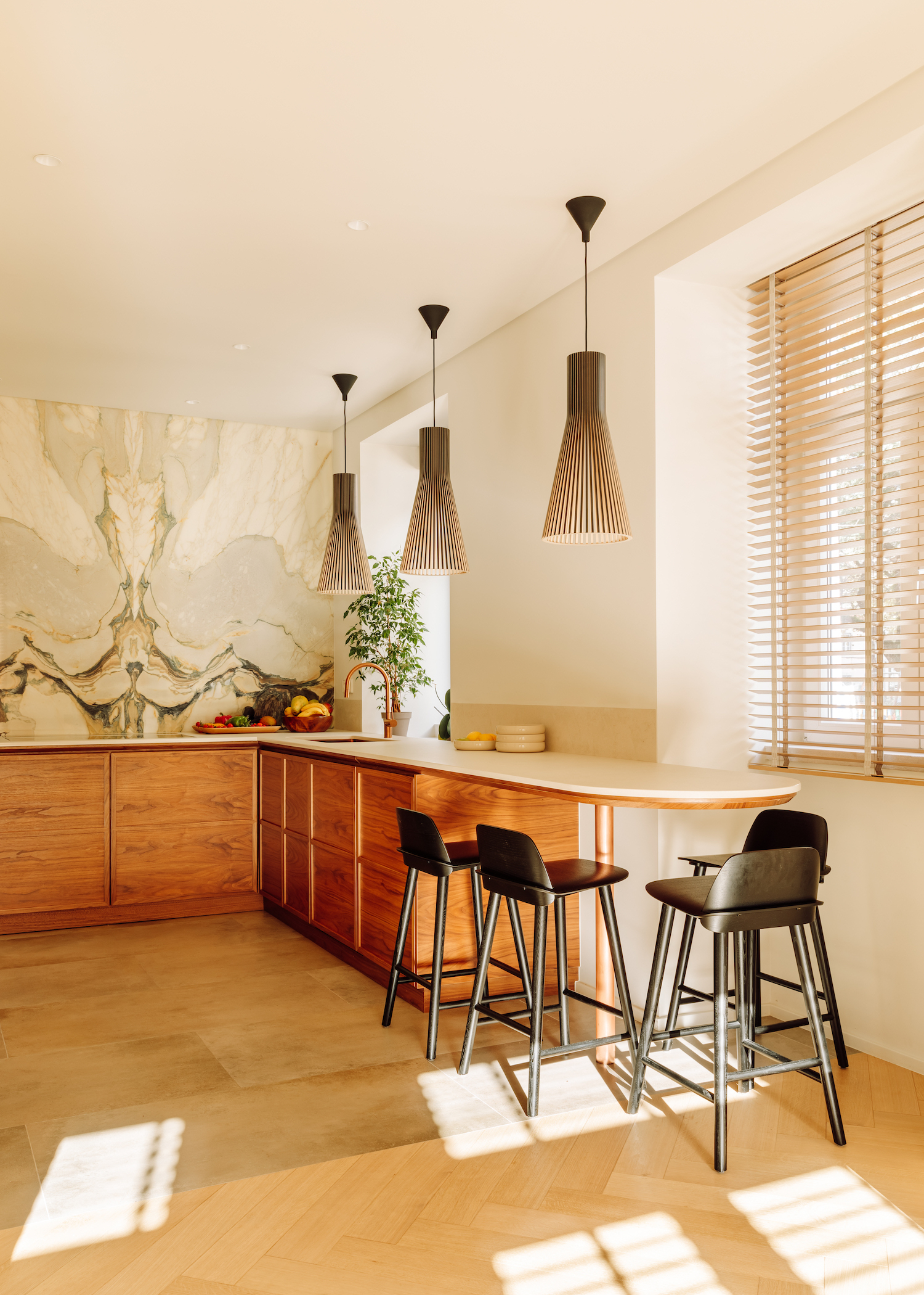 Jardim das Amoreiras House is a minimal home located in Lisbon, Portugal, designed by Maison Amarande. Maison Amarande restored this 19th century four storeys house into a contemporary style home articulated around a minimal stone and wooden central stairs. The use of warm and natural materials such as stunning marble pieces for the kitchen splash back, a beautiful natural oak wooden floor with chevron pattern results into a very sleek space. The house has been entirely furnished with new pieces sourced from exclusive design companies and completed with a few pieces of commissioned artworks thanks to a close collaboration with international artists.